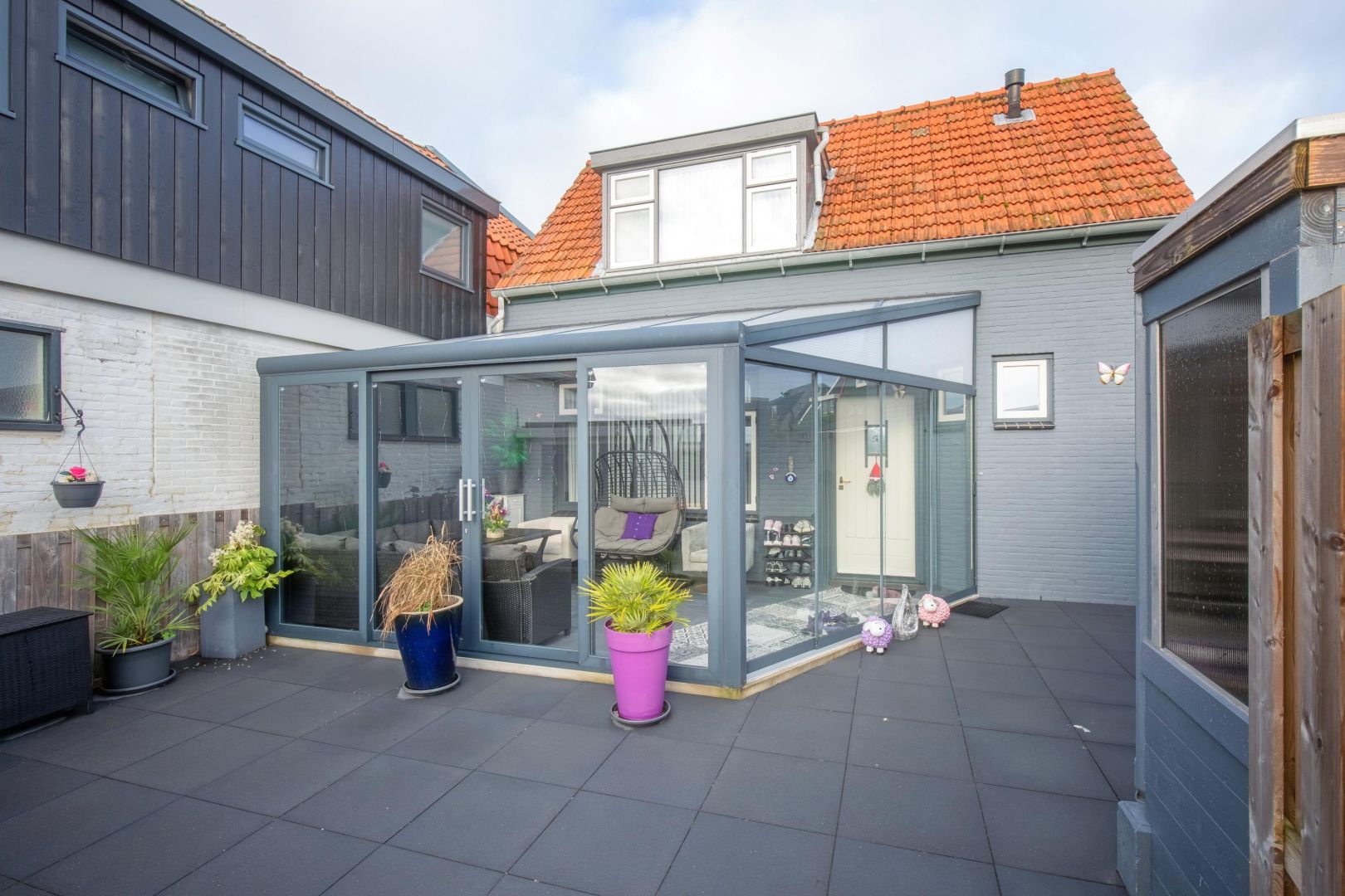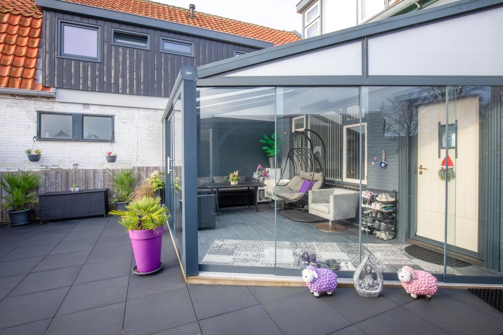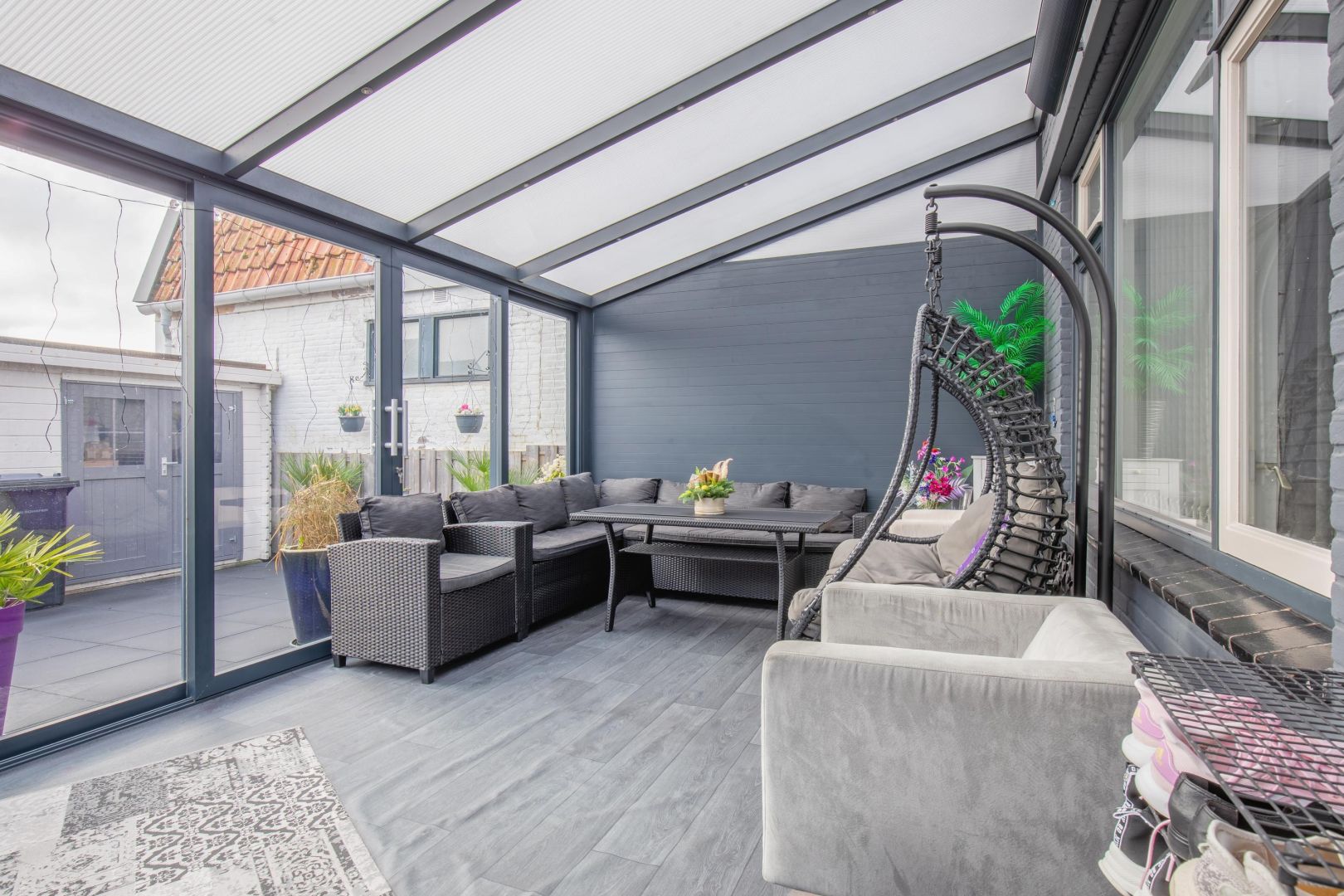 Aan de voorzijde van de woning is een ruime serre aangebouwd, die uitstekend kan dienen als tweede woonkamer. De ramen en deuren aan de zijkant kunnen vrijwel volledig worden geopend.