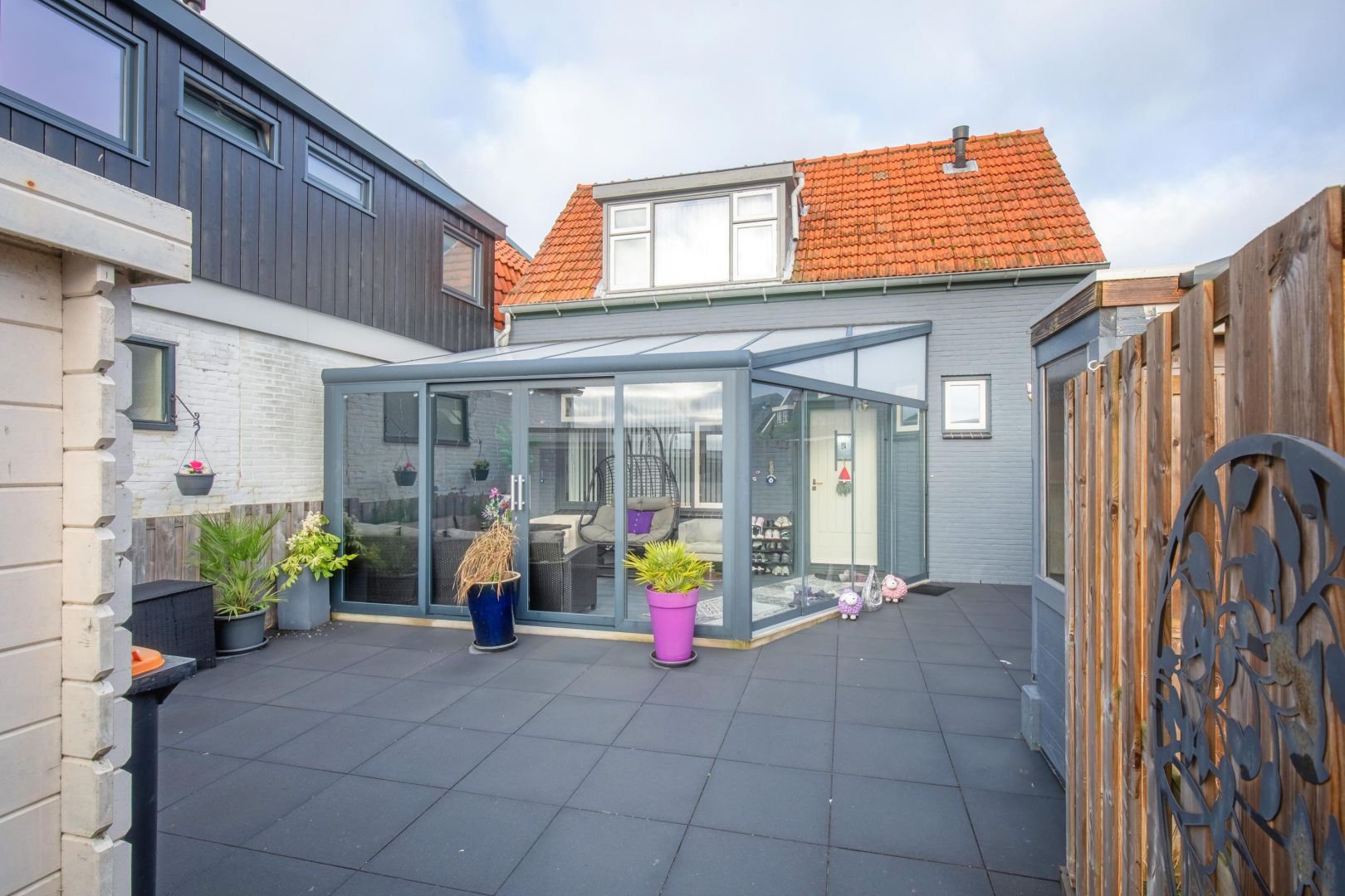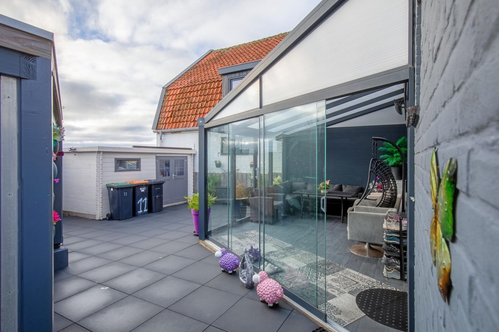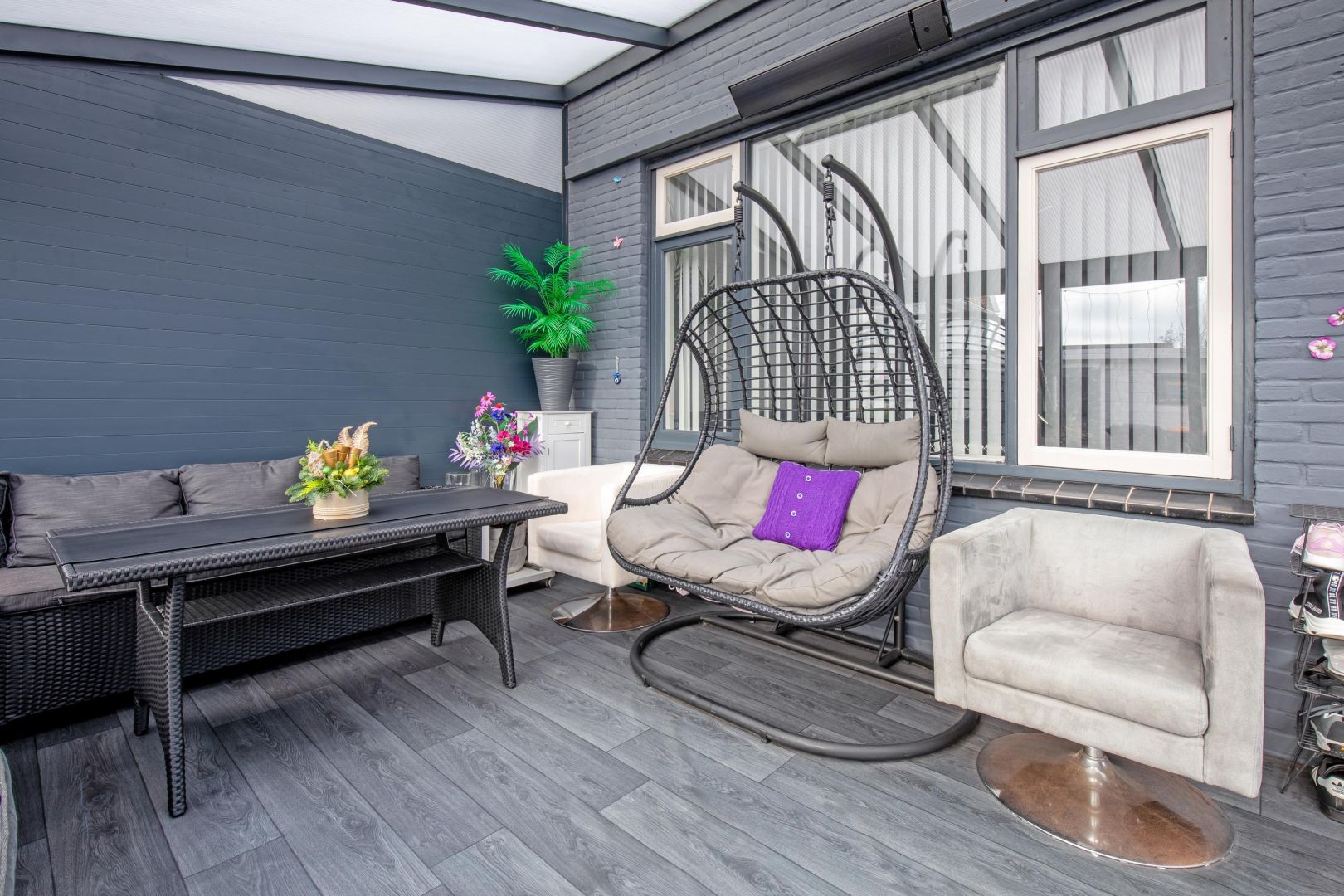 Aan de voorzijde van de woning is een ruime serre aangebouwd, die uitstekend kan dienen als tweede woonkamer. De ramen en deuren aan de zijkant kunnen vrijwel volledig worden geopend.