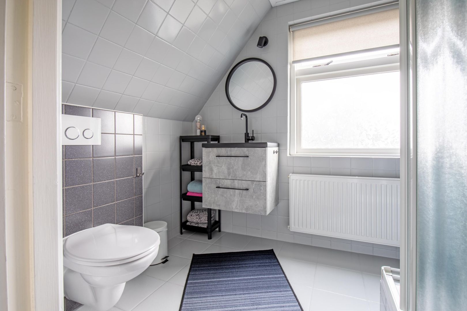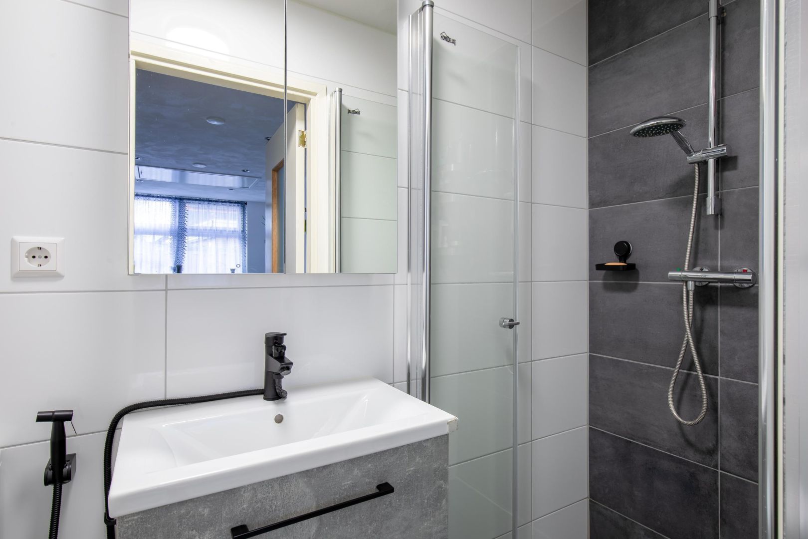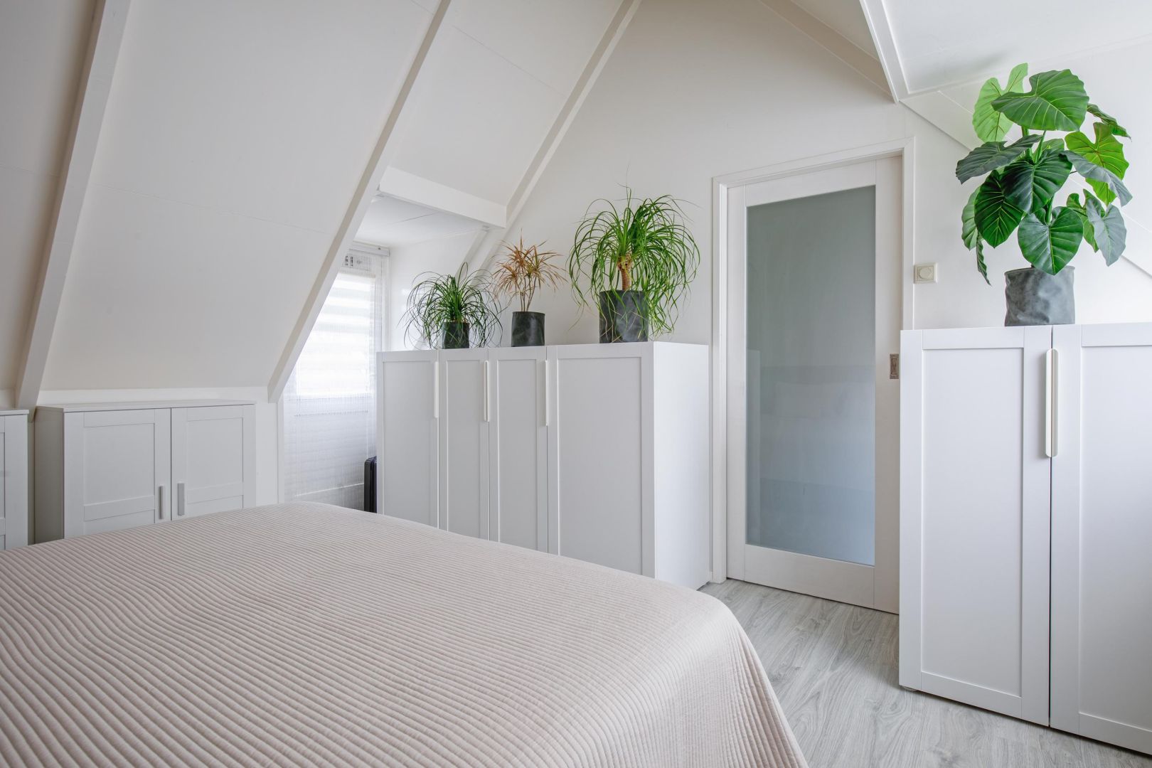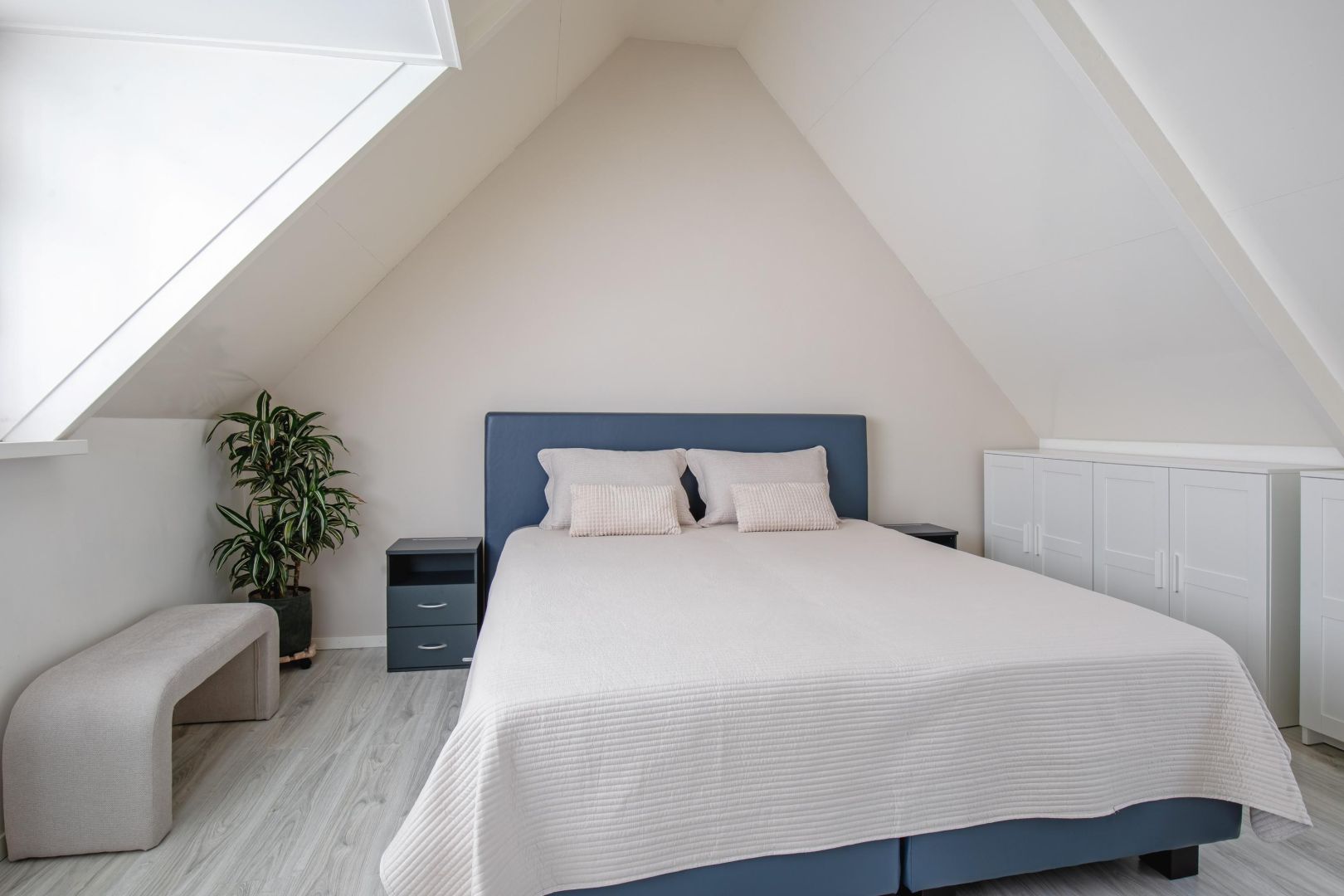 Aan de achterzijde van de woning bevindt zich een zeer ruime en comfortabele slaapkamer met een nette, aangrenzende badkamer. De badkamer is voorzien van een inloopdouche, wastafel en toilet en biedt alle gemakken voor dagelijks comfort. Vanuit de slaapkamer heeft u via een vlizotrap tevens toegang tot de bergzolder, ideaal voor extra opslagruimte.