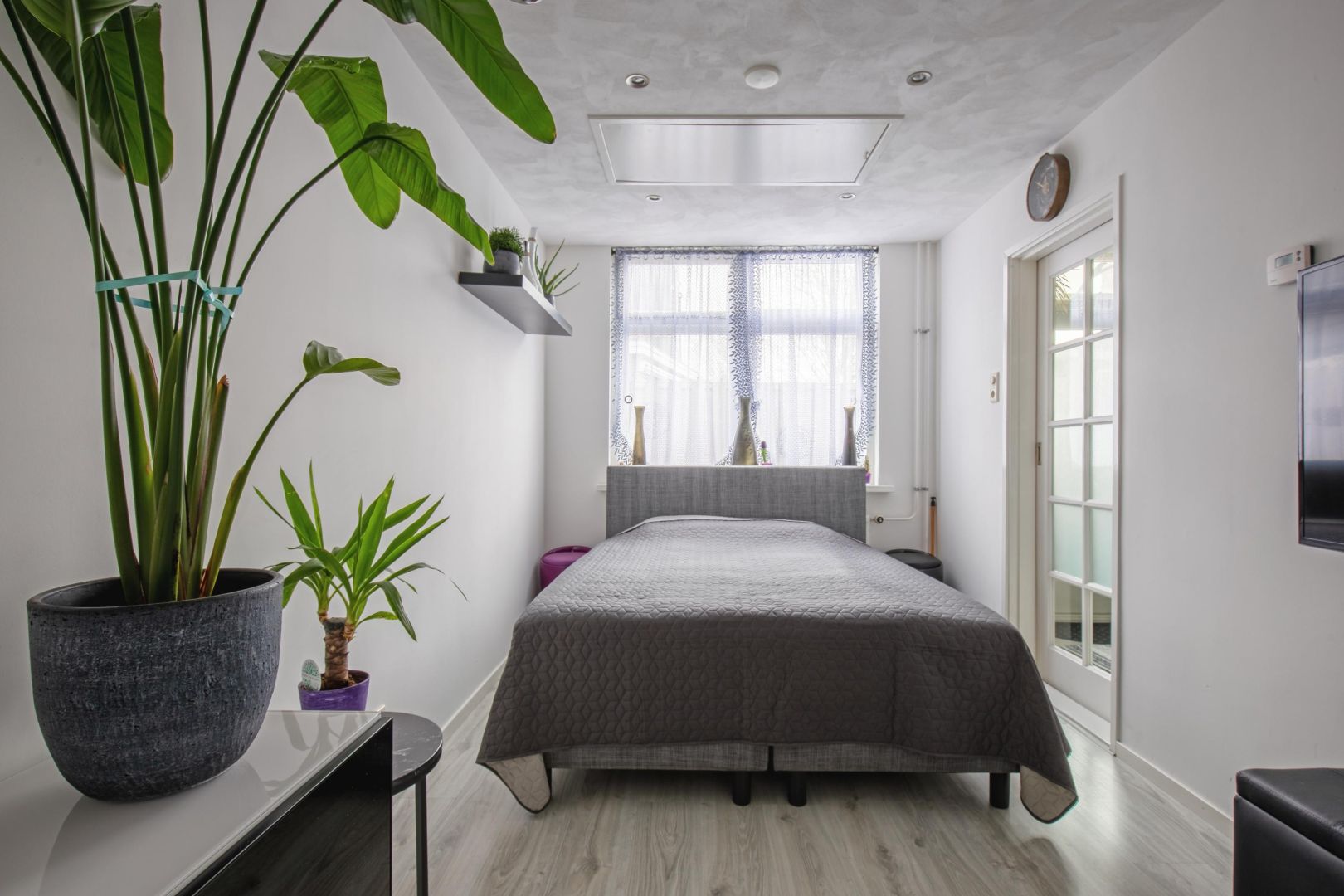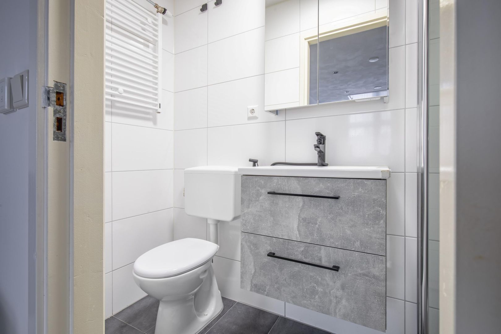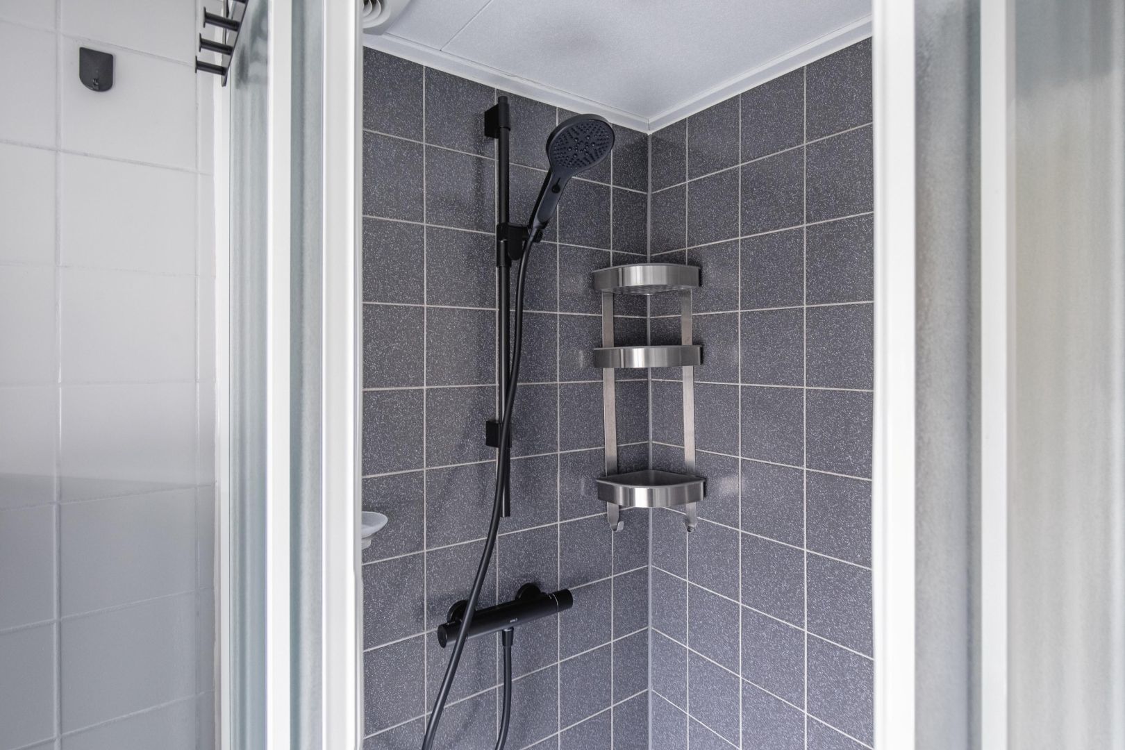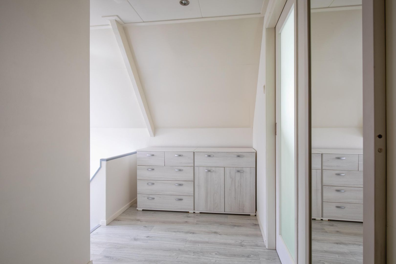 Aan de achterzijde van de woning bevindt zich een zeer ruime en comfortabele slaapkamer met een nette, aangrenzende badkamer. De badkamer is voorzien van een inloopdouche, wastafel en toilet en biedt alle gemakken voor dagelijks comfort. Vanuit de slaapkamer heeft u via een vlizotrap tevens toegang tot de bergzolder, ideaal voor extra opslagruimte.