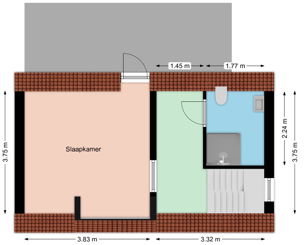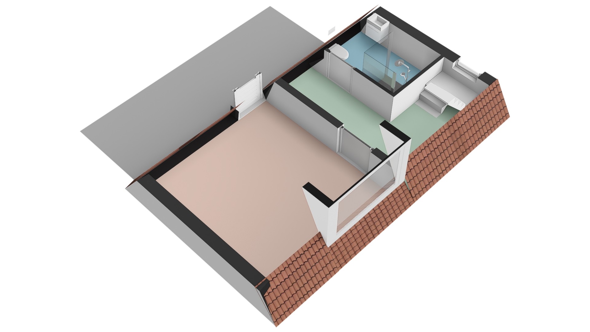 De zeer ruime slaapkamer is voorzien van een dakkapel en beschikt over een aangrenzend dakterras, dat direct vanuit de slaapkamer bereikbaar is. De badkamer op deze verdieping is uitgerust met een douche, een vrijdragend toilet en een wastafel en maakt het geheel compleet.