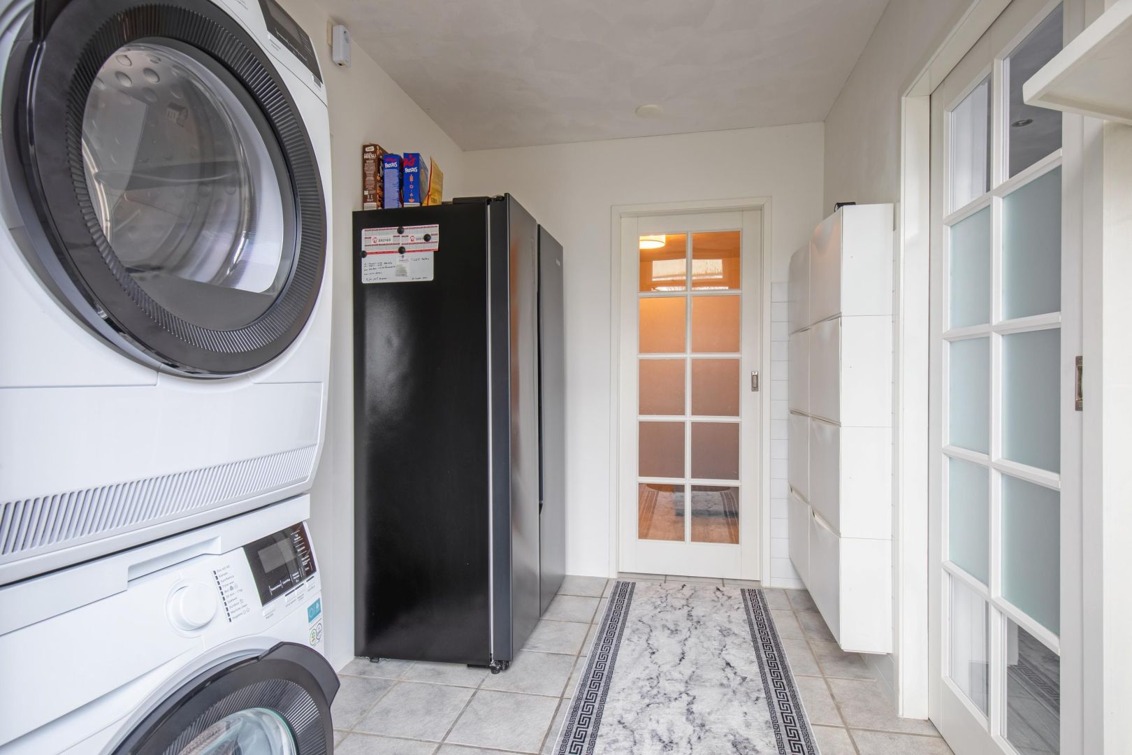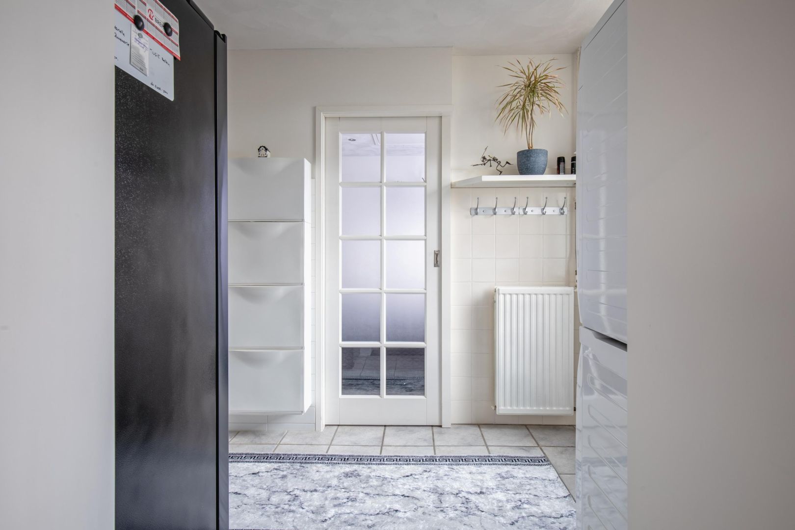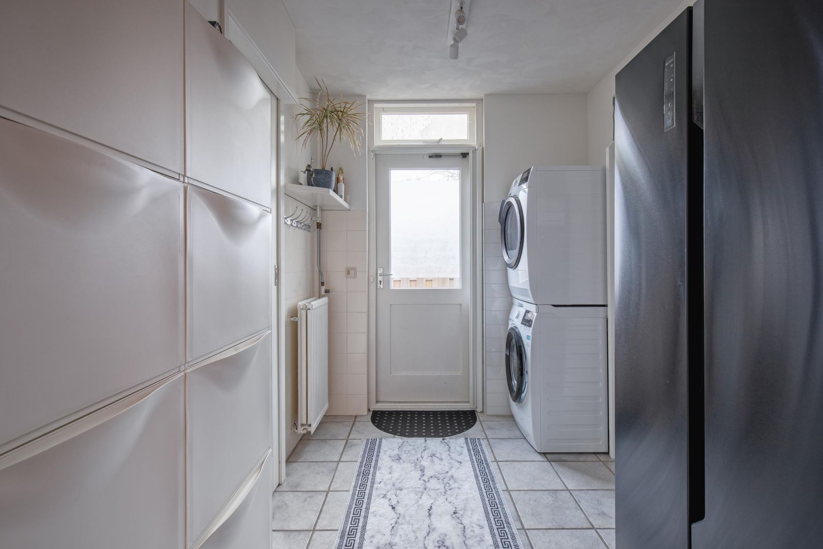 Vanuit de woonkamer en keuken bereikt u de tussenhal. Hier bevindt zich de opstelling voor de wasmachine en droger. Aangrenzend aan deze hal ligt een ruime kamer, die uitstekend kan dienen als bijvoorbeeld een walk-in closet. Vanuit de hal is bovendien directe toegang tot de tuin.