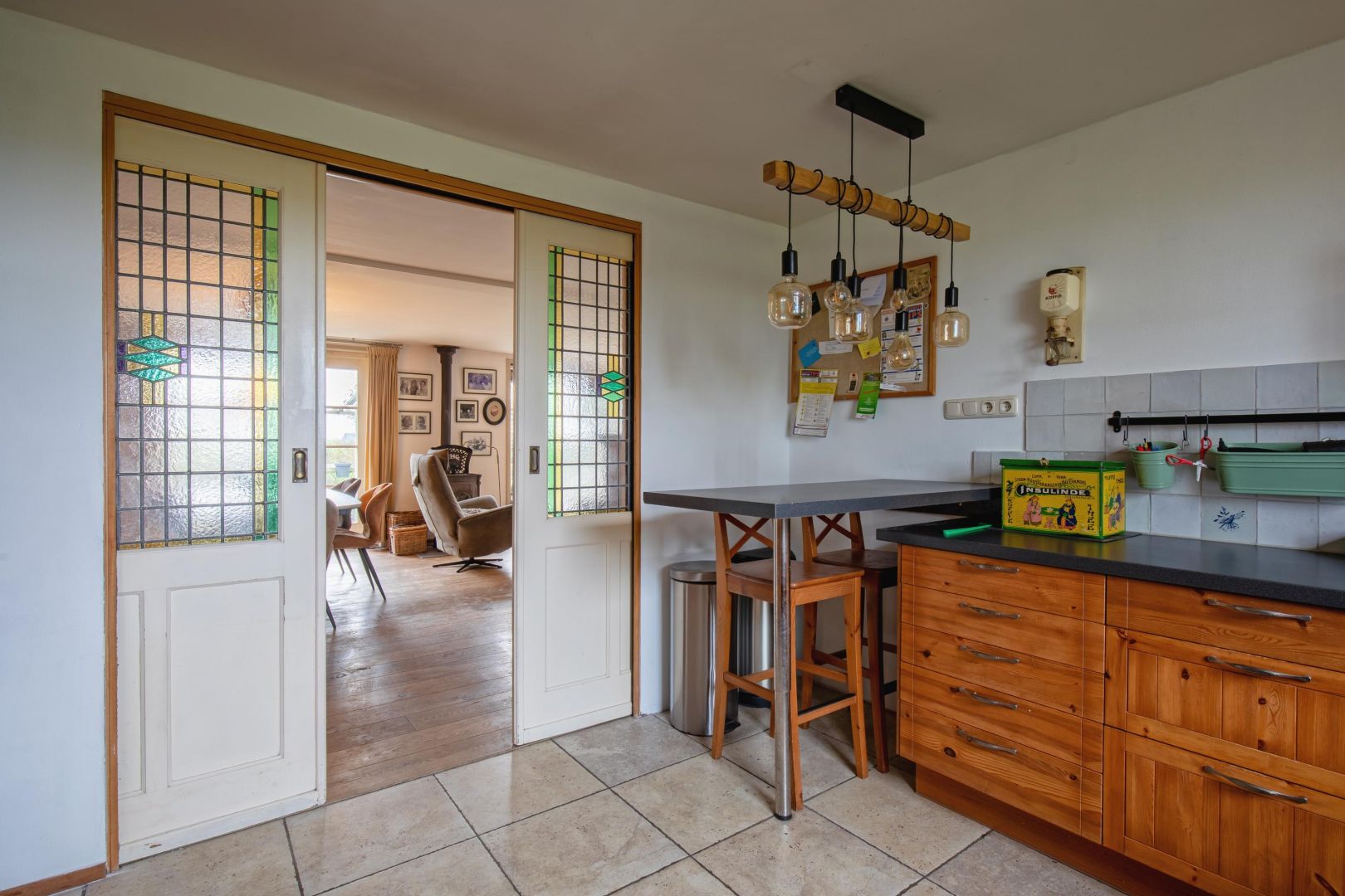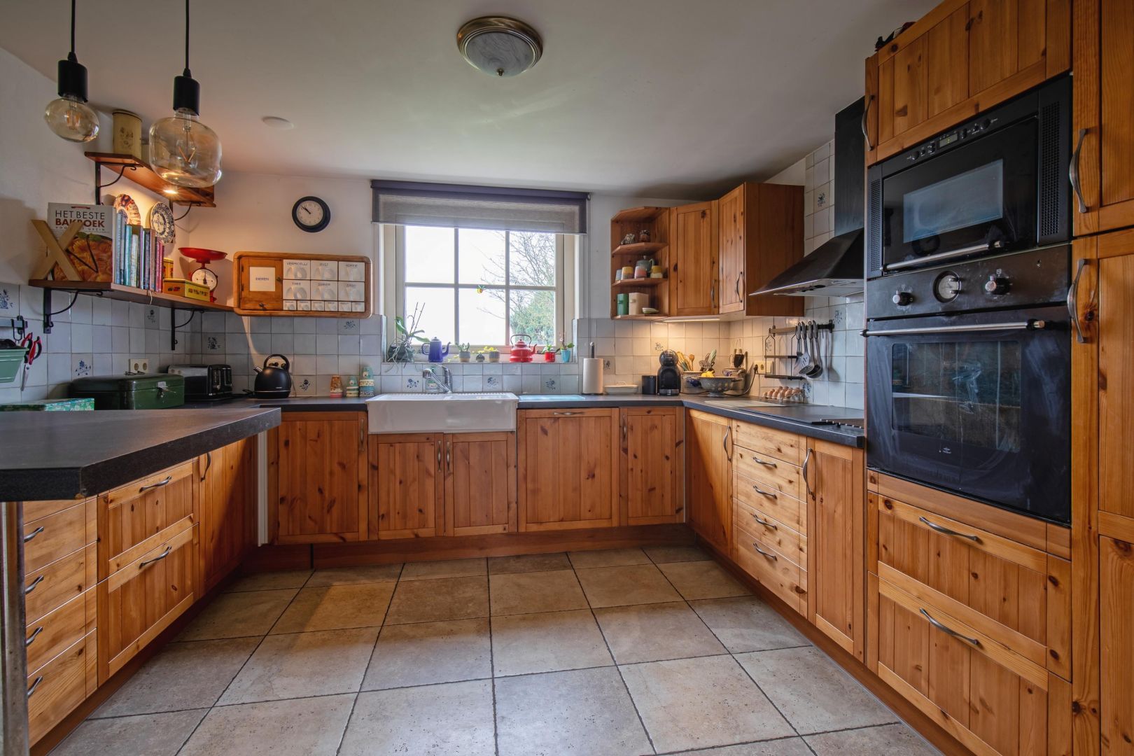 De keuken heeft een U-opstelling en is uitgevoerd met een dubbele spoelbak, kookplaat, afzuigkap, oven, magnetron, koelkast en vaatwasser. De ruimte naast de keuken is thans ingericht als kantoor, maar is ook prima geschikt als bijvoorbeeld een extra slaapkamer op de begane grond.