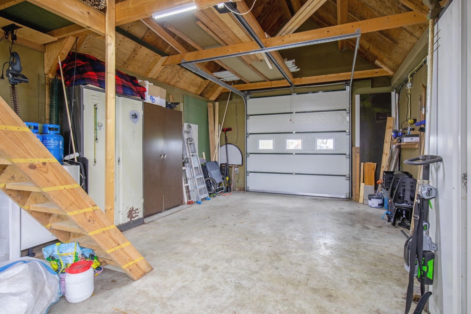 Naast de woning is een ruime overkapping (ca. 27 m2) met een garagedeur. De stenen garage (ca. 42 m2) heeft ook garagedeur aan de voorzijde en beschikt over een bergzolder. Aan de voorzijde van het perceel is een ruime oprit met parkeergelegenheid voor meerdere auto’s.