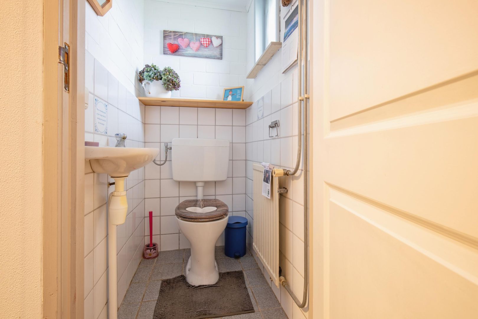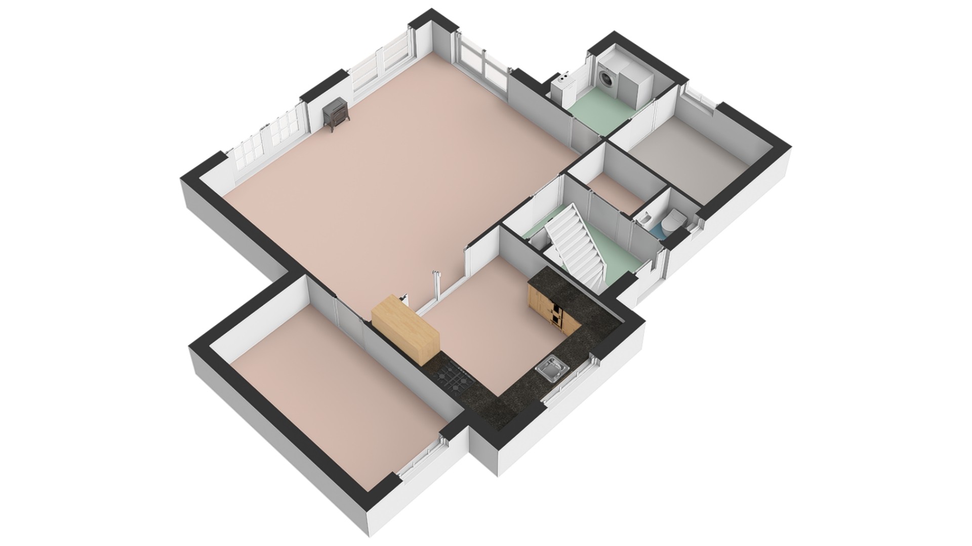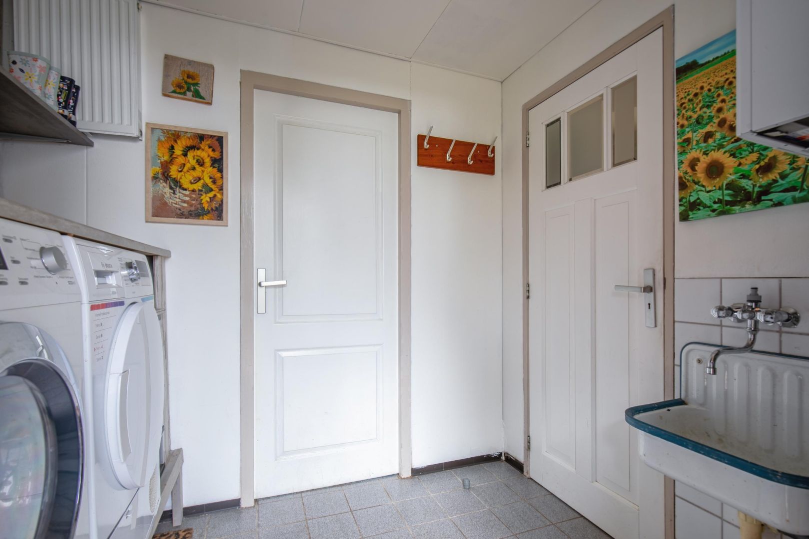 Aan de andere zijde zijn de tussenhal en berging gesitueerd met een deur naar de tuin. Hier zijn aansluitingen voor een wasmachine/droger, evenals de opstelling van zowel de cv-ketel als de omvormer/thuisbatterij van de zonnepanelen.