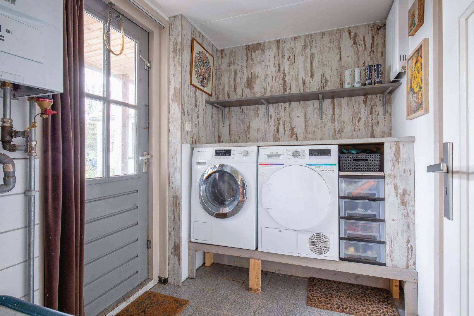 Aan de andere zijde zijn de tussenhal en berging gesitueerd met een deur naar de tuin. Hier zijn aansluitingen voor een wasmachine/droger, evenals de opstelling van zowel de cv-ketel als de omvormer/thuisbatterij van de zonnepanelen.