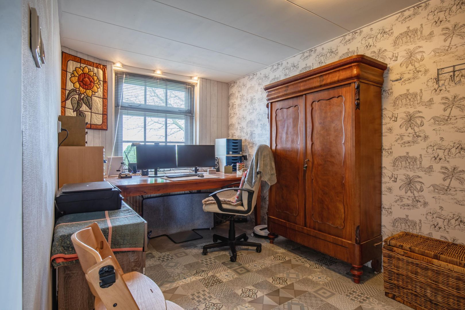 De keuken heeft een U-opstelling en is uitgevoerd met een dubbele spoelbak, kookplaat, afzuigkap, oven, magnetron, koelkast en vaatwasser. De ruimte naast de keuken is thans ingericht als kantoor, maar is ook prima geschikt als bijvoorbeeld een extra slaapkamer op de begane grond.