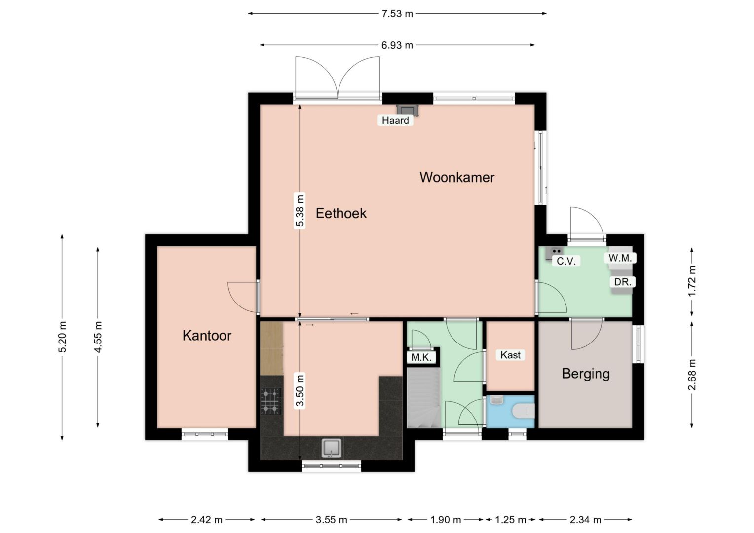 Indeling: entree in hal met toegang tot de woonkamer, keuken, toiletruimte, bergruimte en trap naar de 1e verdieping.