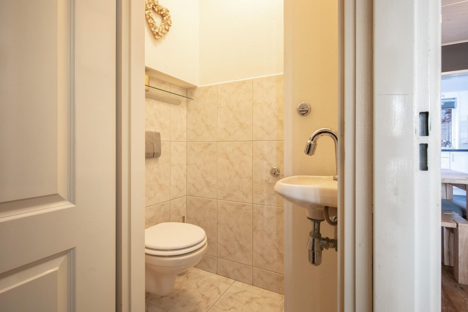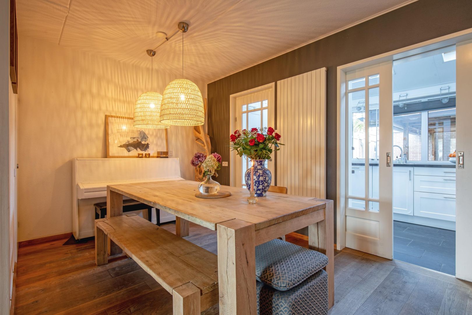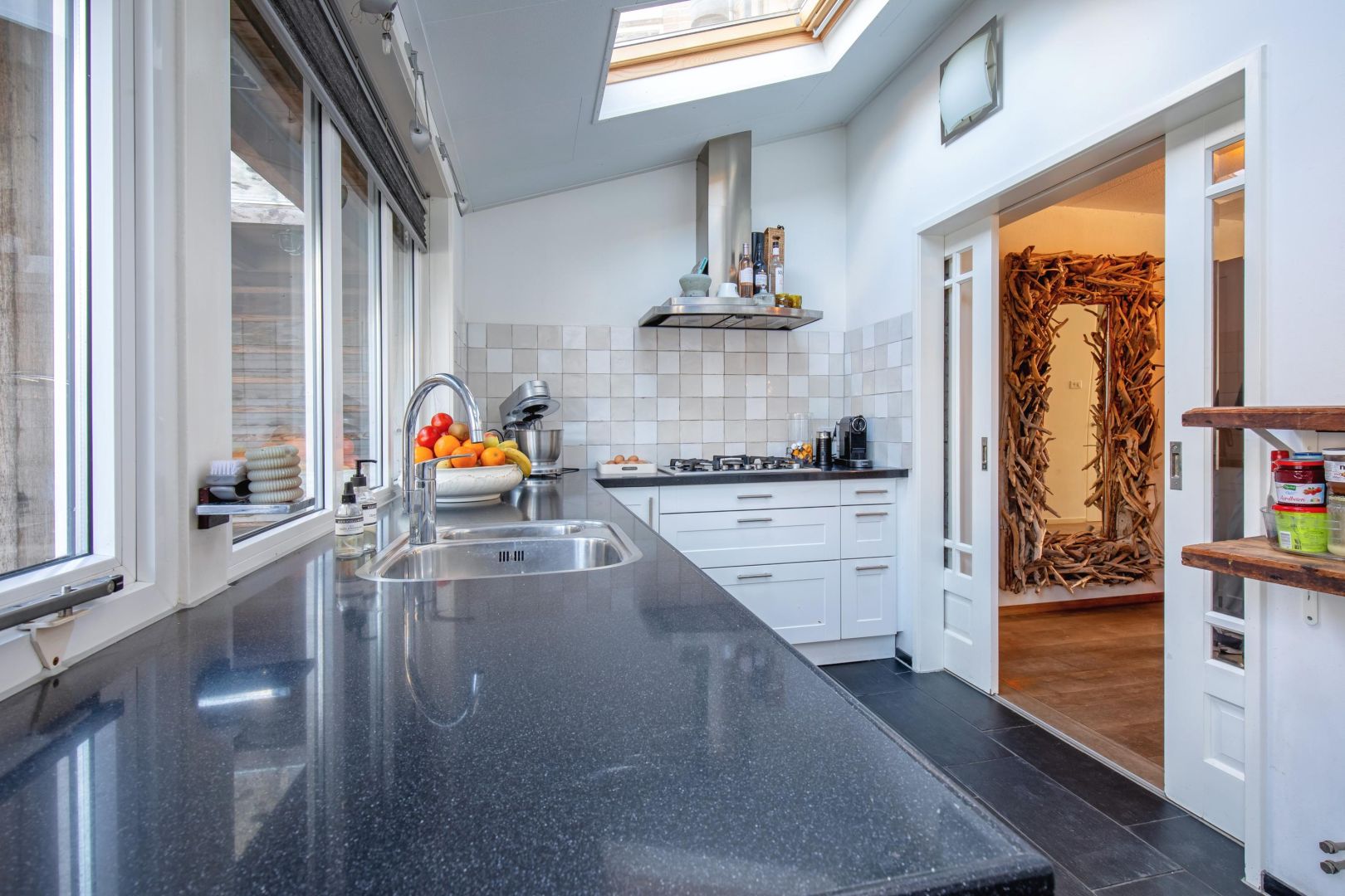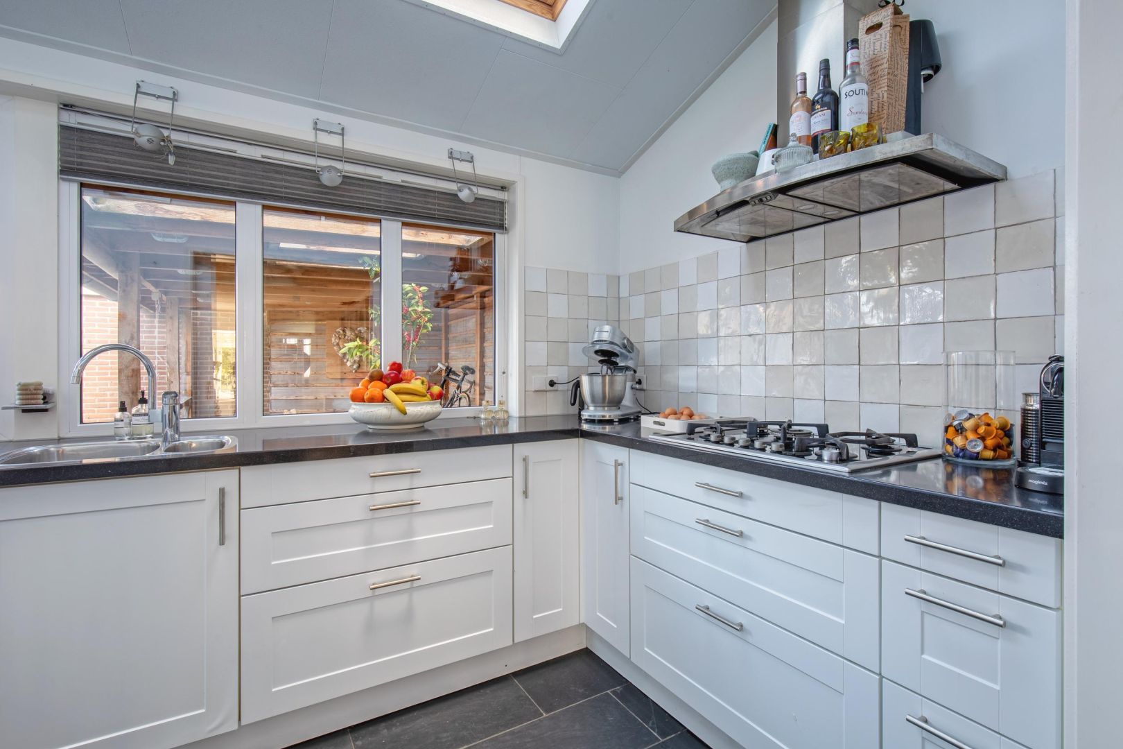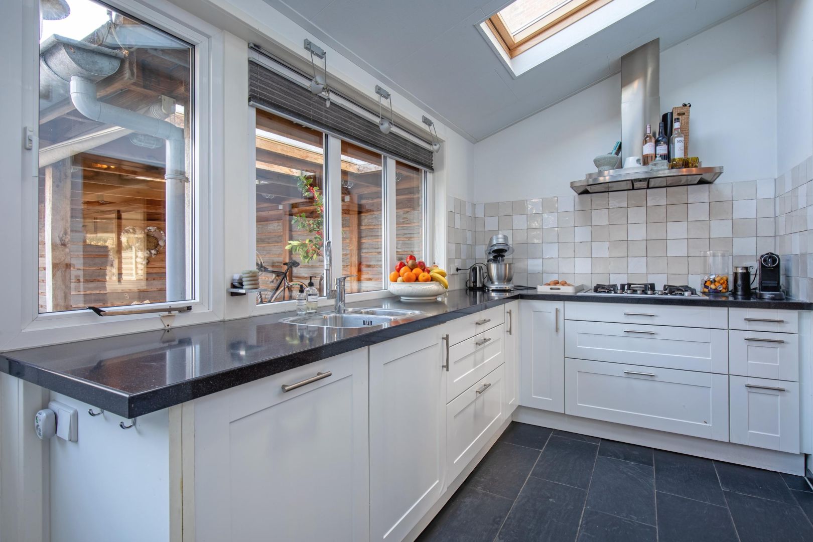 In de uitbouw aan de achterzijde van de woning is de keuken gerealiseerd met doorgang naar de tuin. Dankzij de dakramen in de uitbouw is hier voldoende lichtinval. De keuken is af te sluiten middels schuifdeuren. De keuken is uitgevoerd met o.a. koelkast met vriesvak, spoelbak, 5-pits gasfornuis, combi-oven, afzuigkap en vaatwasser.