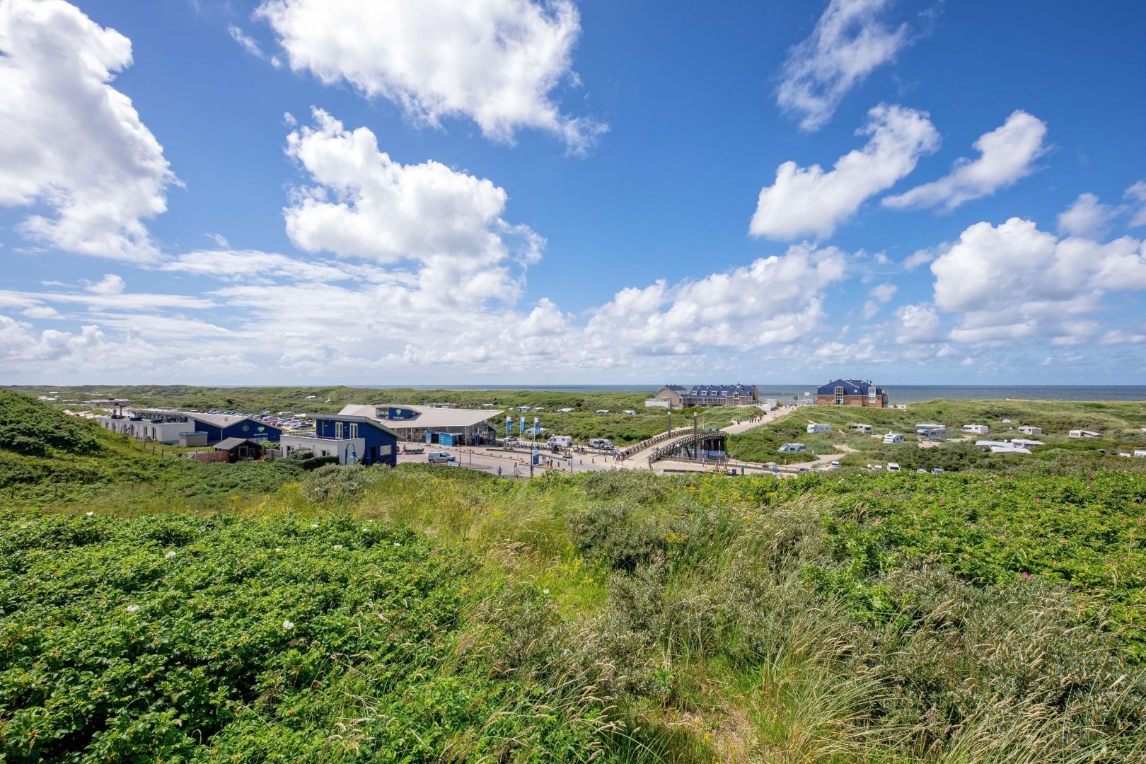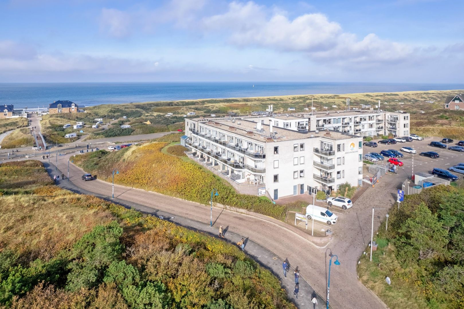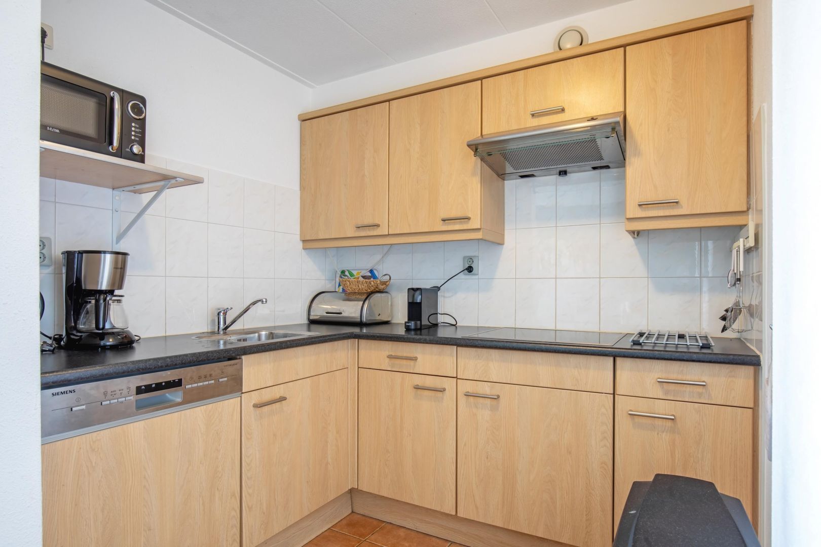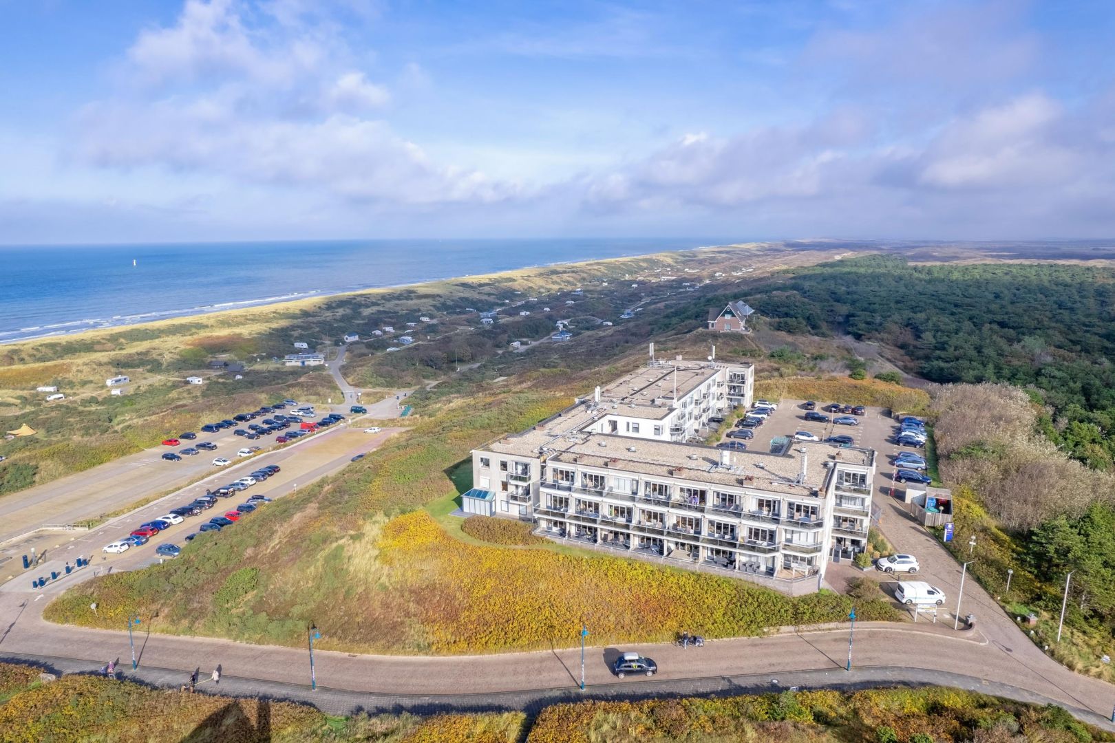 De woonruimte met halfopen keuken is heerlijk licht en biedt zicht op de duinenrij en de Noordzee. De keuken, uitgevoerd in hoekopstelling, is voorzien van spoelbak, kookplaat, afzuiging, magnetron, vaatwasser en koelkast.