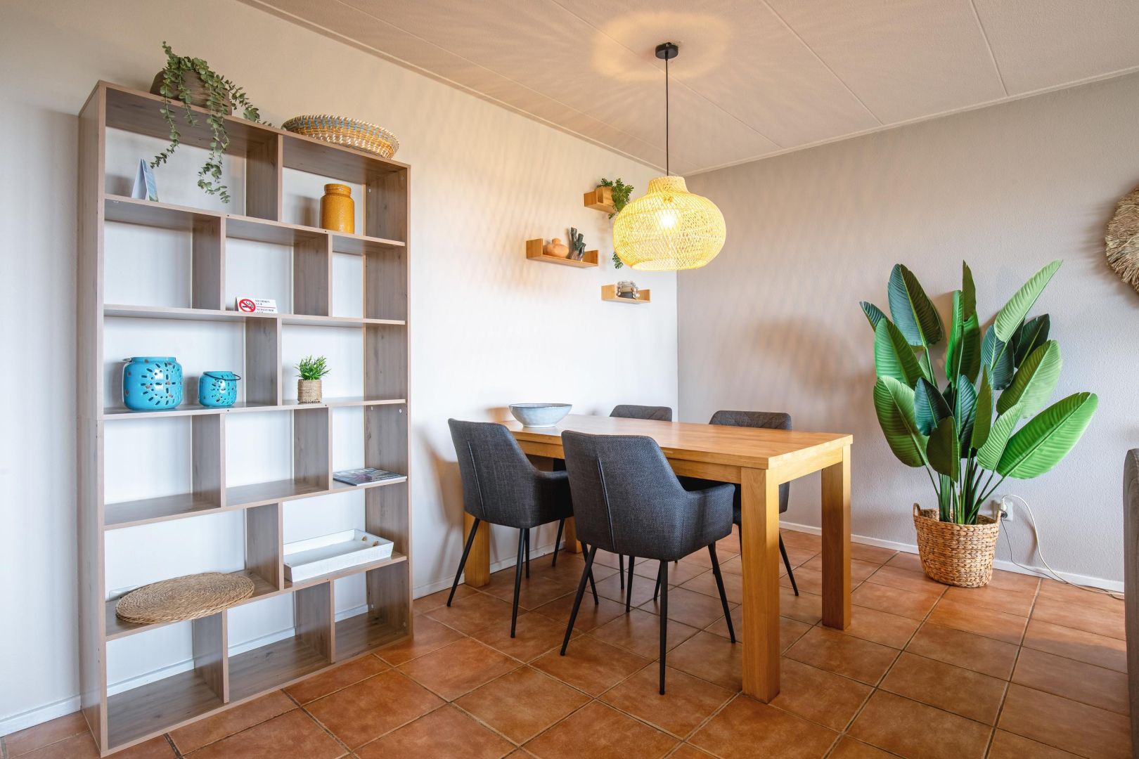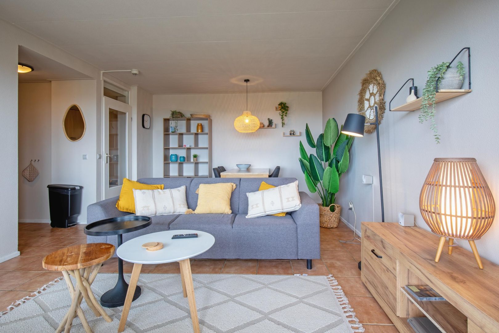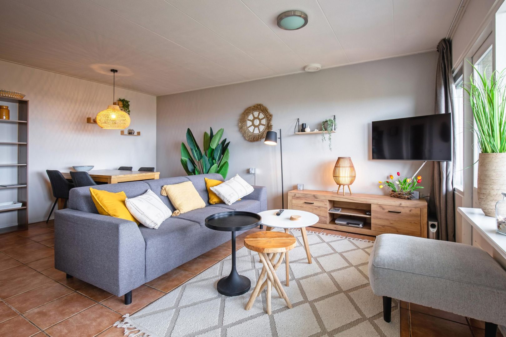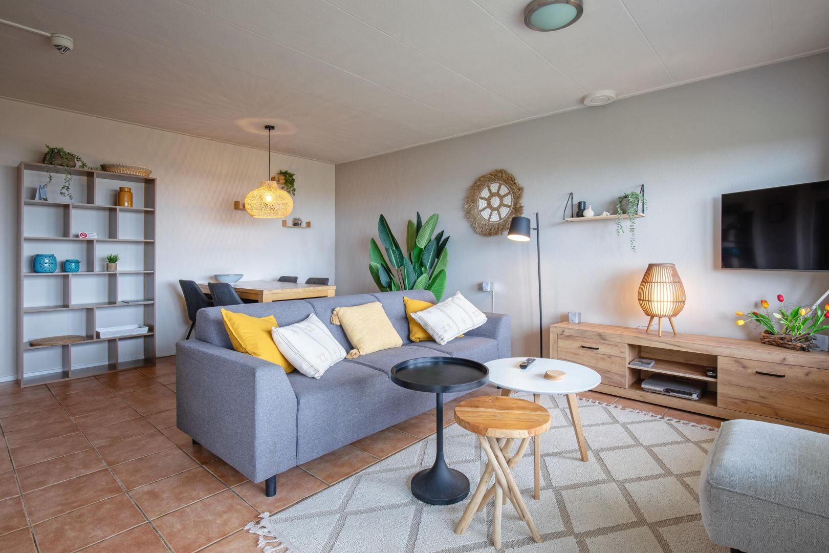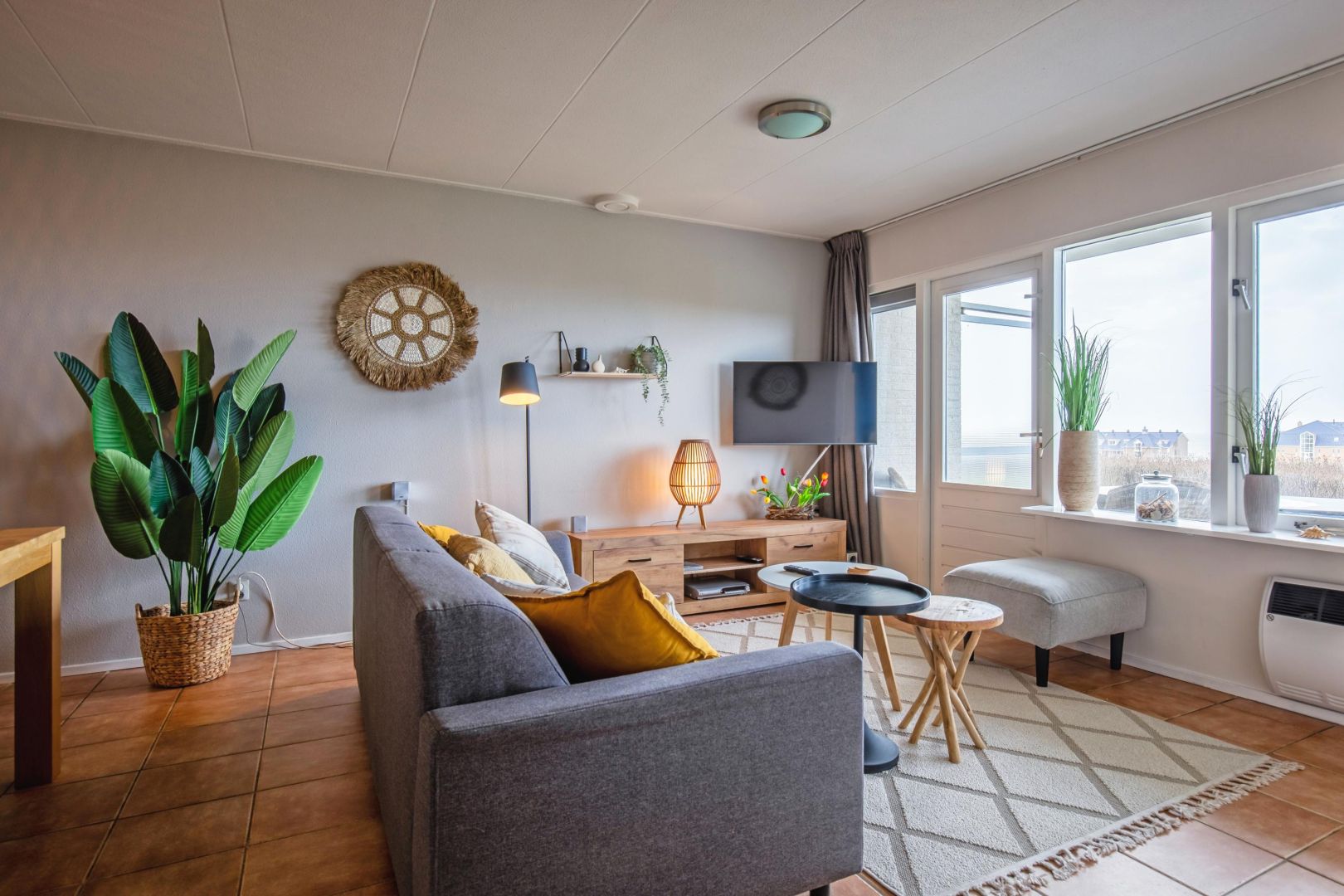 De woonruimte met halfopen keuken is heerlijk licht en biedt zicht op de duinenrij en de Noordzee. De keuken, uitgevoerd in hoekopstelling, is voorzien van spoelbak, kookplaat, afzuiging, magnetron, vaatwasser en koelkast.