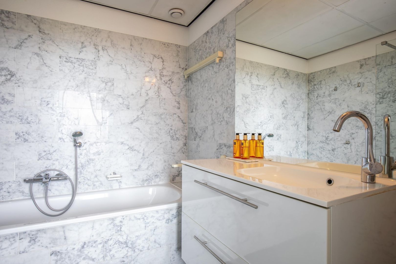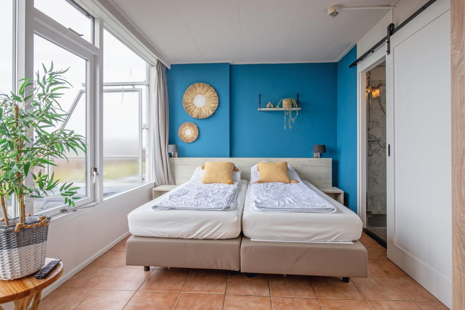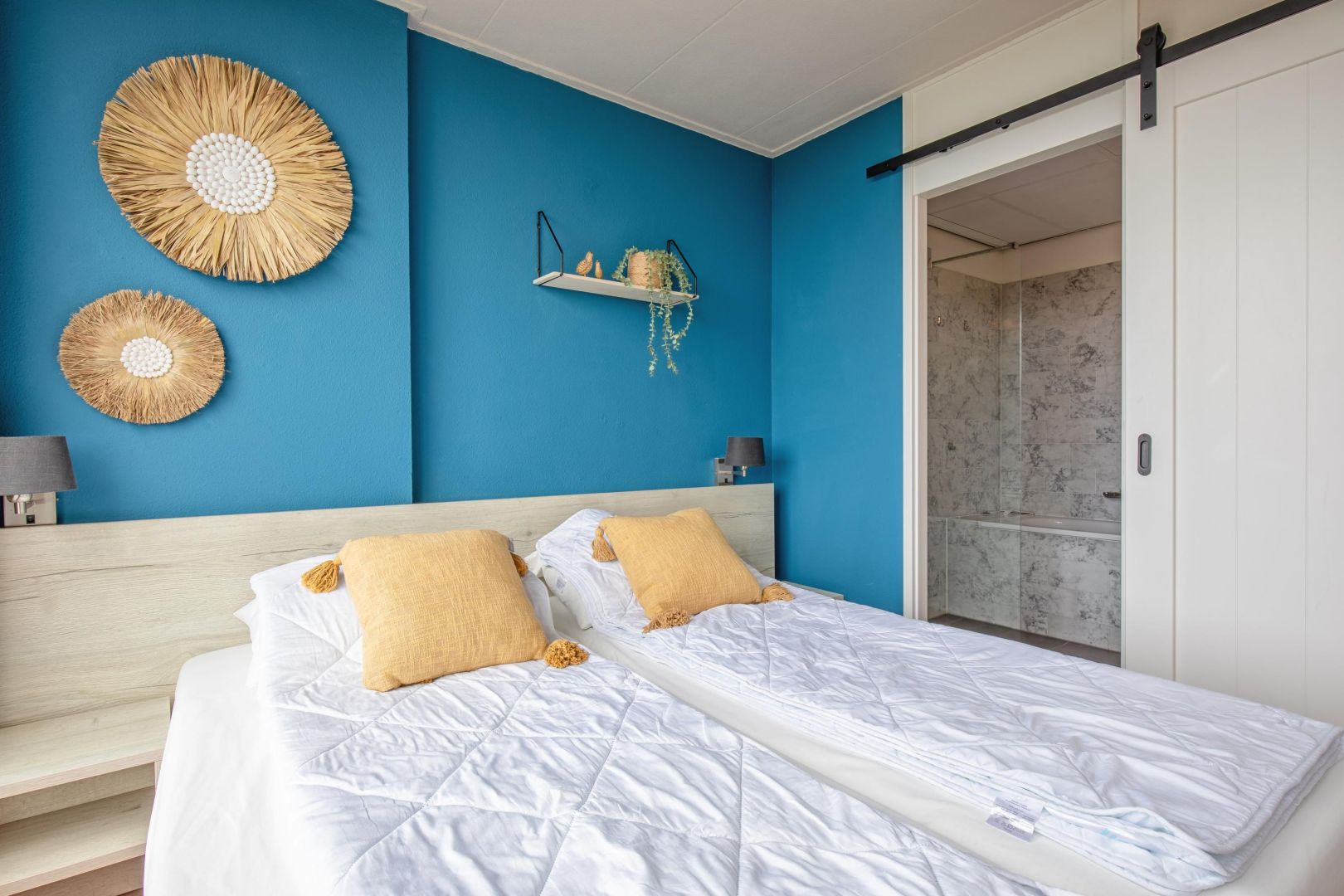 Het appartement heeft een ruime 2-persoons slaapkamer met een aangrenzende badkamer met ligbad, douche en wastafelmeubel.