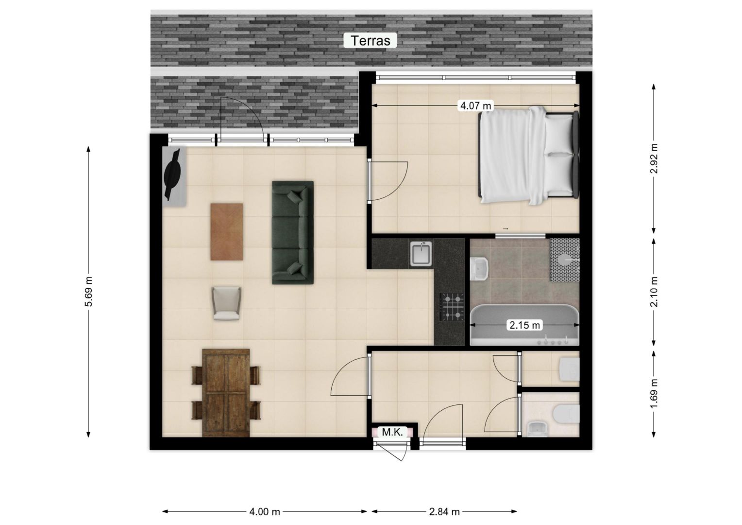 Indeling: entree in hal met toegang tot de woonkamer/keuken, slaapkamer, badkamer en separate toiletruimte (v.v. toilet en fonteintje).