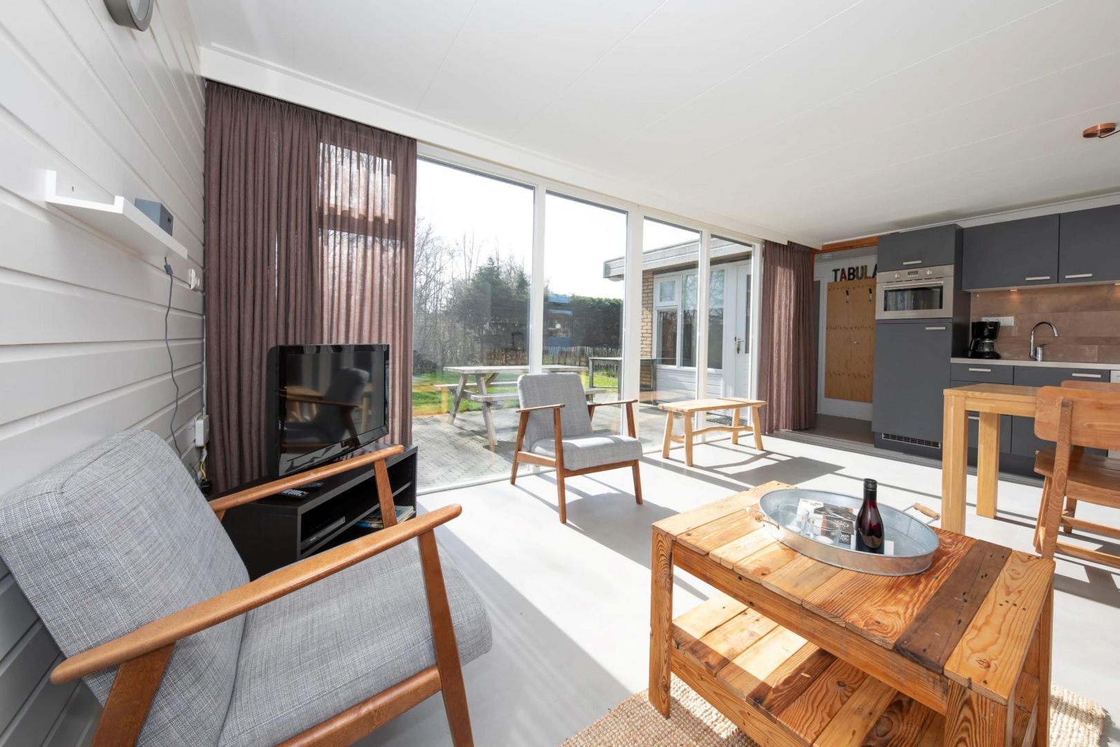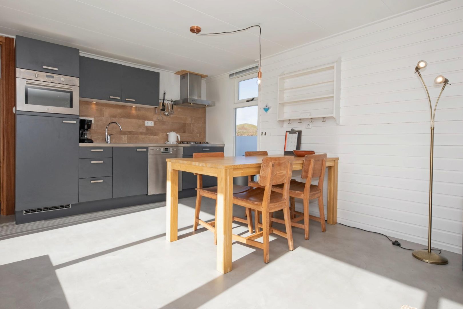 De knusse woonkamer is gezellig ingericht en biedt zicht op de tuin. Dankzij de raampartijen valt het zonlicht prettig naar binnen, wat zorgt voor een lichte en uitnodigende sfeer. Hier kunt u heerlijk ontspannen na een wandeling in De Slufter. De woning is voorzien van vloerverwarming.