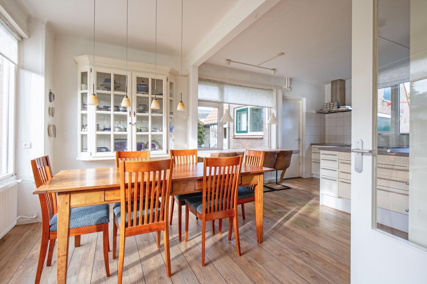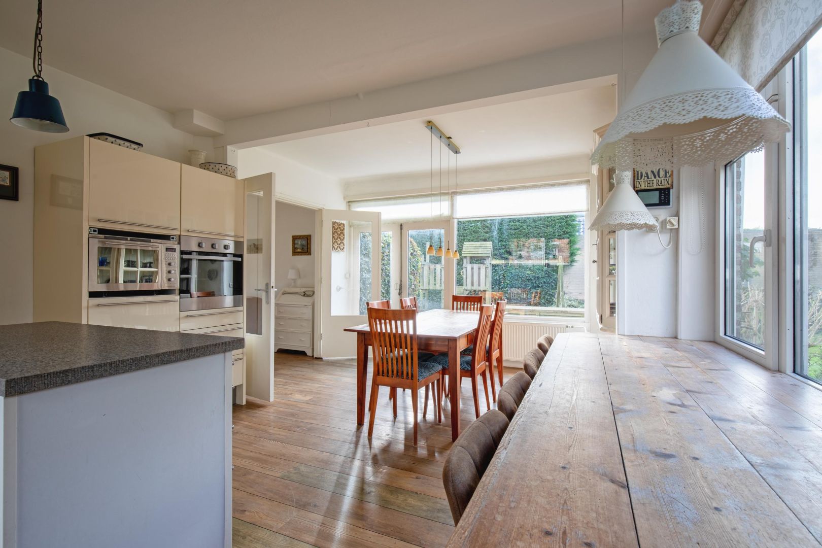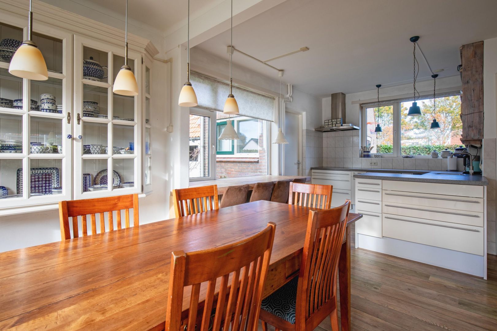 Openslaande deuren verbinden de woonkamer met de eethoek en keuken. In de eethoek zijn openslaande deuren naar de tuin. De keuken (met kastruimte onder de trap) heeft een ruim werkblad en is uitgevoerd met spoelbak, kookplaat, afzuigkap, oven, magnetron en vaatwasser. In de bijkeuken is zowel een deur naar de schuur als naar de tuin.