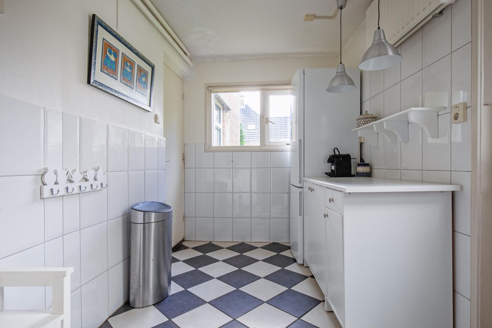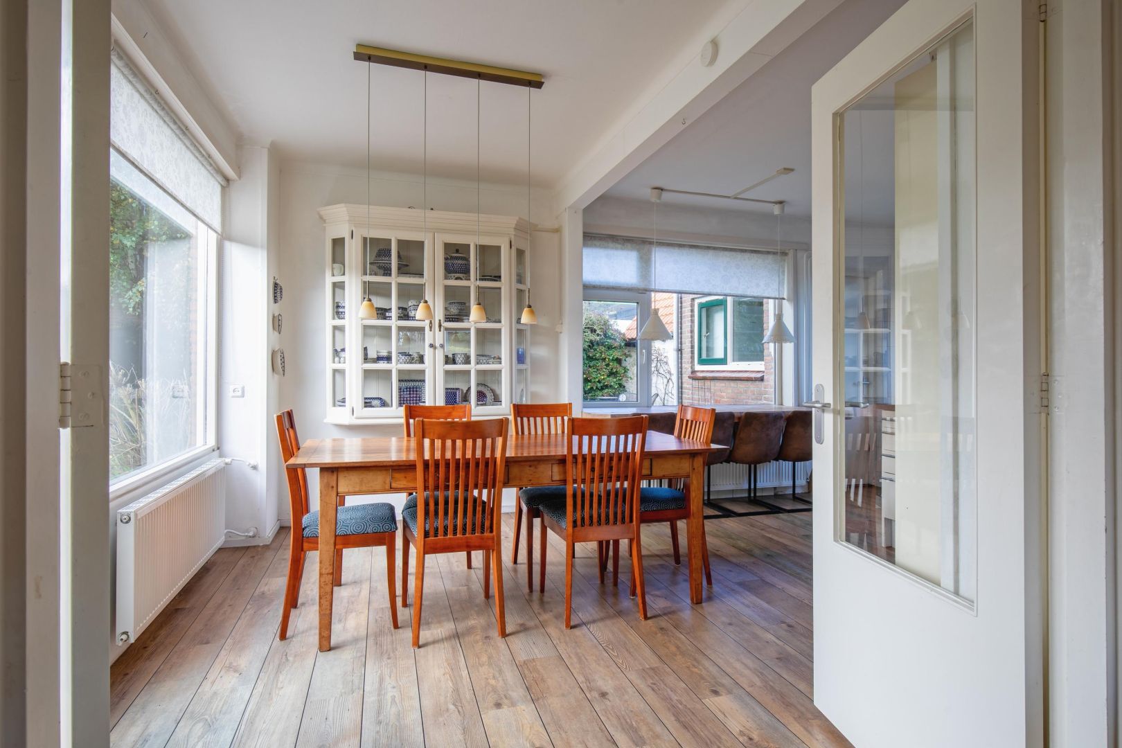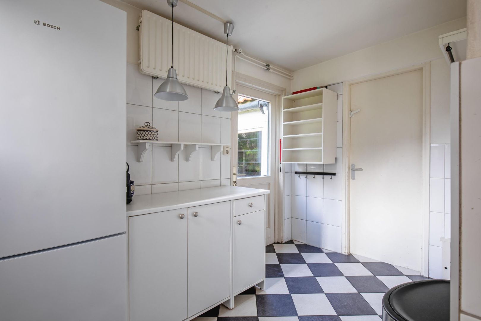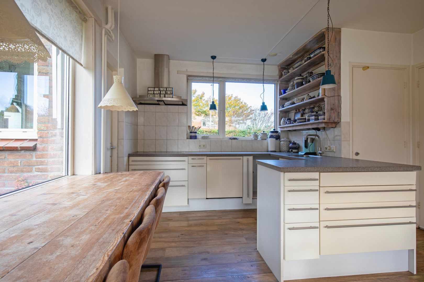 Openslaande deuren verbinden de woonkamer met de eethoek en keuken. In de eethoek zijn openslaande deuren naar de tuin. De keuken (met kastruimte onder de trap) heeft een ruim werkblad en is uitgevoerd met spoelbak, kookplaat, afzuigkap, oven, magnetron en vaatwasser. In de bijkeuken is zowel een deur naar de schuur als naar de tuin.