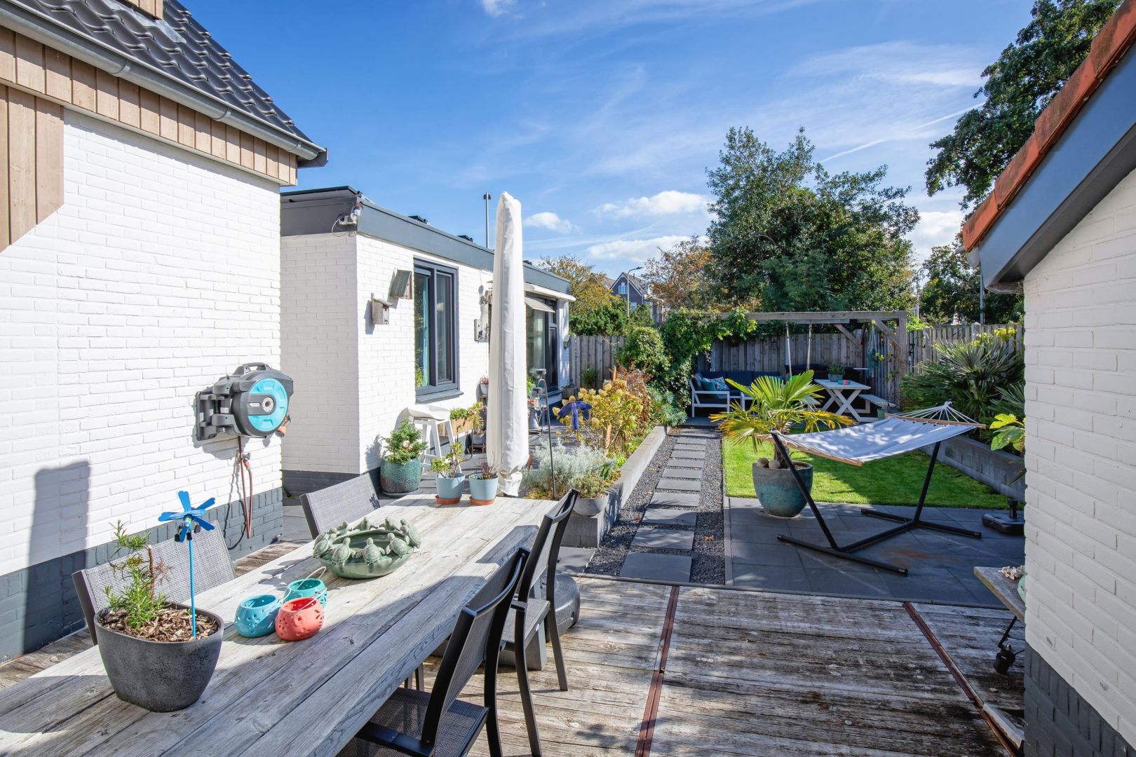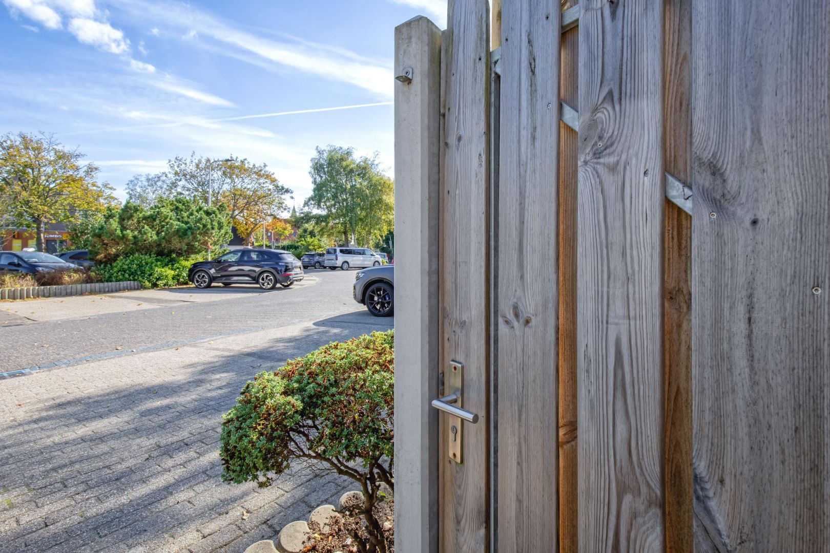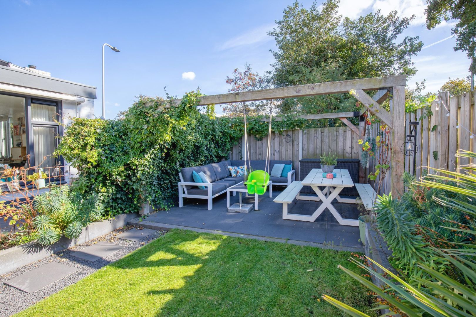 De tuin is gezellig ingericht met twee terrassen en een grasveld. Er is een achterom verbinding naar de parkeerplaats van supermarkt de Jumbo. Aan de voorzijde van de woning is parkeergelegenheid voor drie auto’s op eigen terrein.