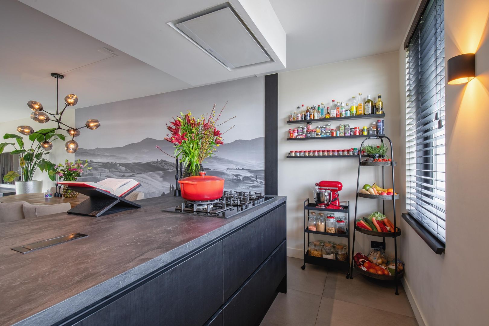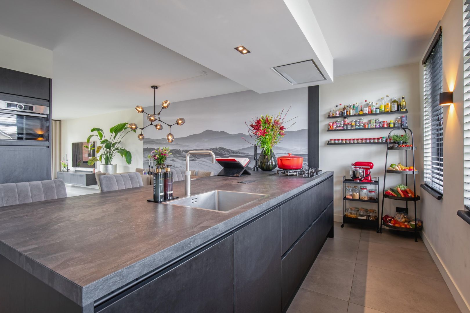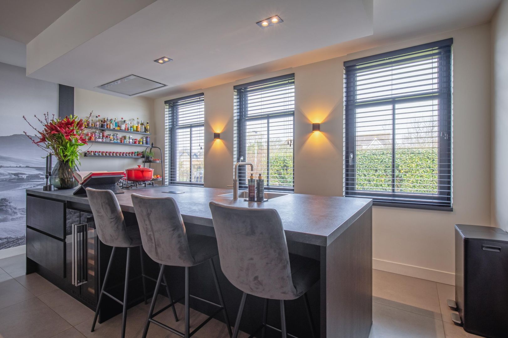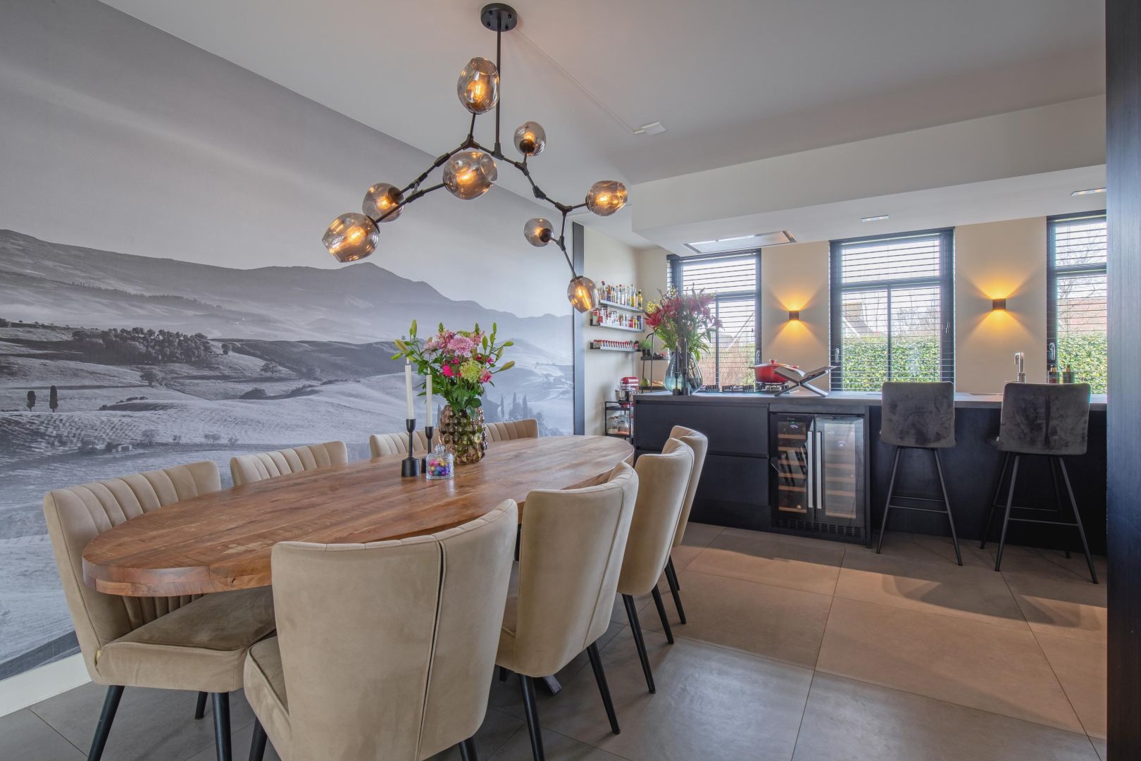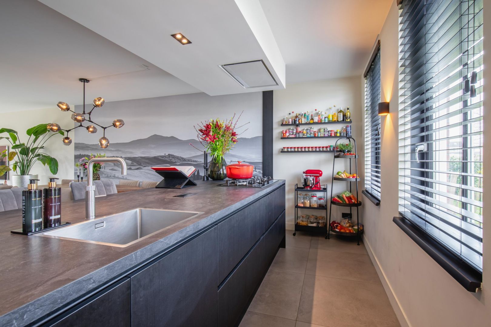 De woonkamer is voorzien van een tegelvloer (met vloerverwarming) en er zijn openslaande deuren naar de tuin. De keuken bevindt zich aan de andere zijde en beschikt over een ruim kookeiland met o.a. spoelbak, Quooker, 5-pits gaskookplaat, afzuigkap en een wijnklimaatkast. De keuken is ook voorzien van stoomoven, combi-oven, vriezer, koelkast en vaatwasser. Tussen de woonkamer en de keuken is de eethoek.