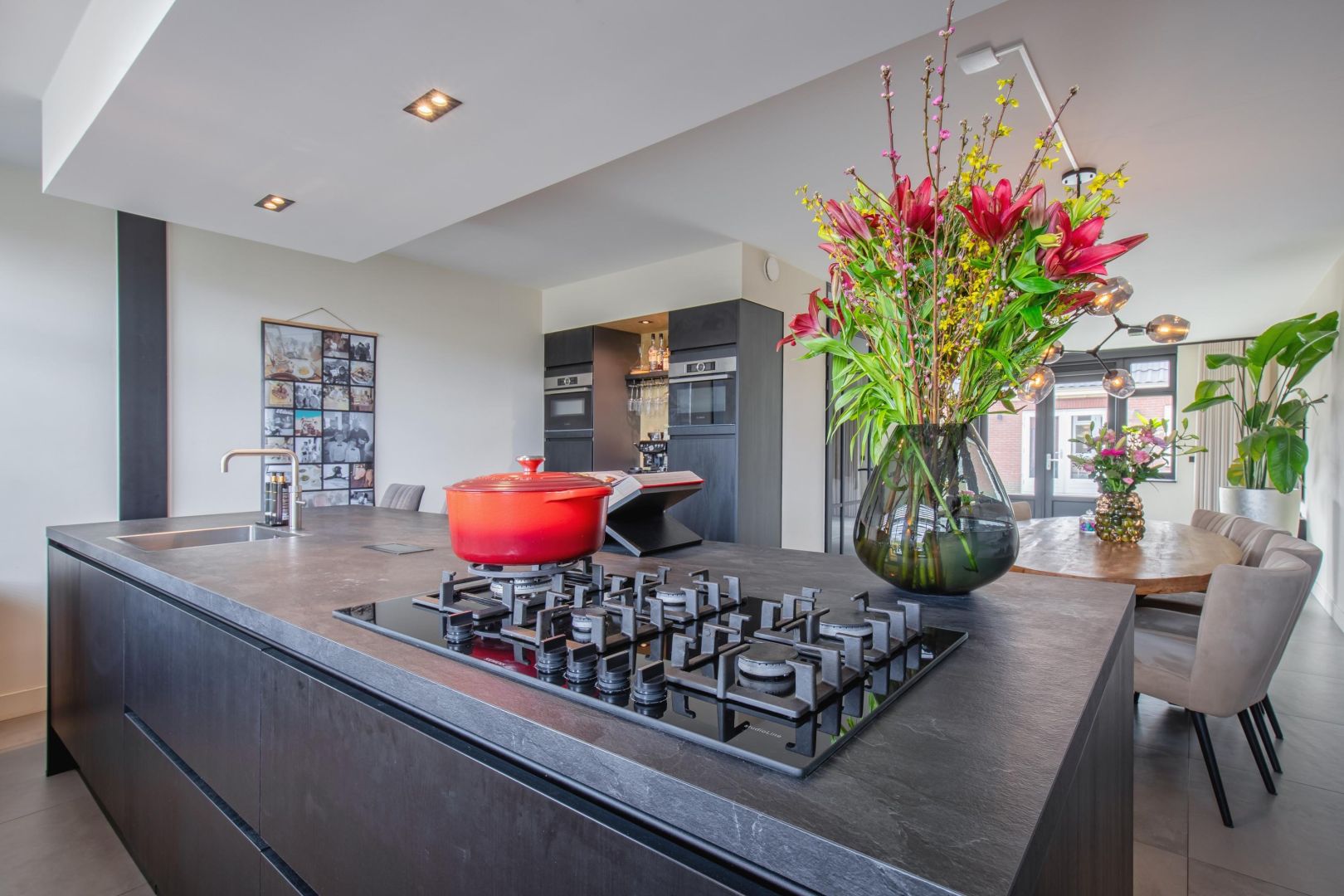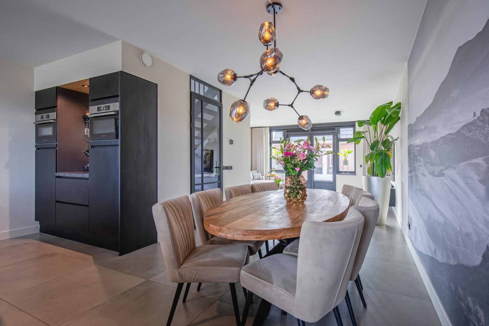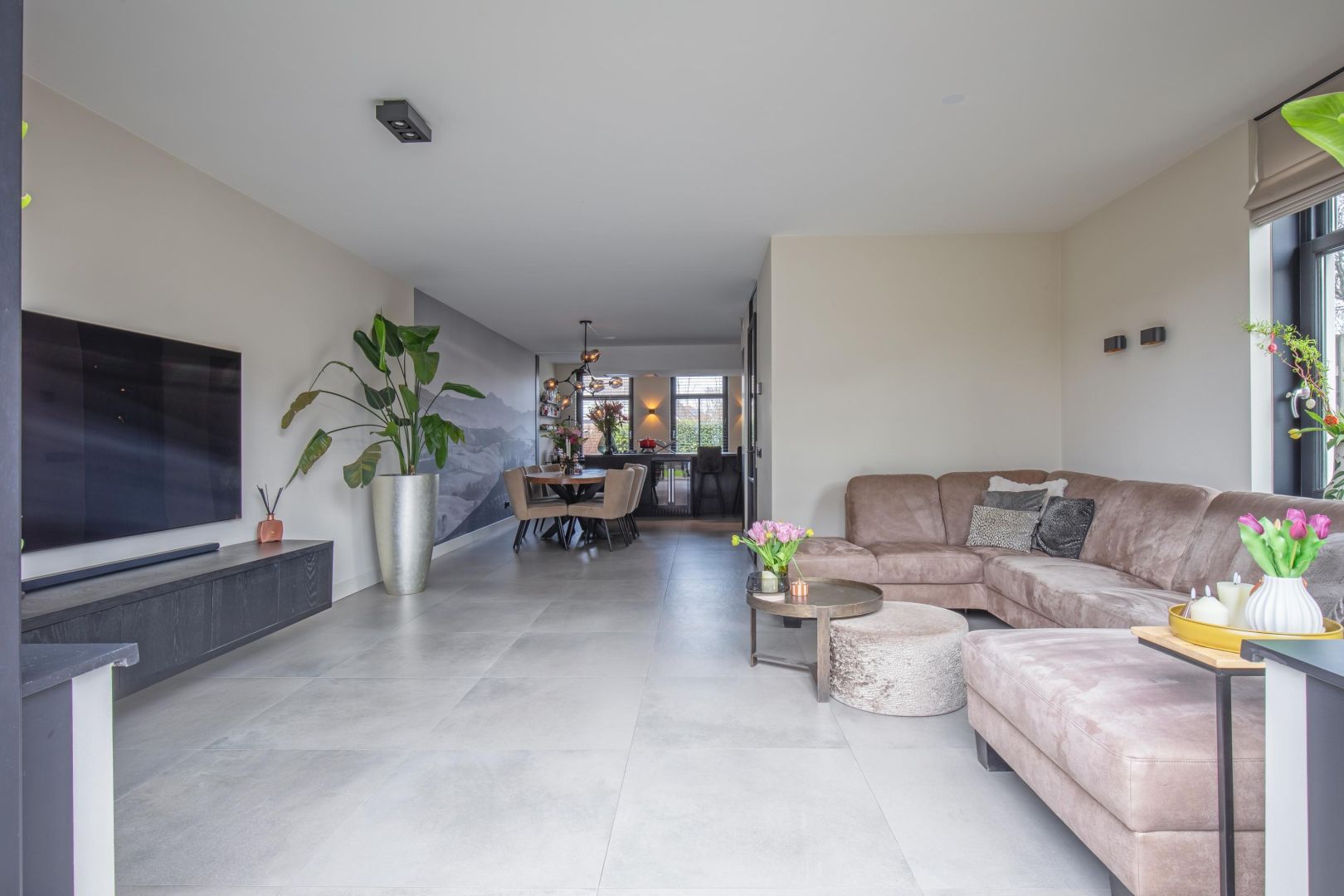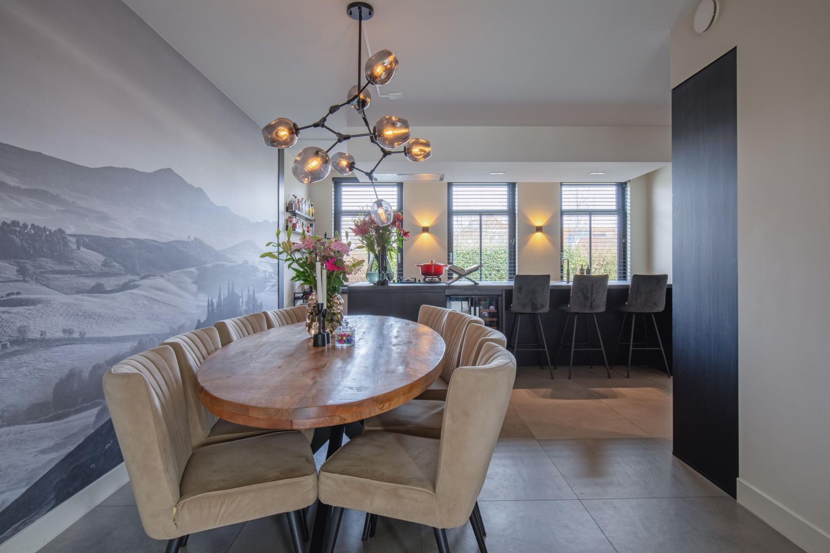 De woonkamer is voorzien van een tegelvloer (met vloerverwarming) en er zijn openslaande deuren naar de tuin. De keuken bevindt zich aan de andere zijde en beschikt over een ruim kookeiland met o.a. spoelbak, Quooker, 5-pits gaskookplaat, afzuigkap en een wijnklimaatkast. De keuken is ook voorzien van stoomoven, combi-oven, vriezer, koelkast en vaatwasser. Tussen de woonkamer en de keuken is de eethoek.