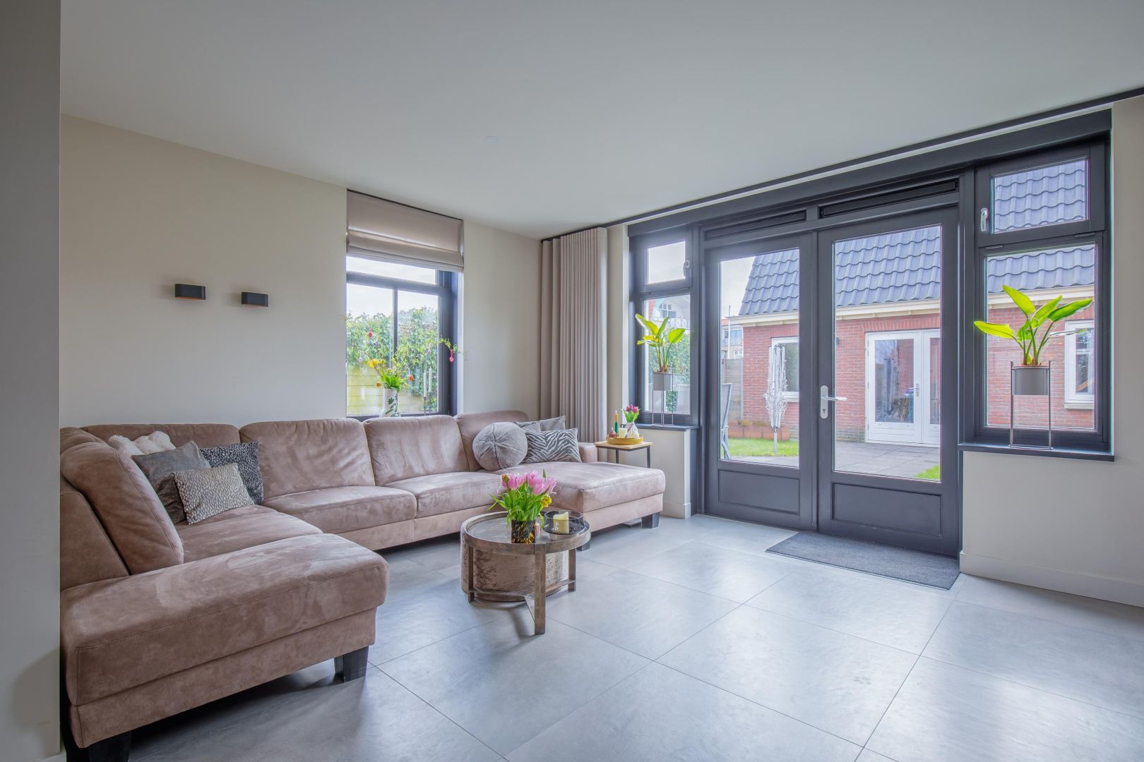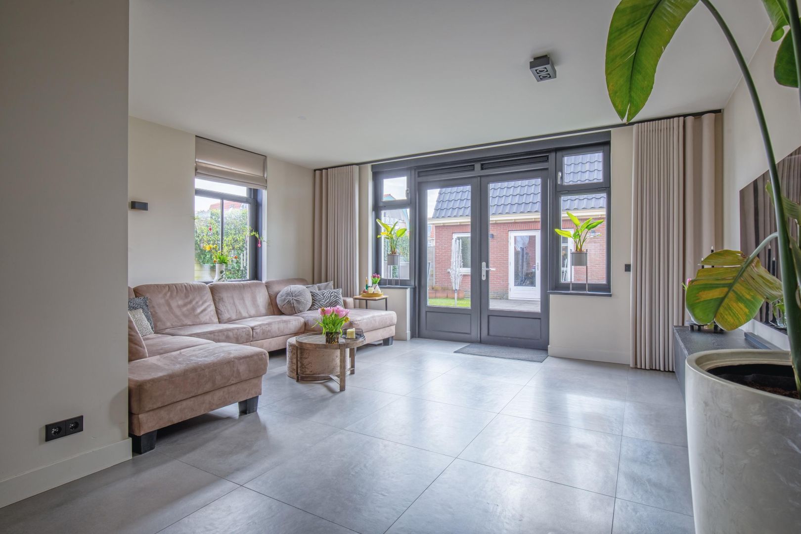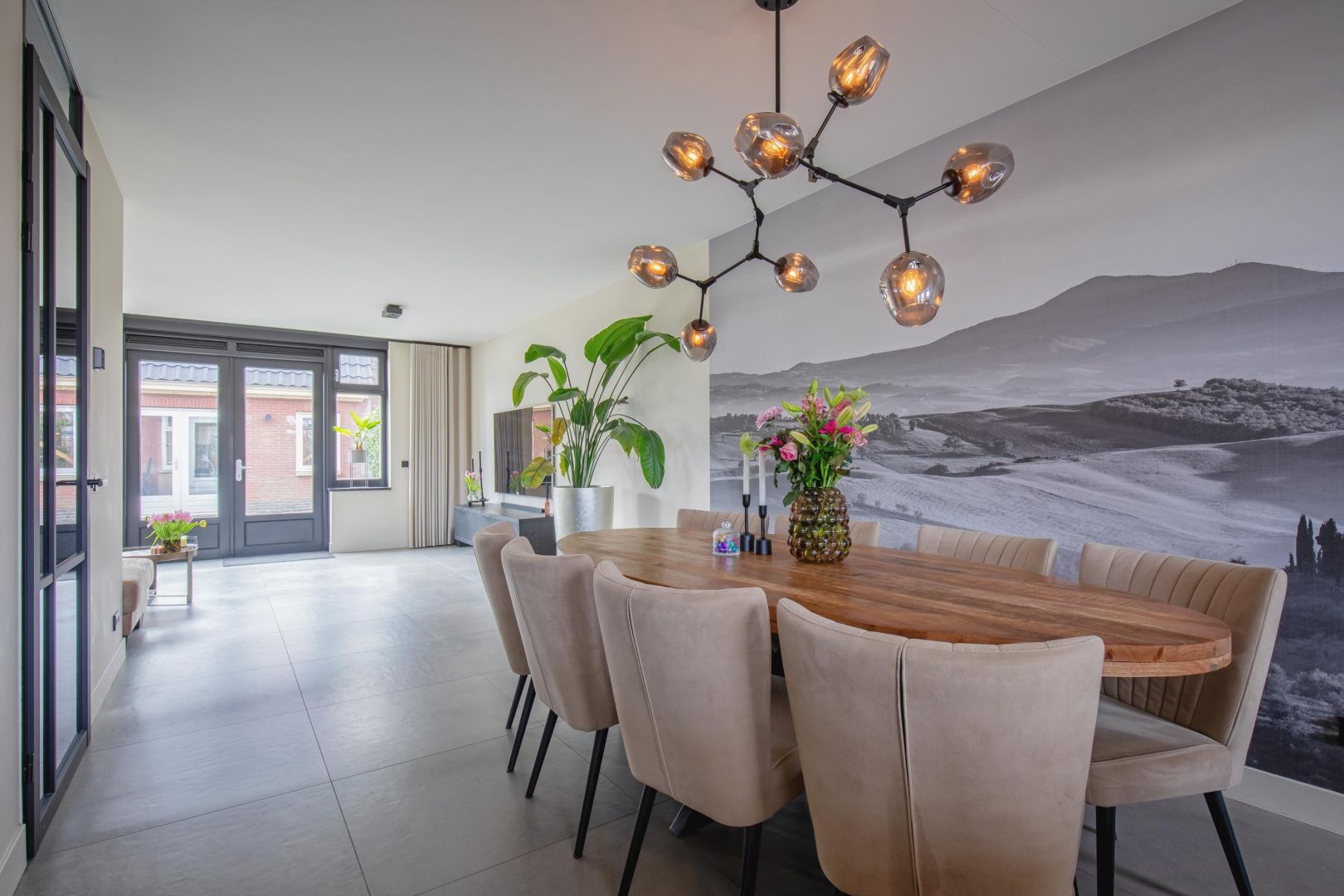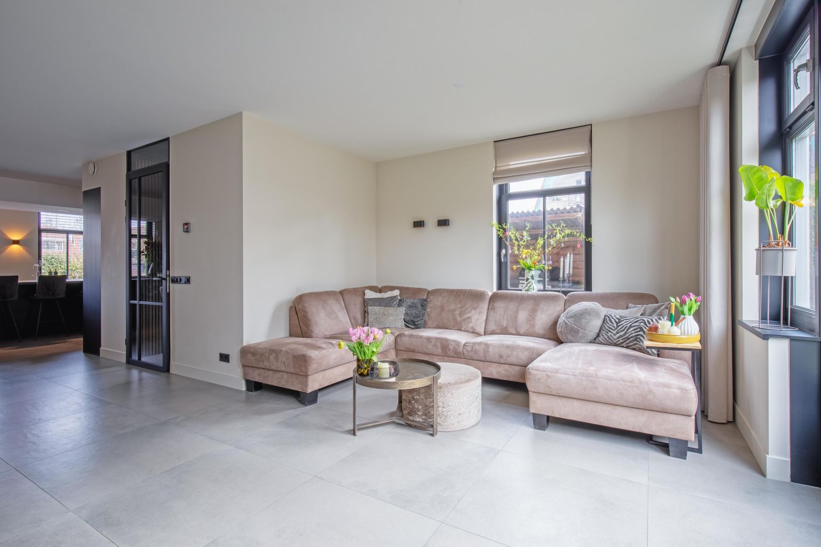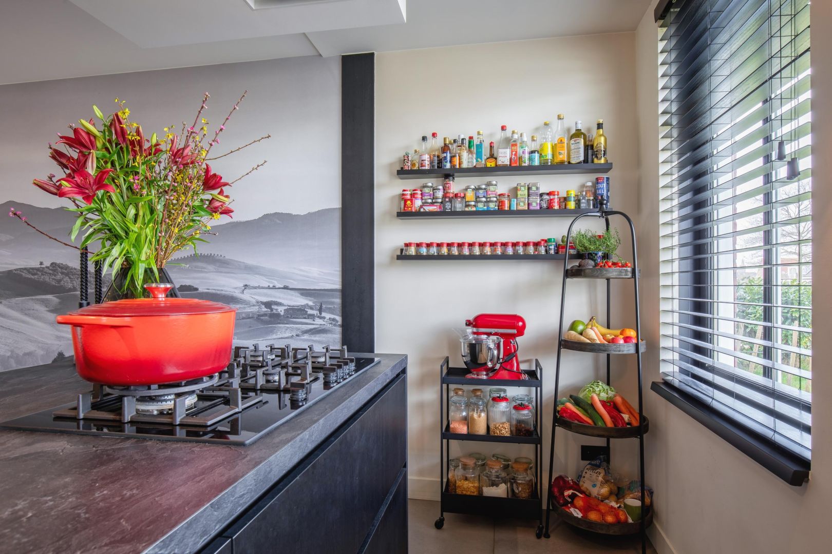 De woonkamer is voorzien van een tegelvloer (met vloerverwarming) en er zijn openslaande deuren naar de tuin. De keuken bevindt zich aan de andere zijde en beschikt over een ruim kookeiland met o.a. spoelbak, Quooker, 5-pits gaskookplaat, afzuigkap en een wijnklimaatkast. De keuken is ook voorzien van stoomoven, combi-oven, vriezer, koelkast en vaatwasser. Tussen de woonkamer en de keuken is de eethoek.