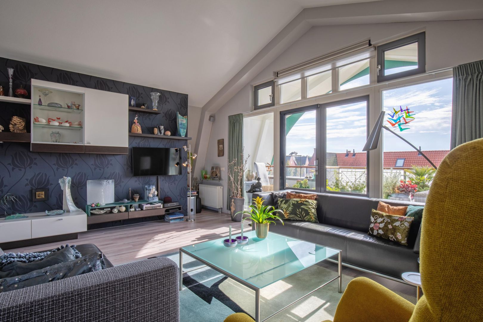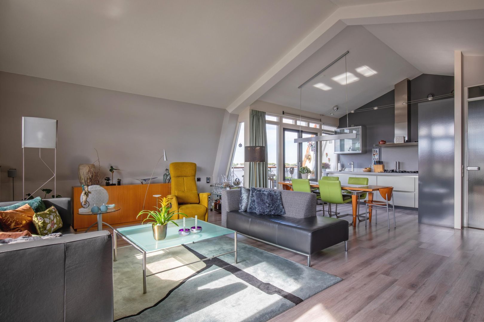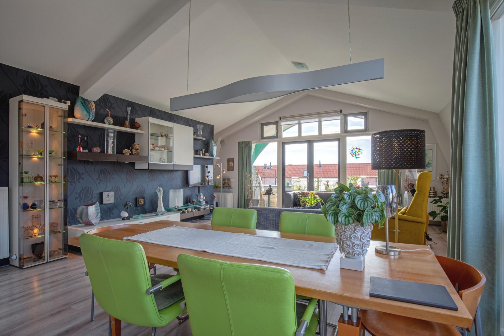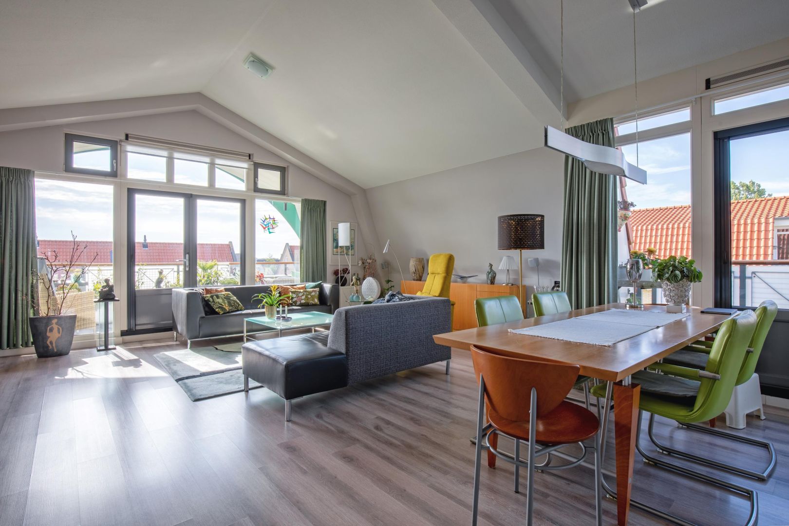 De woonkamer is gesitueerd aan de voorzijde en heeft diverse raampartijen voor een prettig lichtinval. De dakconstructie is zichtbaar, wat de ruimte hoogte, sfeer en karakter geeft. Openslaande deuren geven toegang tot de ruime loggia (gelegen op het zuidwesten) aan de voorzijde, waar u heerlijk kunt loungen.