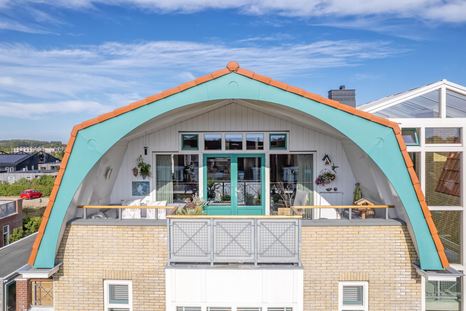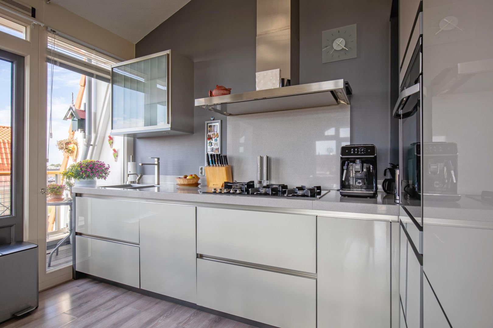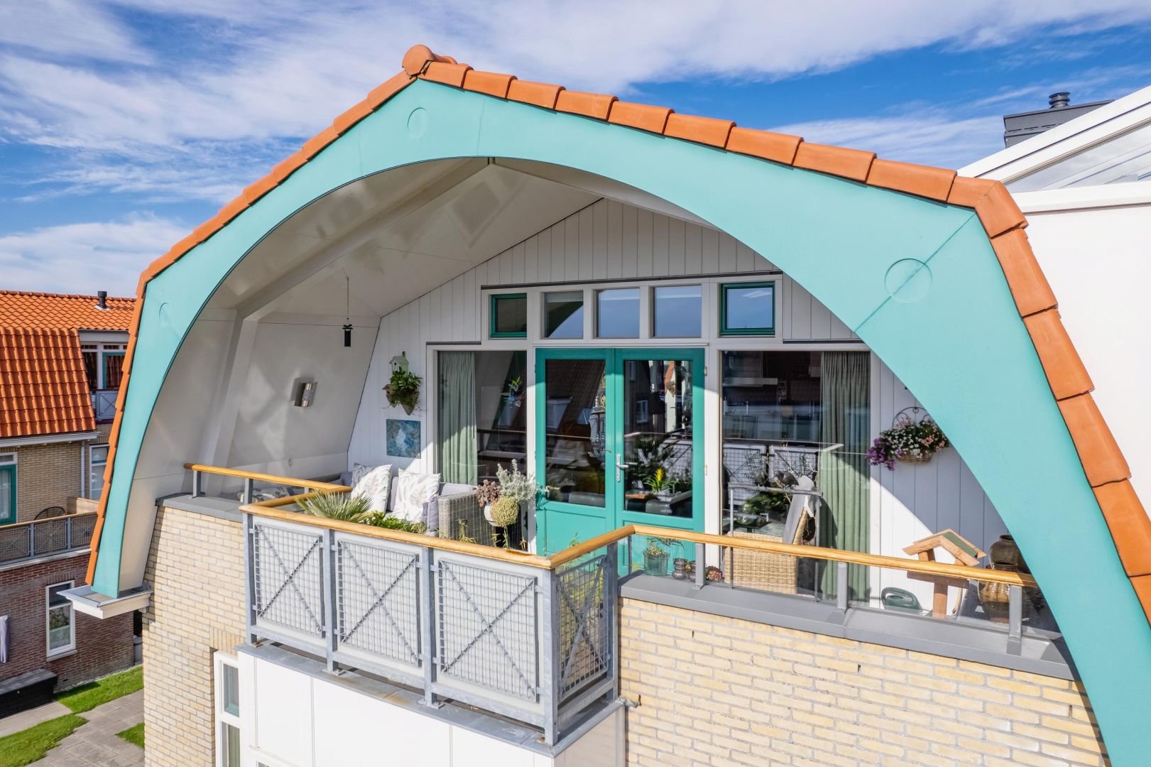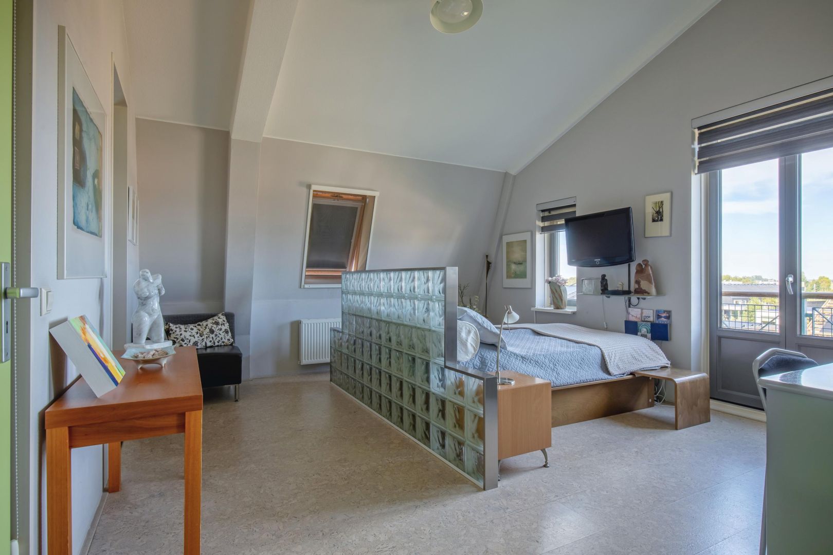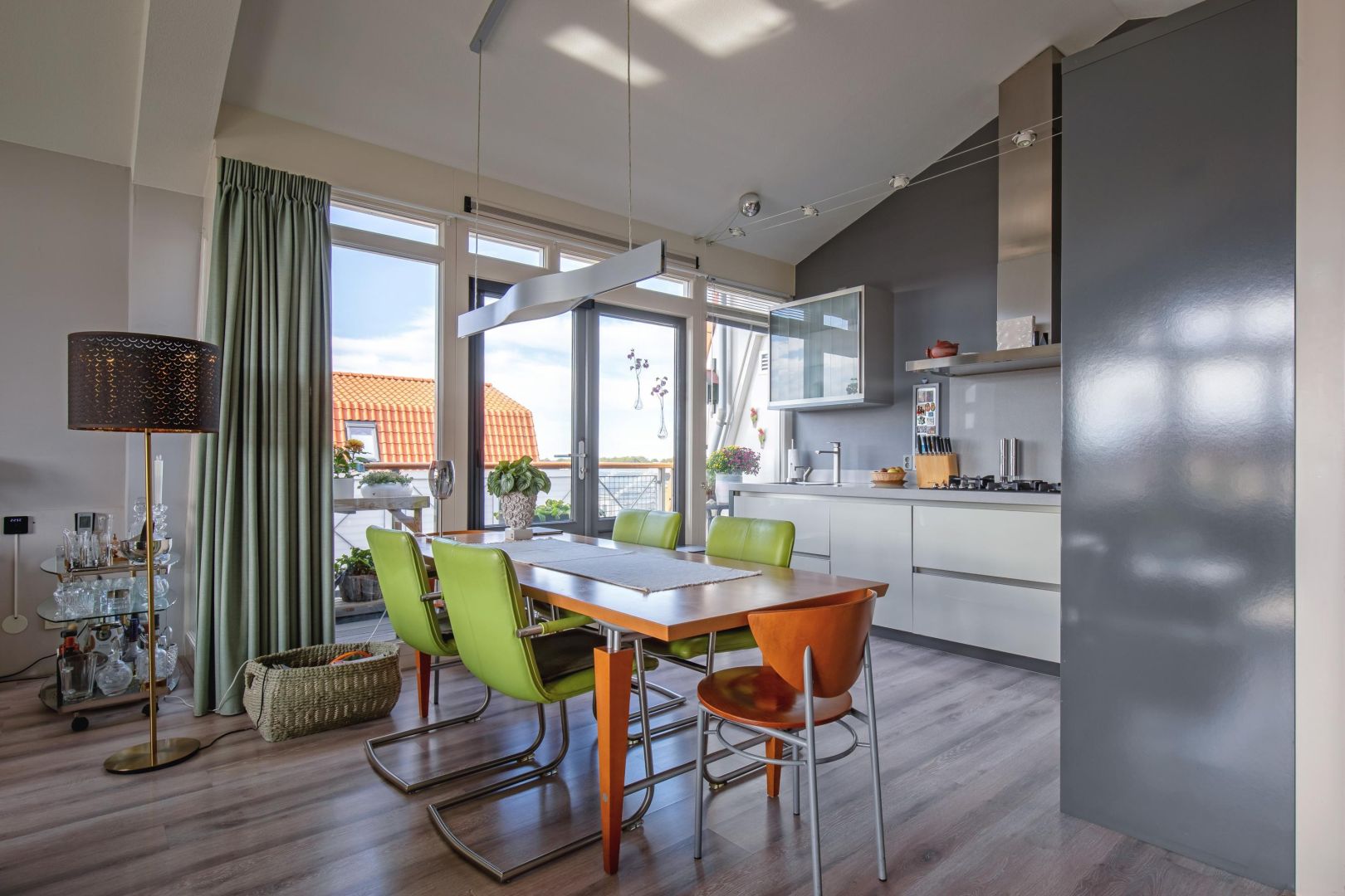 De woonkamer is gesitueerd aan de voorzijde en heeft diverse raampartijen voor een prettig lichtinval. De dakconstructie is zichtbaar, wat de ruimte hoogte, sfeer en karakter geeft. Openslaande deuren geven toegang tot de ruime loggia (gelegen op het zuidwesten) aan de voorzijde, waar u heerlijk kunt loungen.