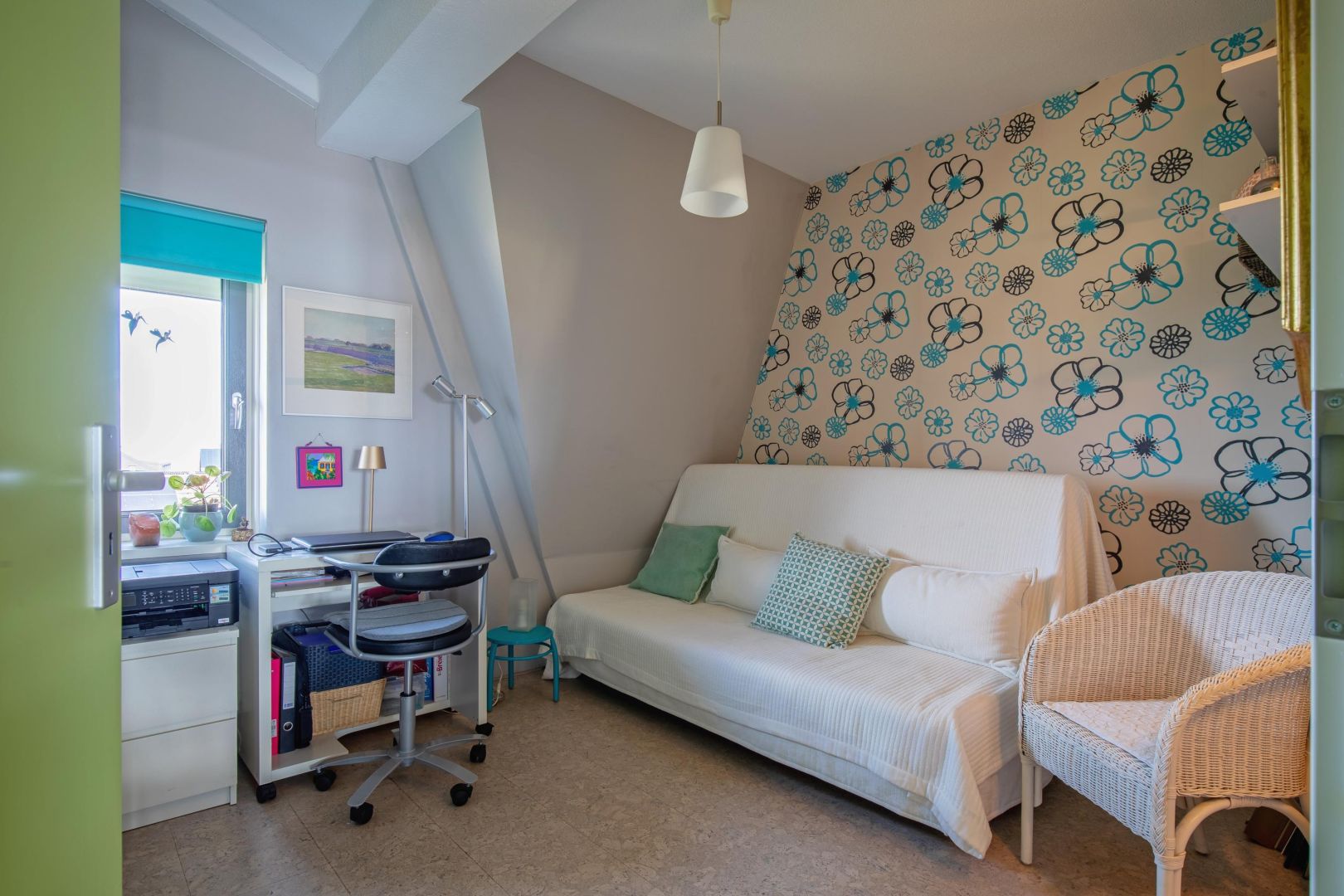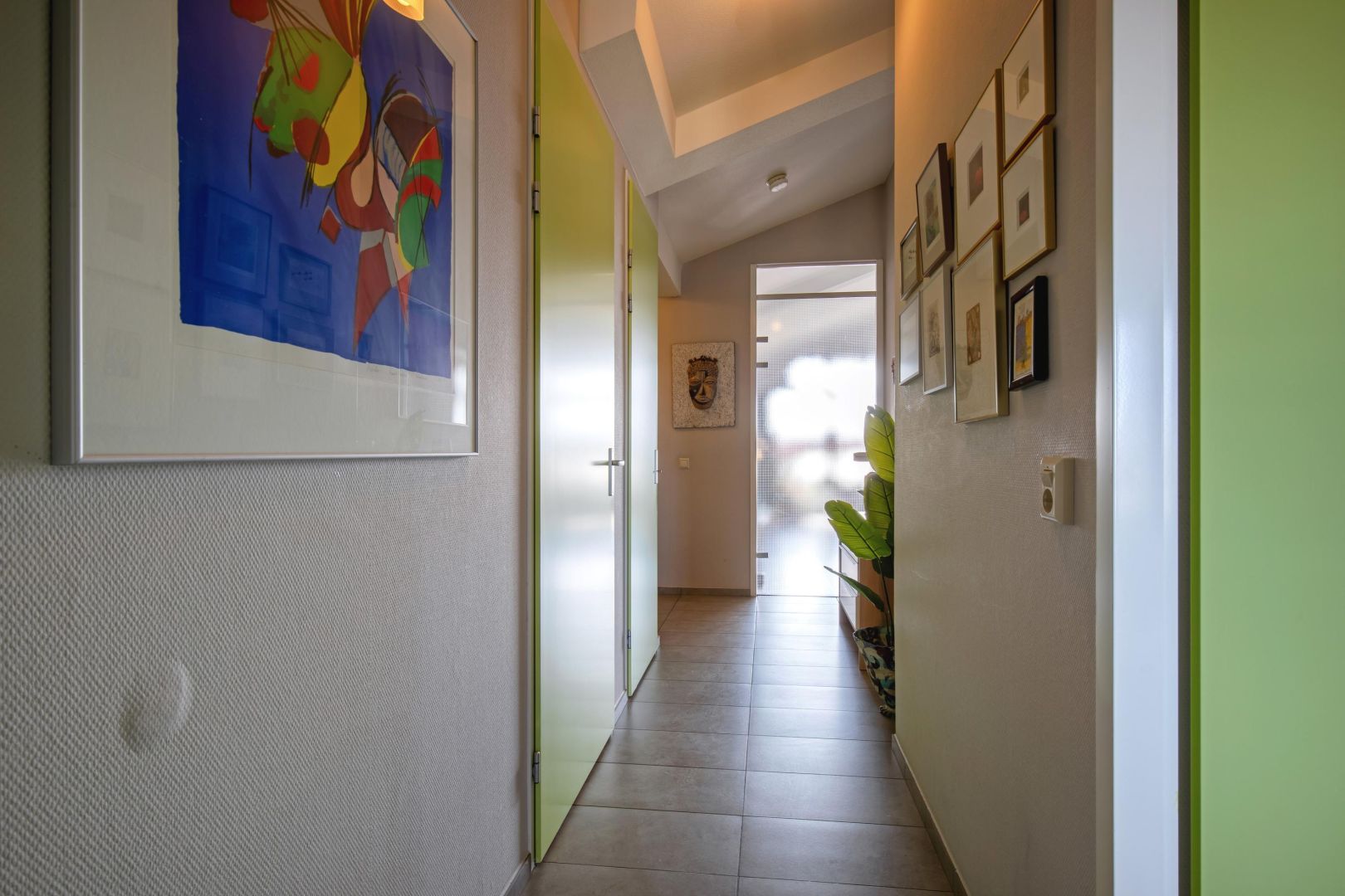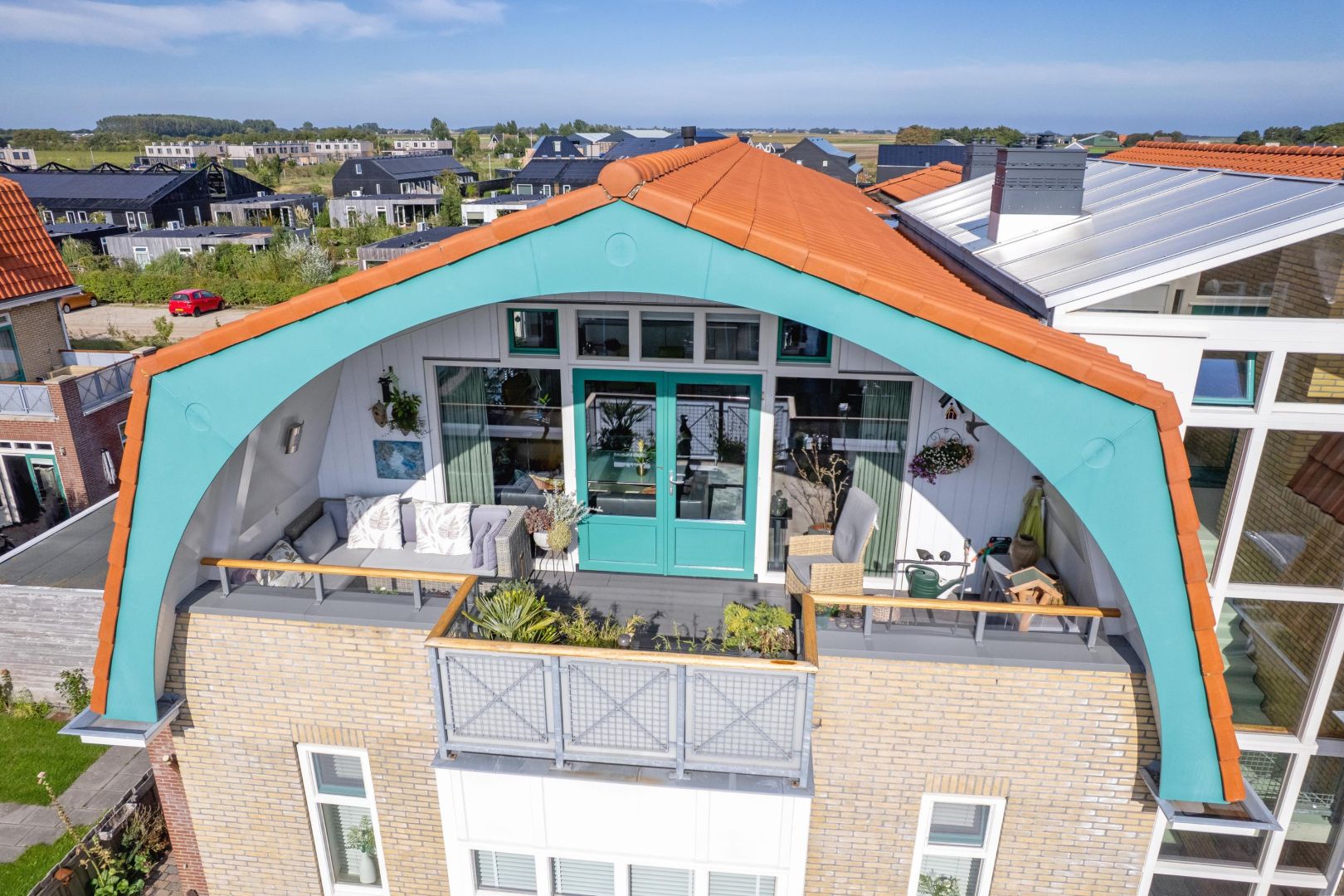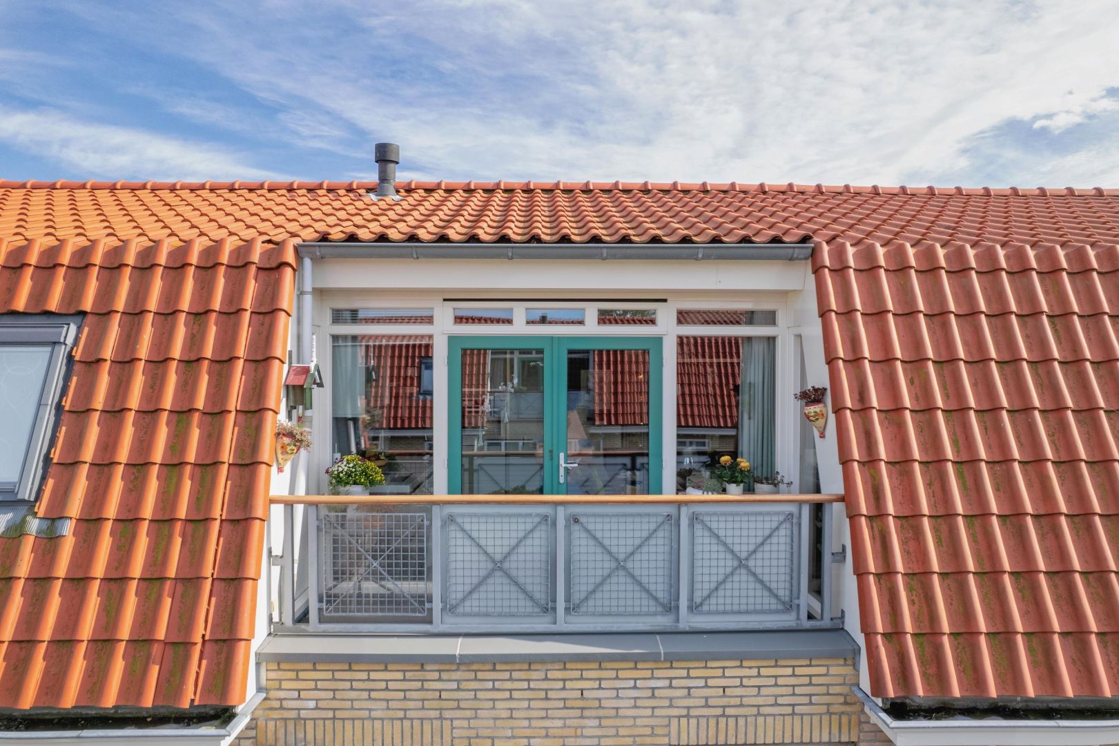 De woonkamer is gesitueerd aan de voorzijde en heeft diverse raampartijen voor een prettig lichtinval. De dakconstructie is zichtbaar, wat de ruimte hoogte, sfeer en karakter geeft. Openslaande deuren geven toegang tot de ruime loggia (gelegen op het zuidwesten) aan de voorzijde, waar u heerlijk kunt loungen.