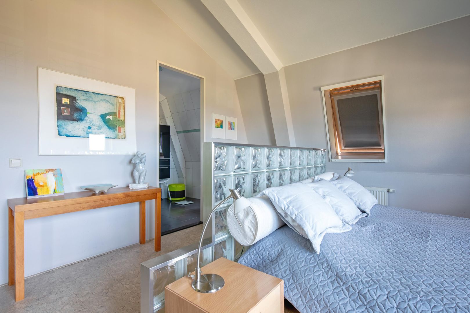 De ruime 2-persoons slaapkamer (met een frans balkon) beschikt over een ruime inloopkast en toegang tot de privé badkamer, voorzien van douche, wastafelmeubel en vrijdragend toilet.