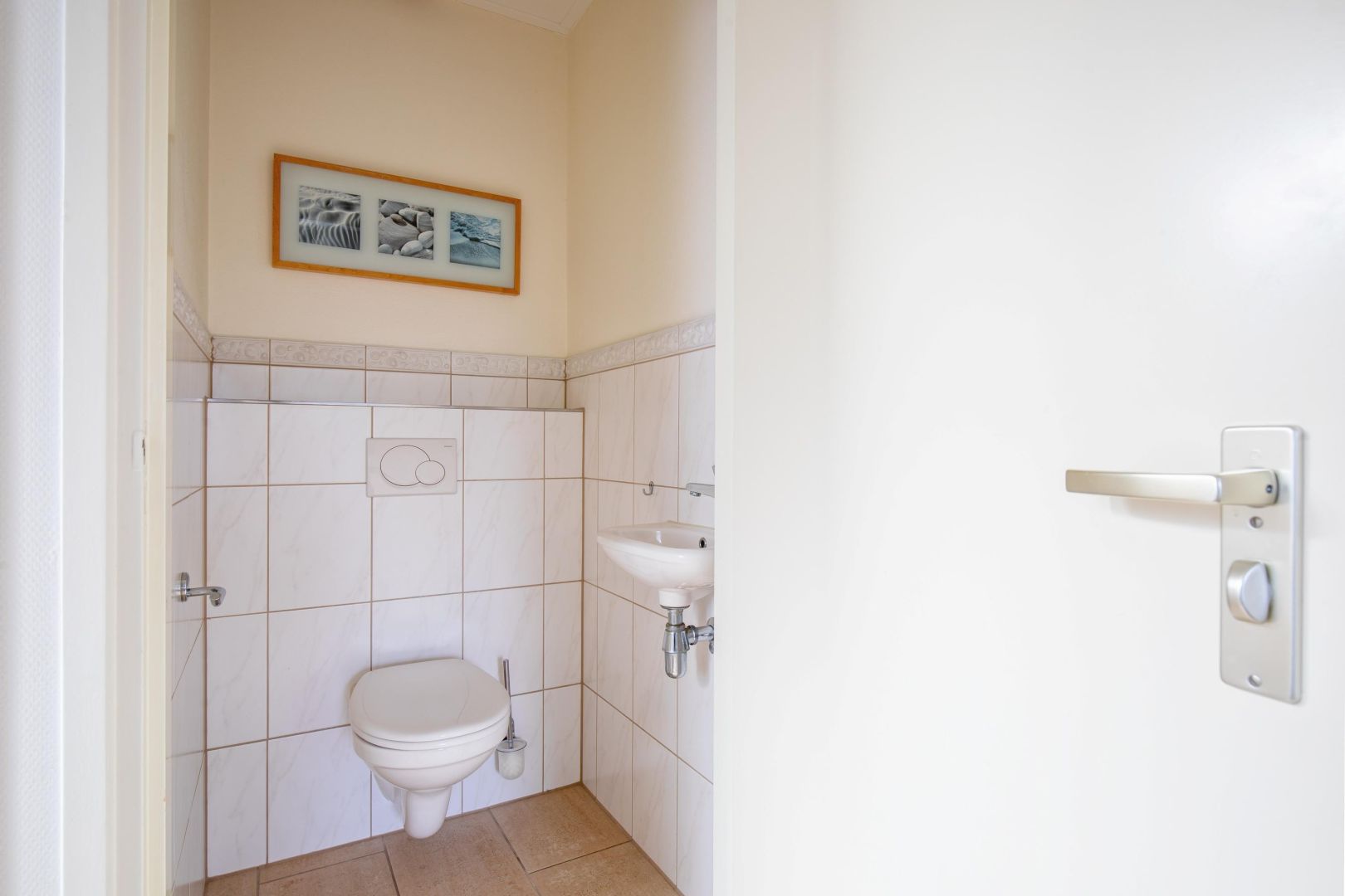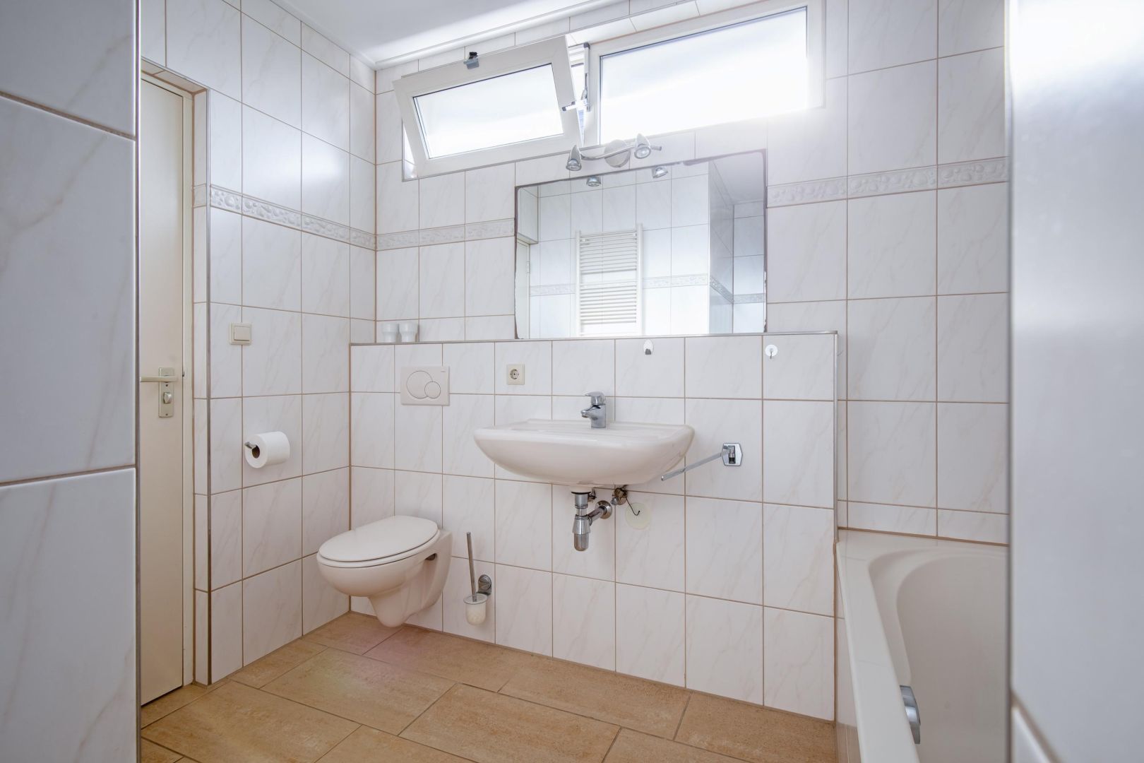 De badkamer is voorzien van een ligbad, douche, wastafel en vrijdragend toilet. Daarnaast is er ook een separate toiletruimte met een vrijdragend toilet en fonteintje.