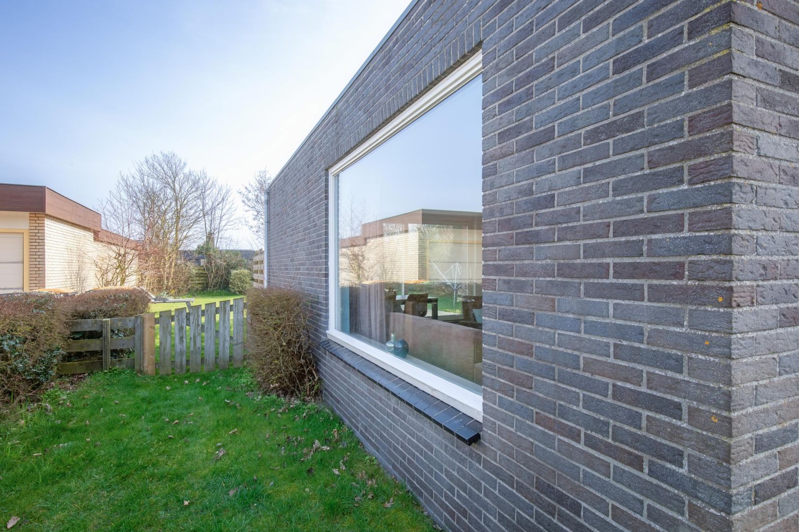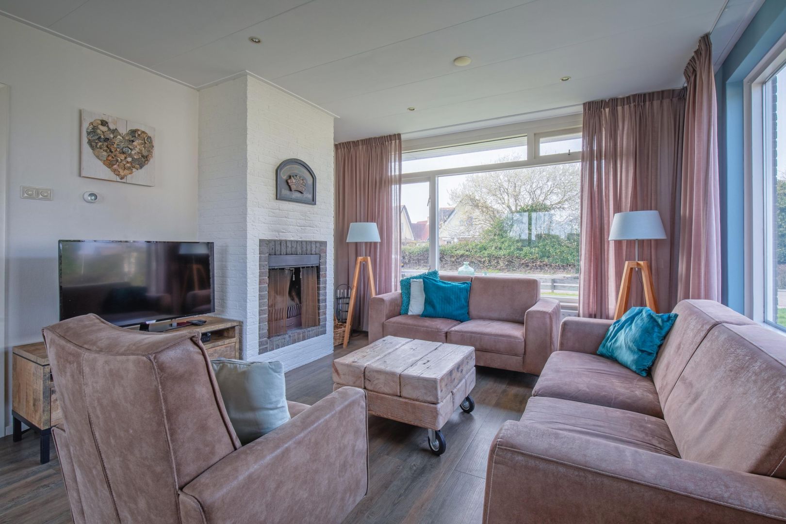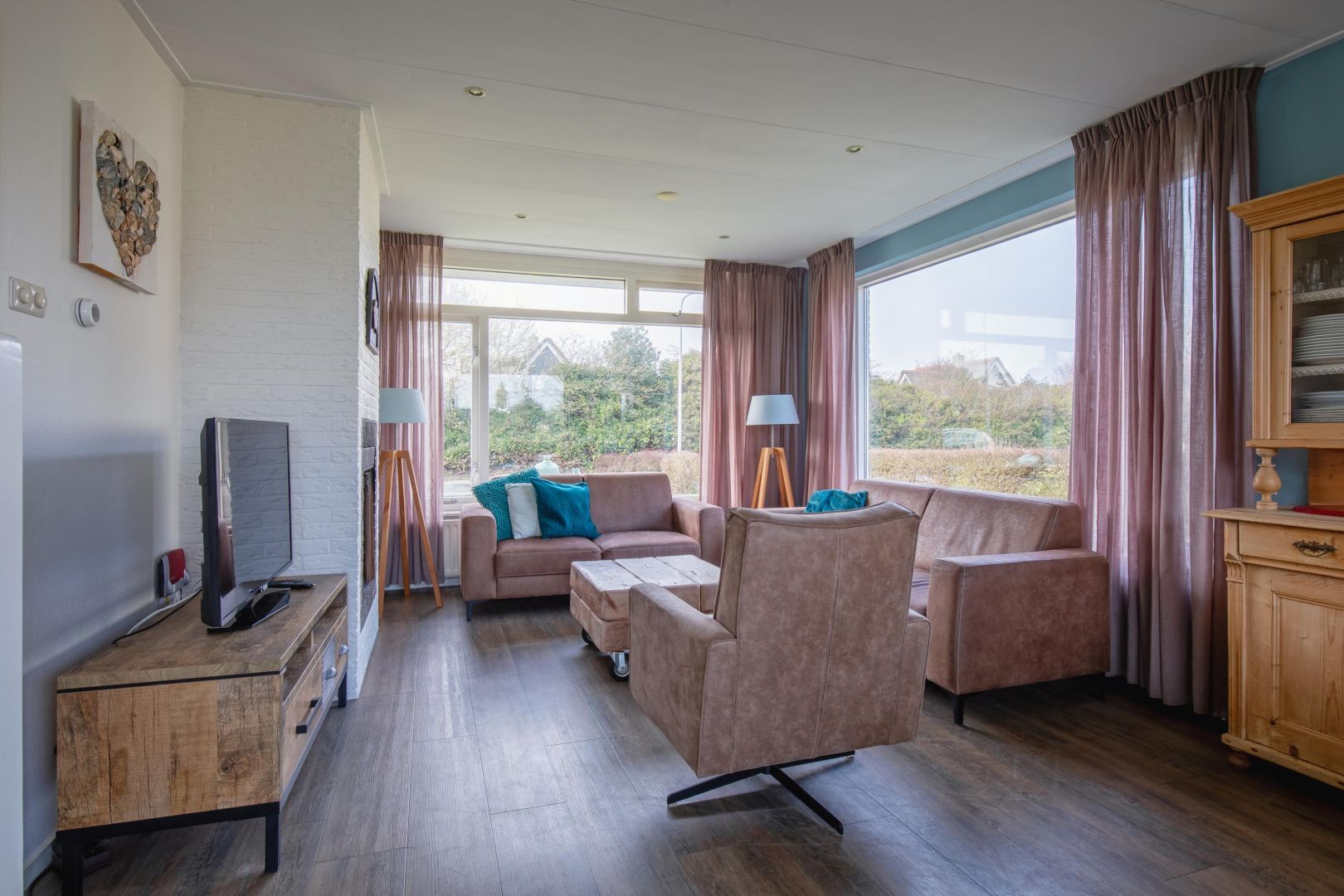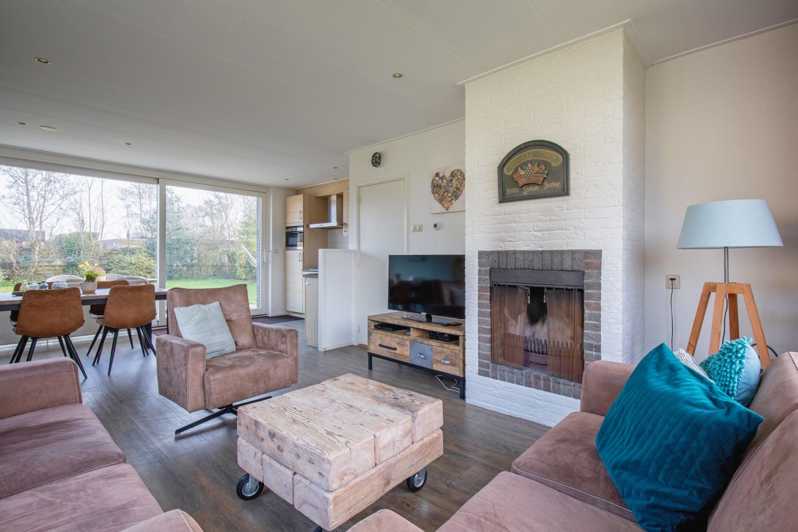 De straatgerichte woonkamer is gezellig ingericht met een haard en naast de woonkamer is de eethoek met een schuifpui naar de tuin.
