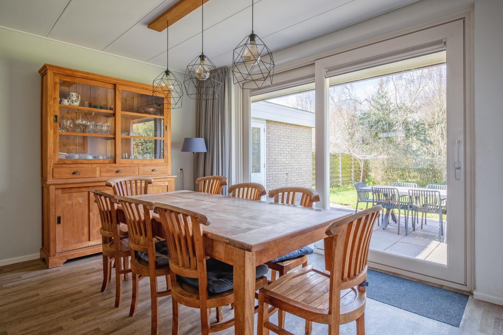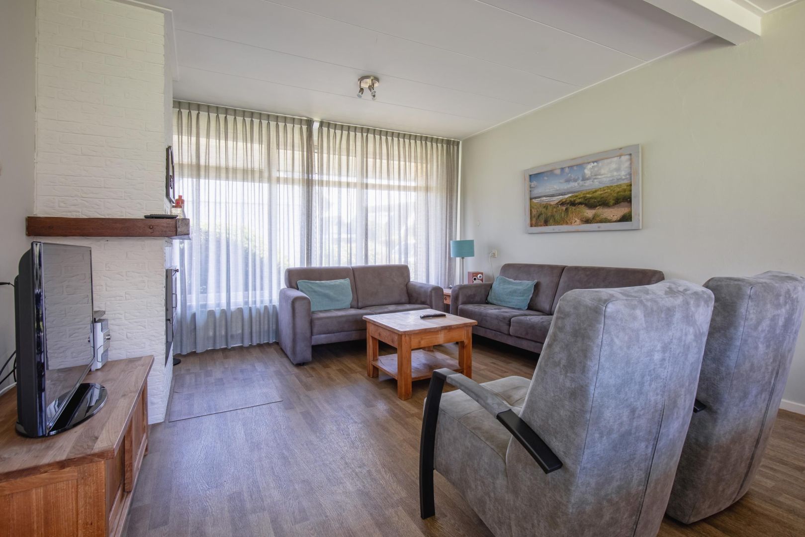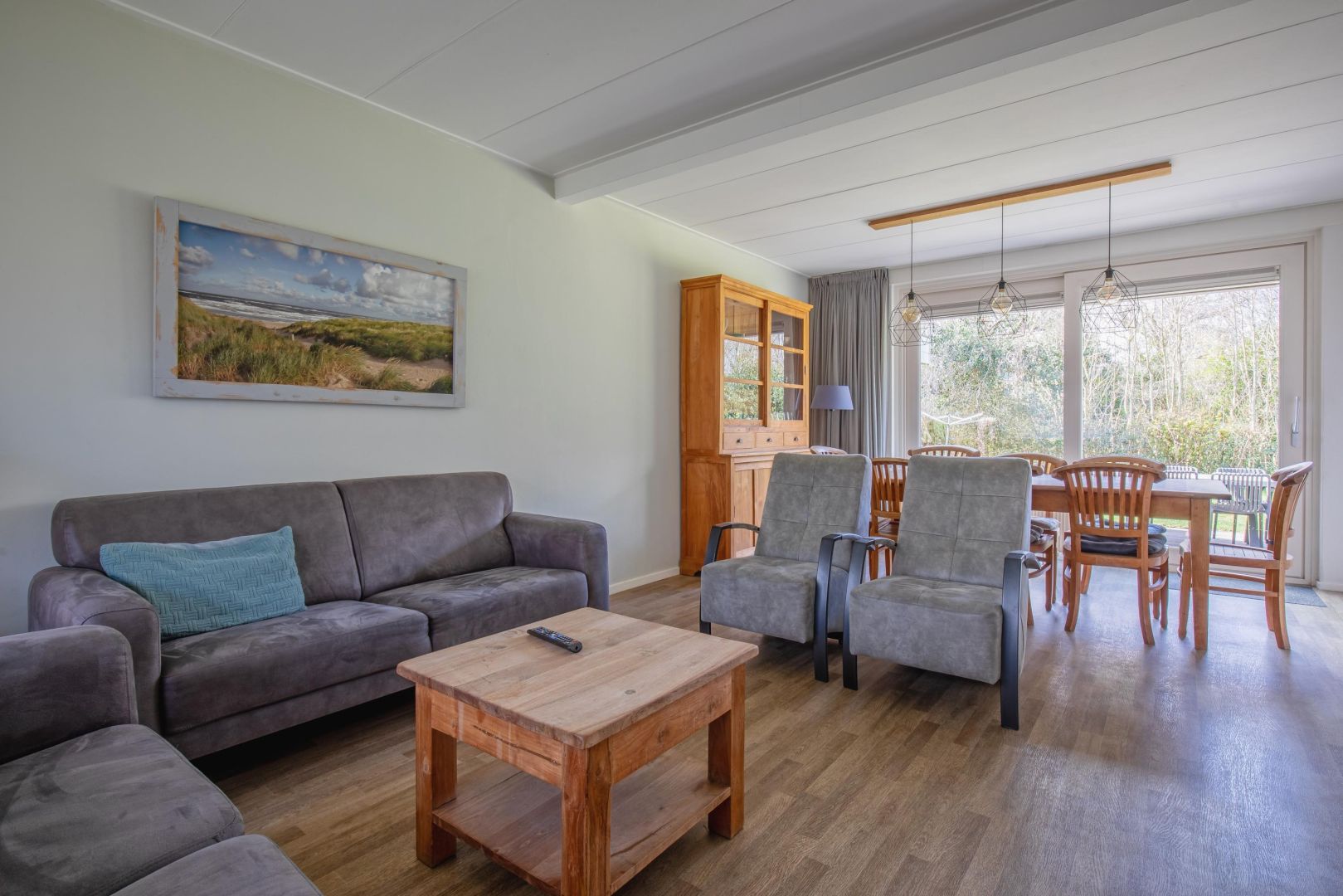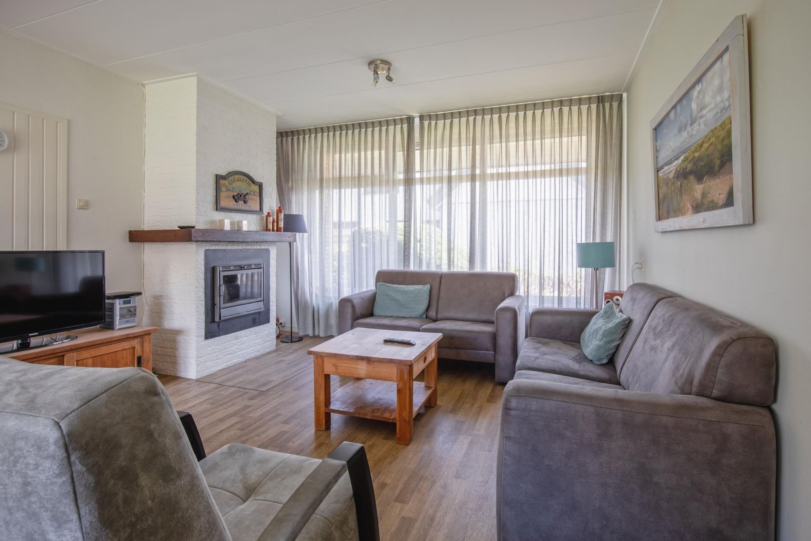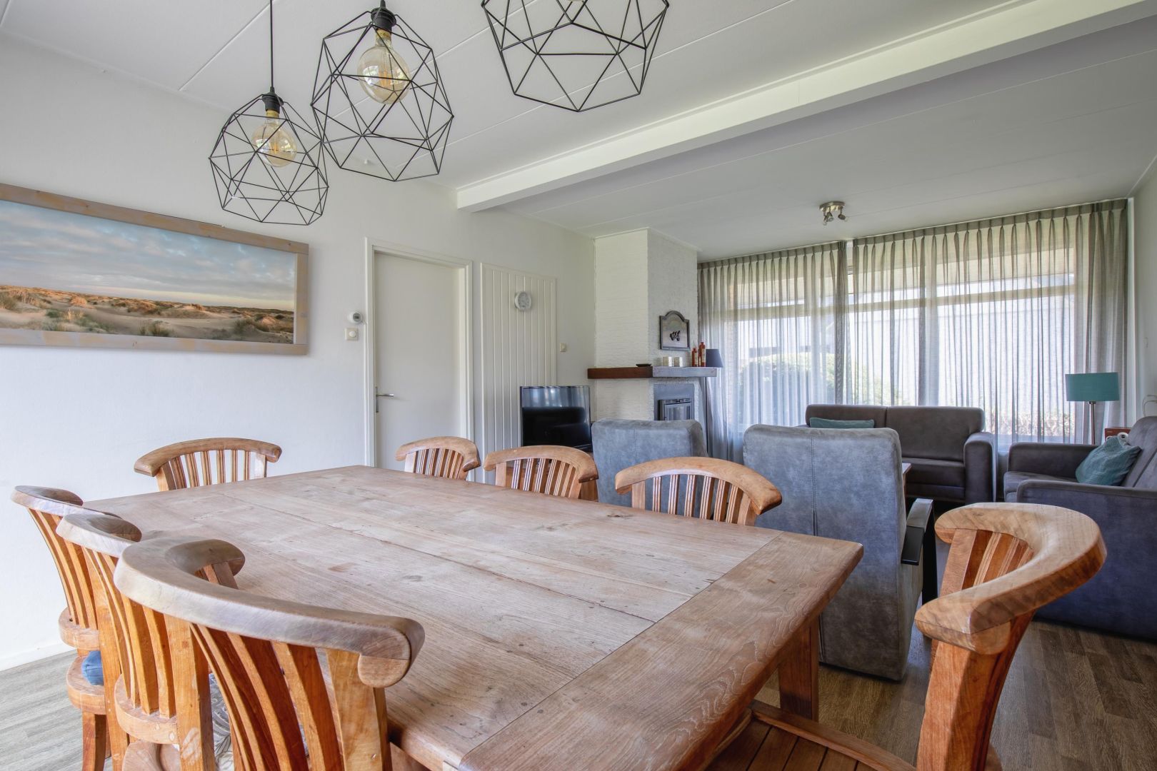De woonkamer is sfeervol en voorzien van een haard – dé plek voor knusse avonden. Aansluitend vind je de eethoek met schuifpui naar de tuin.