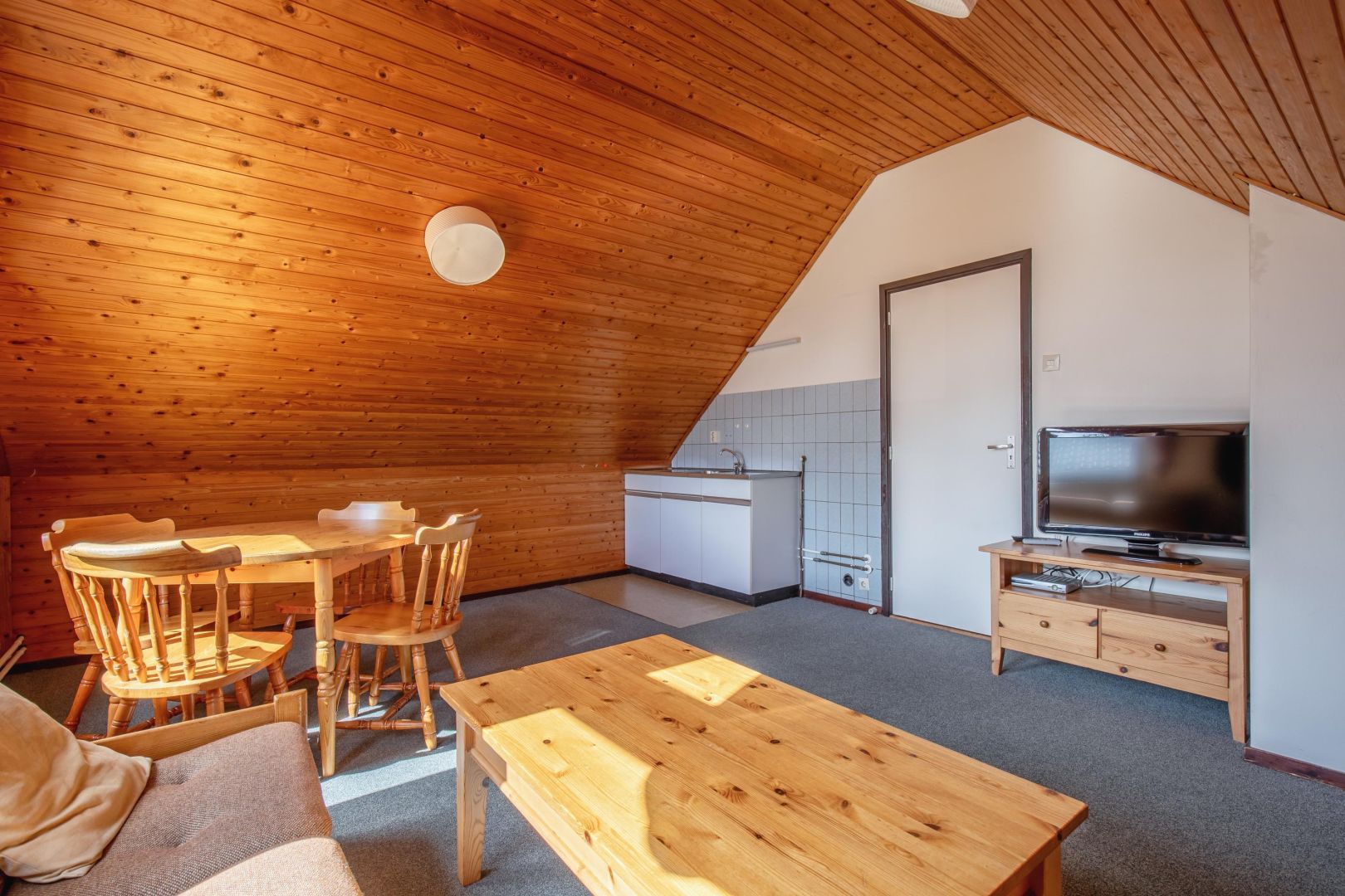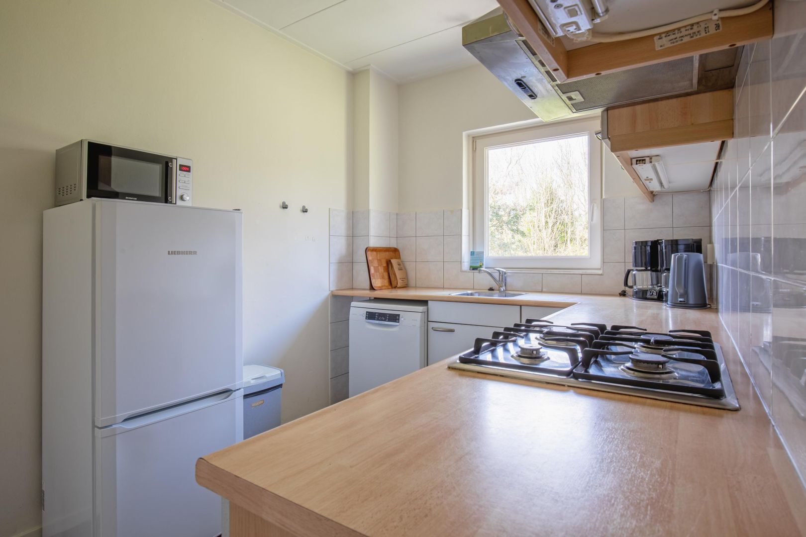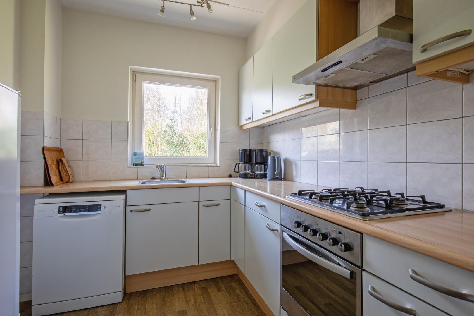De keuken is uitgevoerd in een hoekopstelling en van alle gemakken voorzien, waaronder een gaskookplaat, afzuigkap, magnetron, koelkast en vaatwasser.