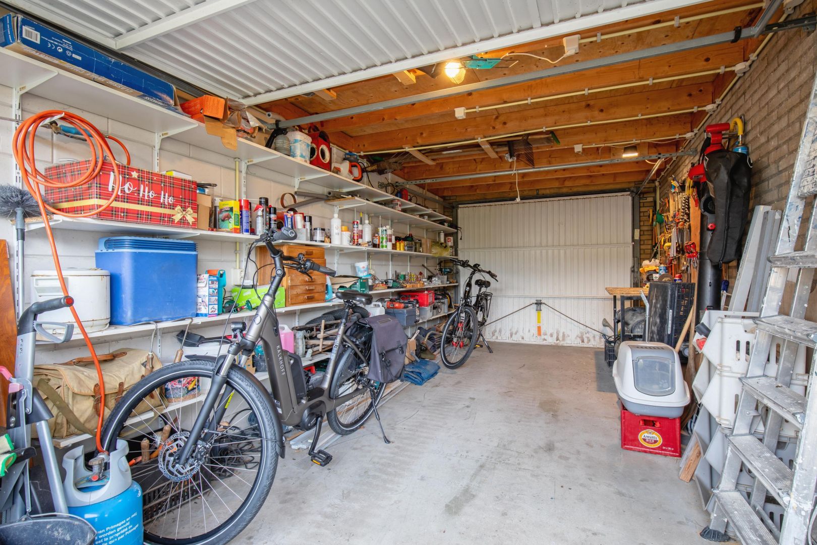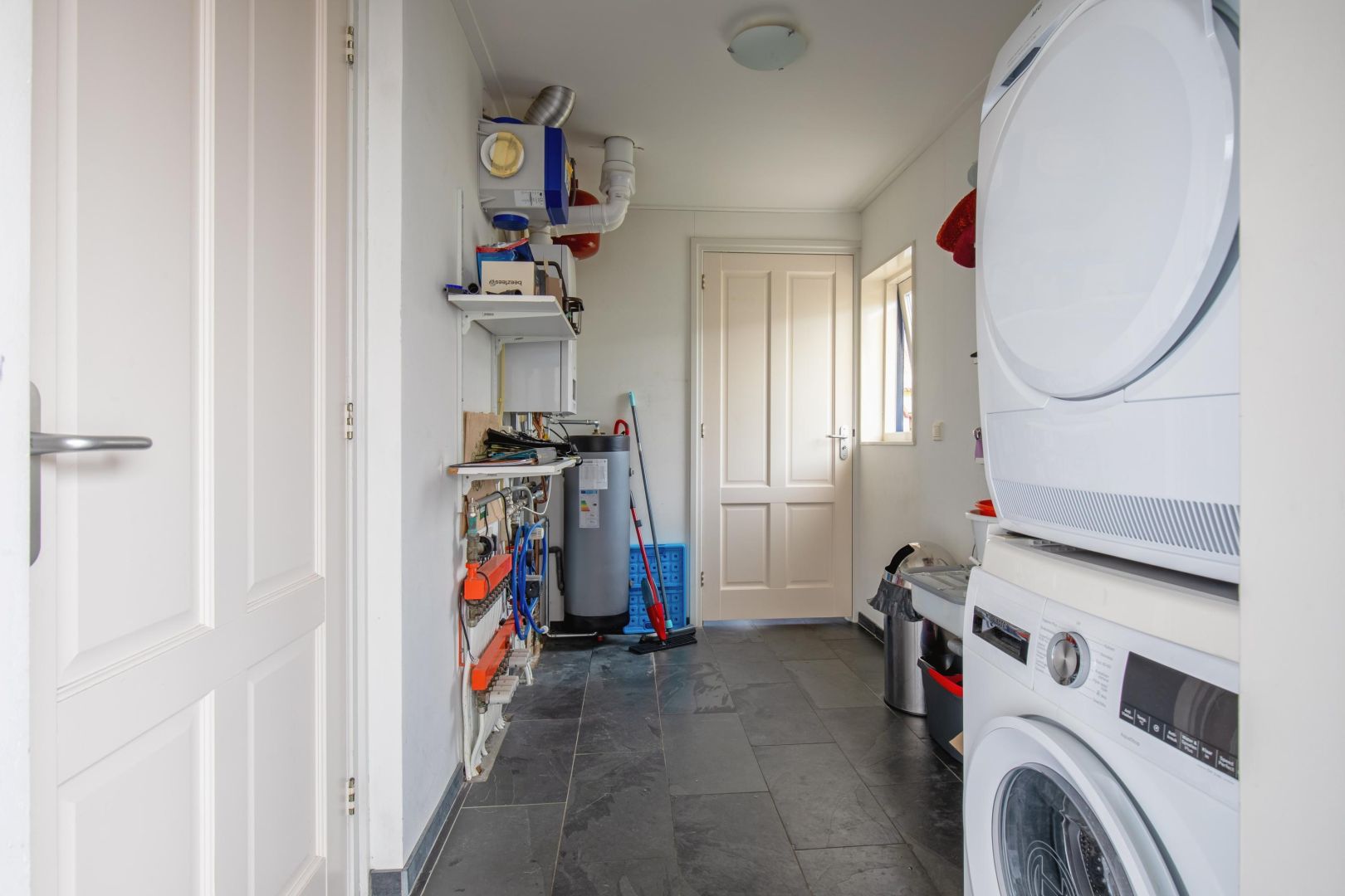 In de bijkeuken is de opstelling van de hybride warmtepomp/cv-ketel (2023) en aansluitingen voor een wasmachine/droger. Hier bevindt zich tevens een badkamer met douche, toilet en wastafel.