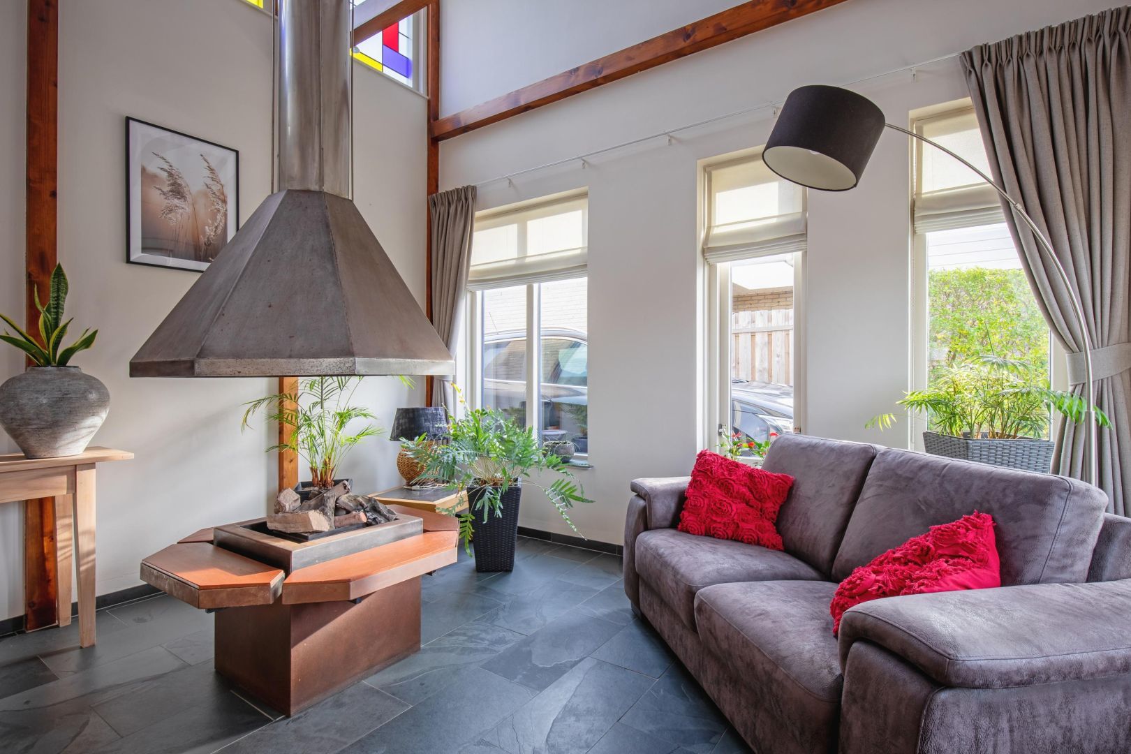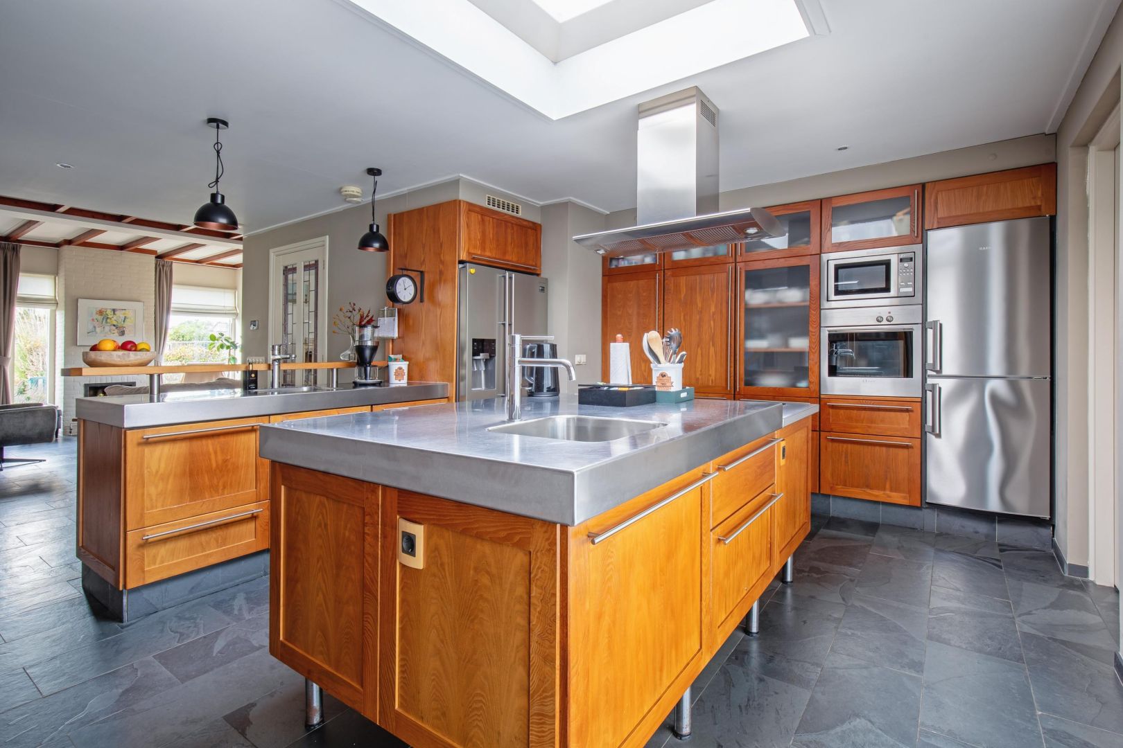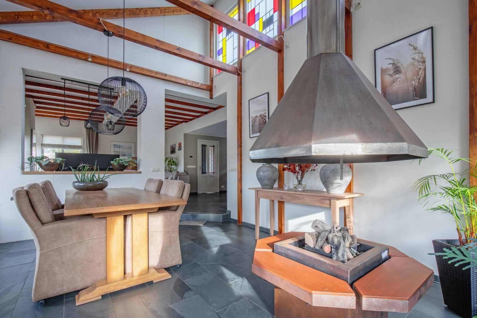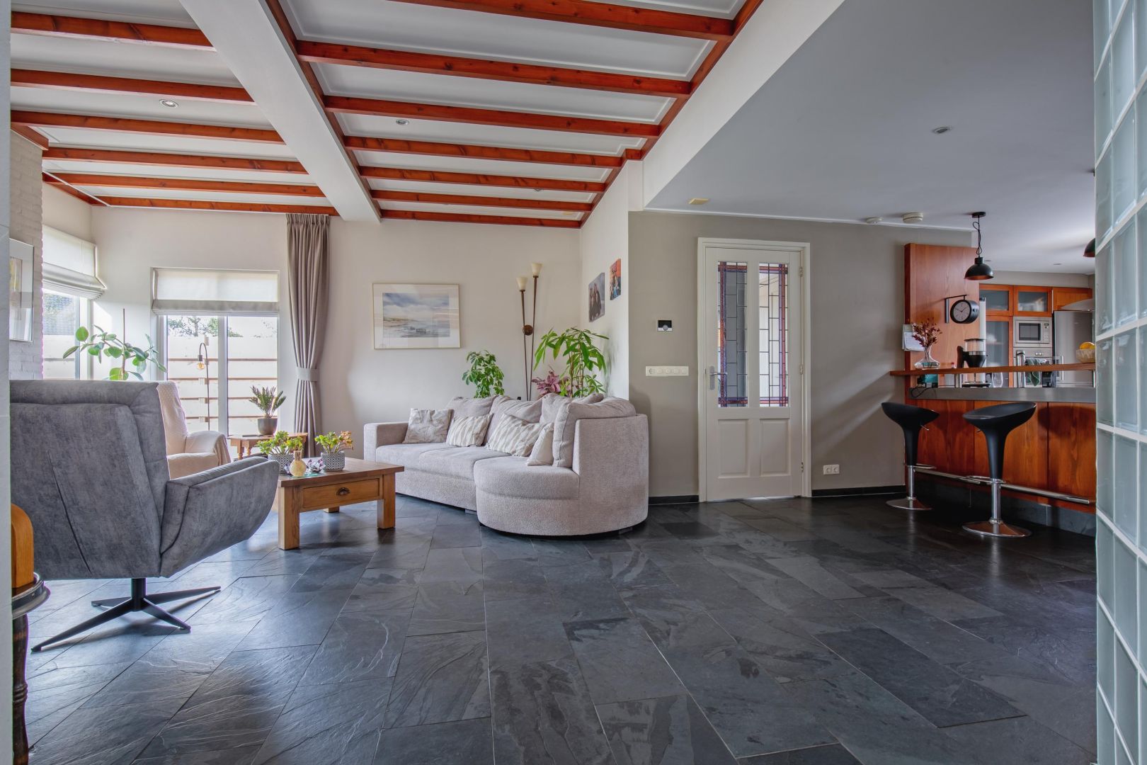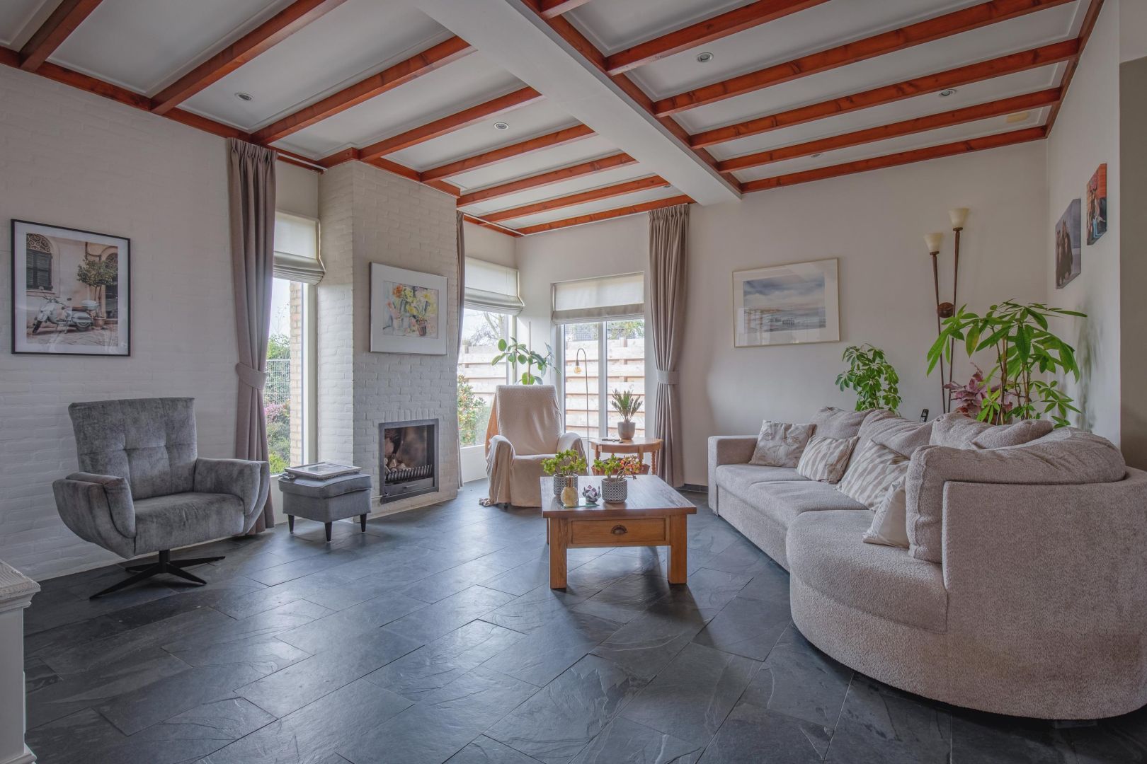De lichte woonkamer met leisteenvloer is speels ingedeeld met twee vloeren op verschillende niveaus (ca. 15 cm verschil) en beschikt over twee gasgestookte haarden. De grote raampartijen zorgen voor veel natuurlijk licht en een prettig gevoel van ruimte.