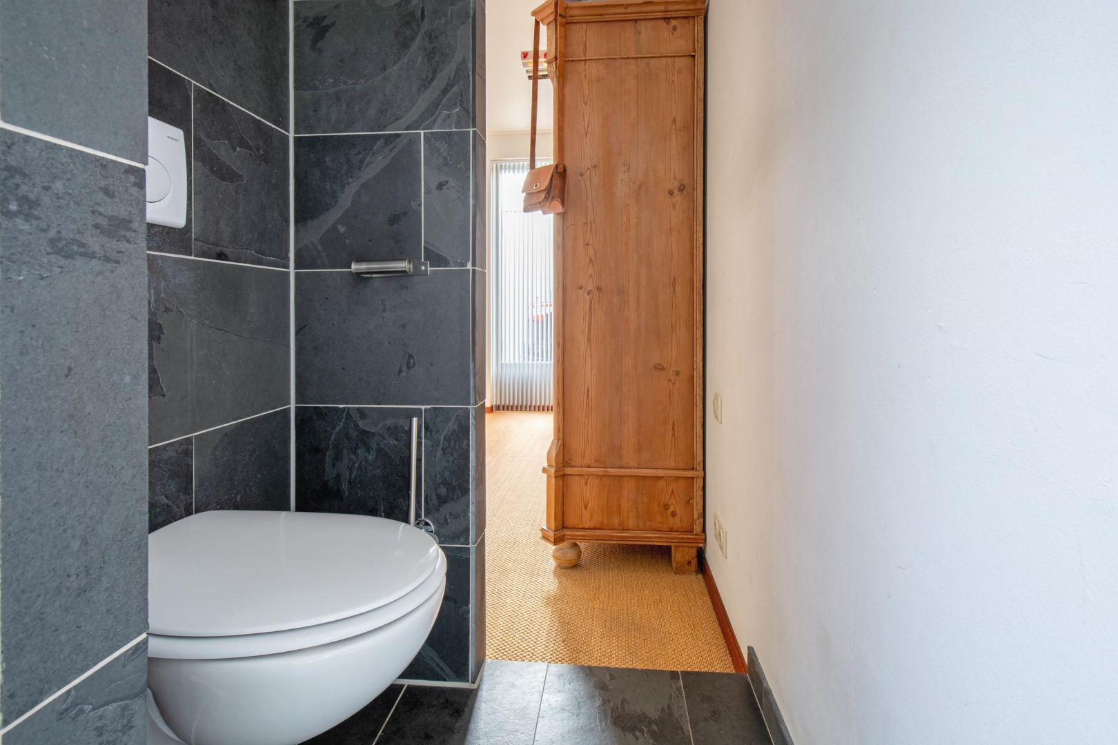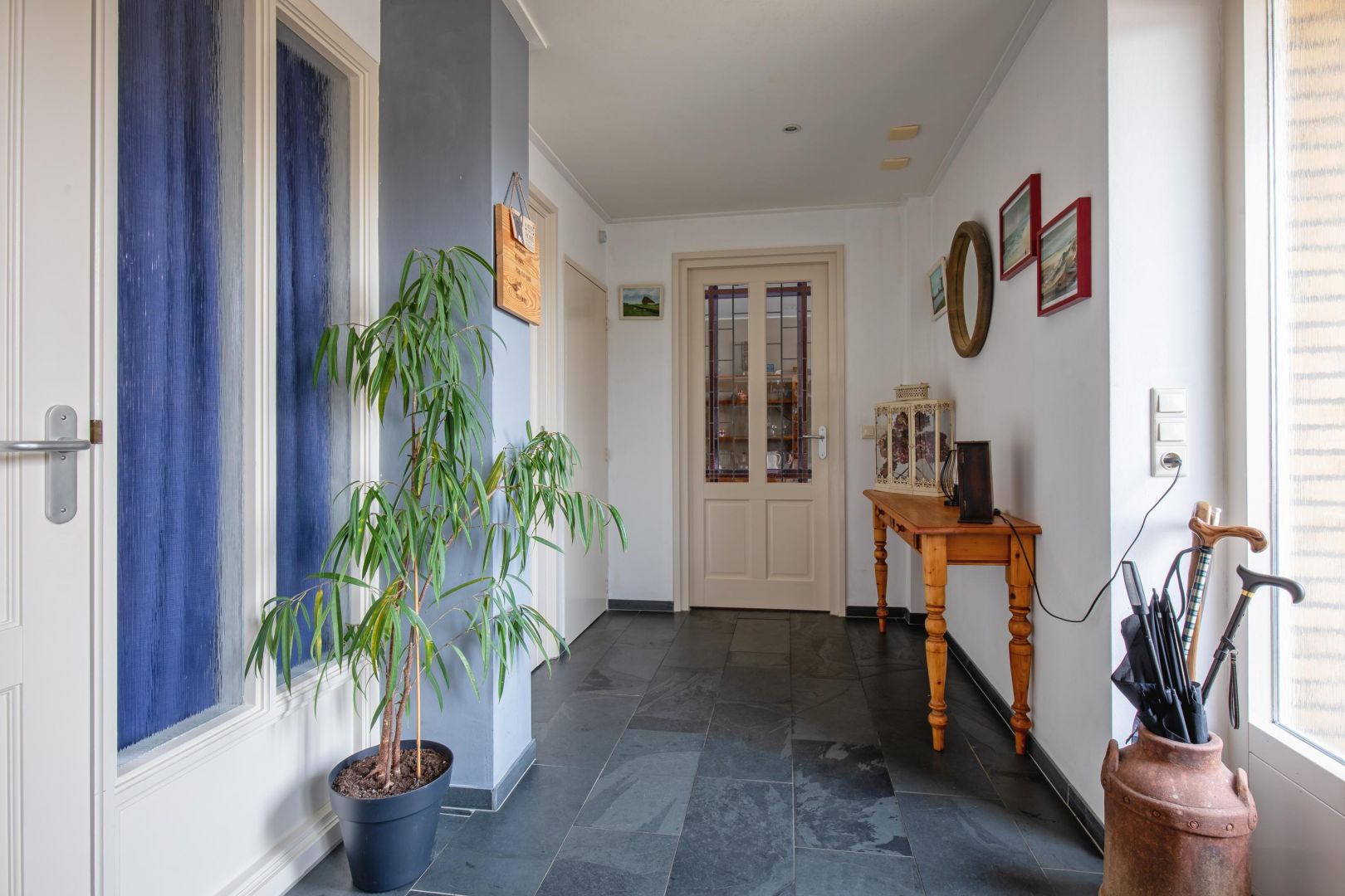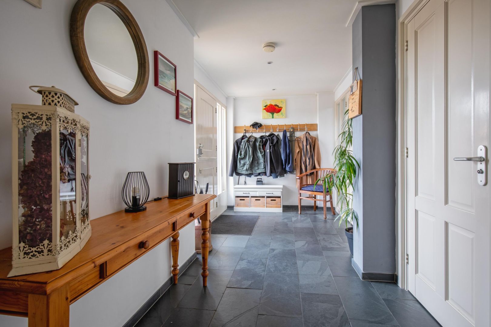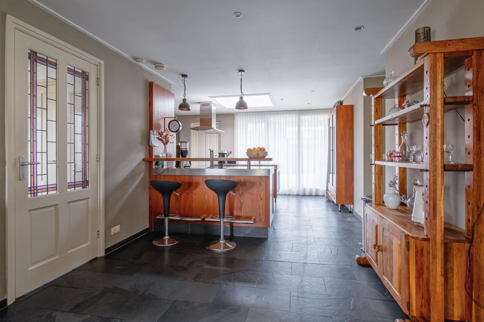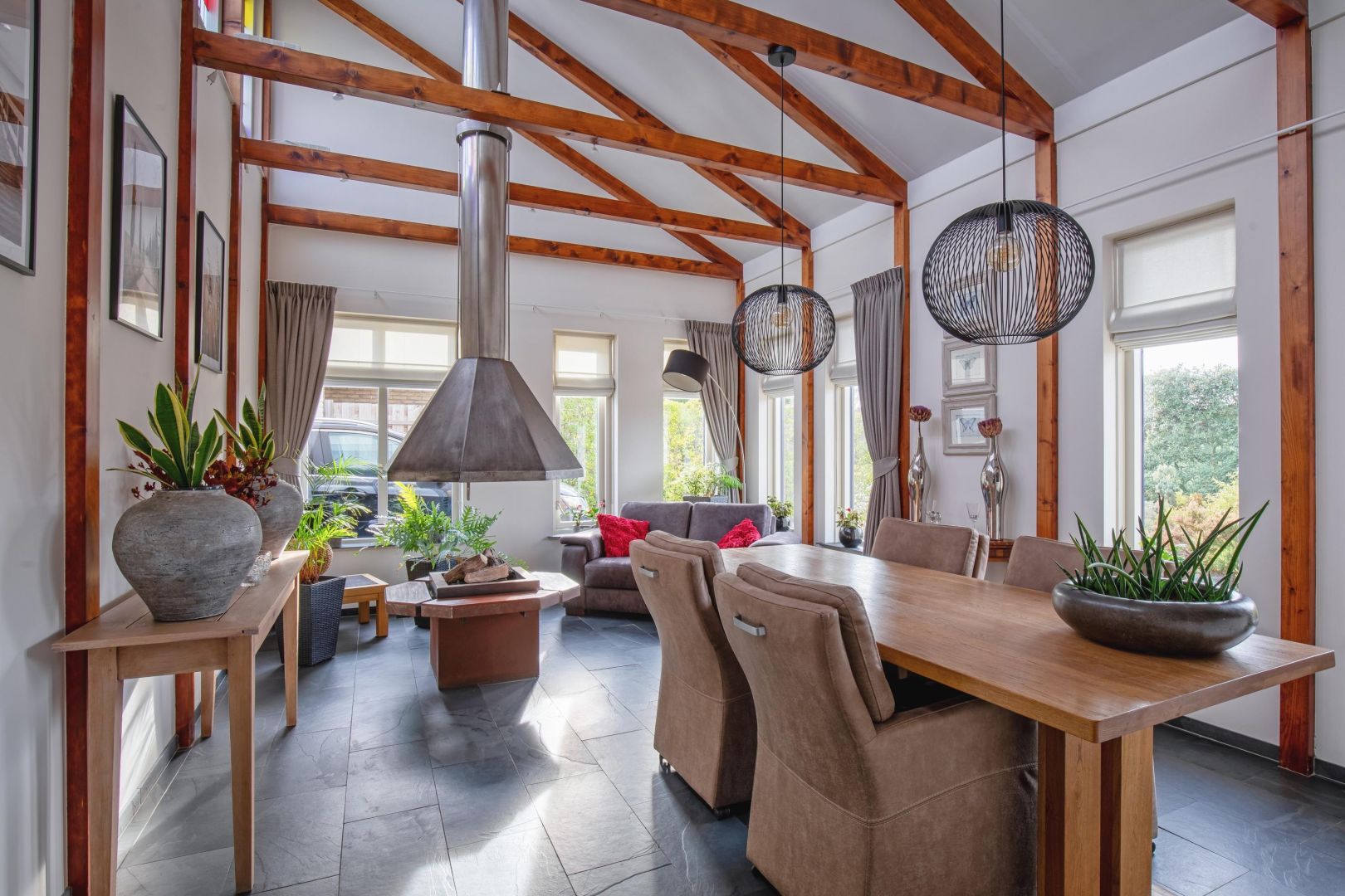 De lichte woonkamer met leisteenvloer is speels ingedeeld met twee vloeren op verschillende niveaus (ca. 15 cm verschil) en beschikt over twee gasgestookte haarden. De grote raampartijen zorgen voor veel natuurlijk licht en een prettig gevoel van ruimte.