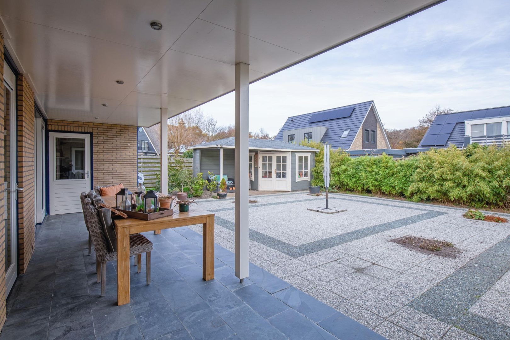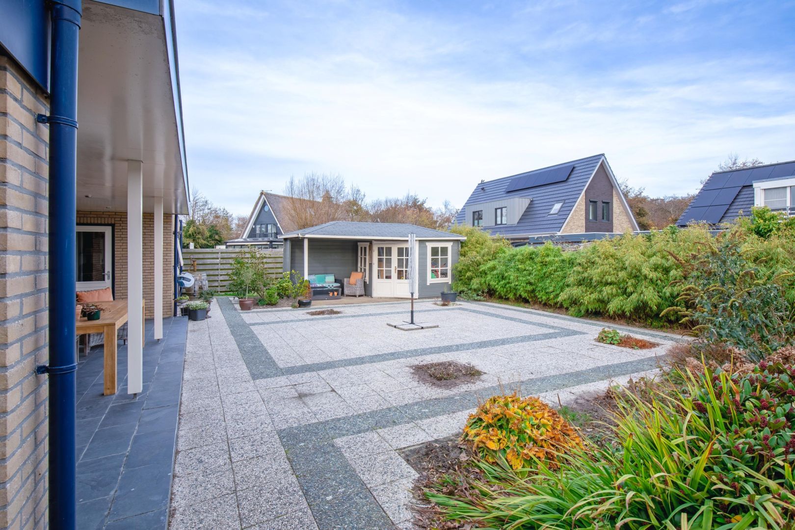 Voor en achter de woning is een verzorgd aangelegde tuin, voorzien van een ruim terras, bloemenperkjes en een tuinhuis met overkapping waar u het hele jaar door beschut buiten kunt zitten. De ruime inpandige garage beschikt zowel aan de voor- als achterzijde over garagedeuren.