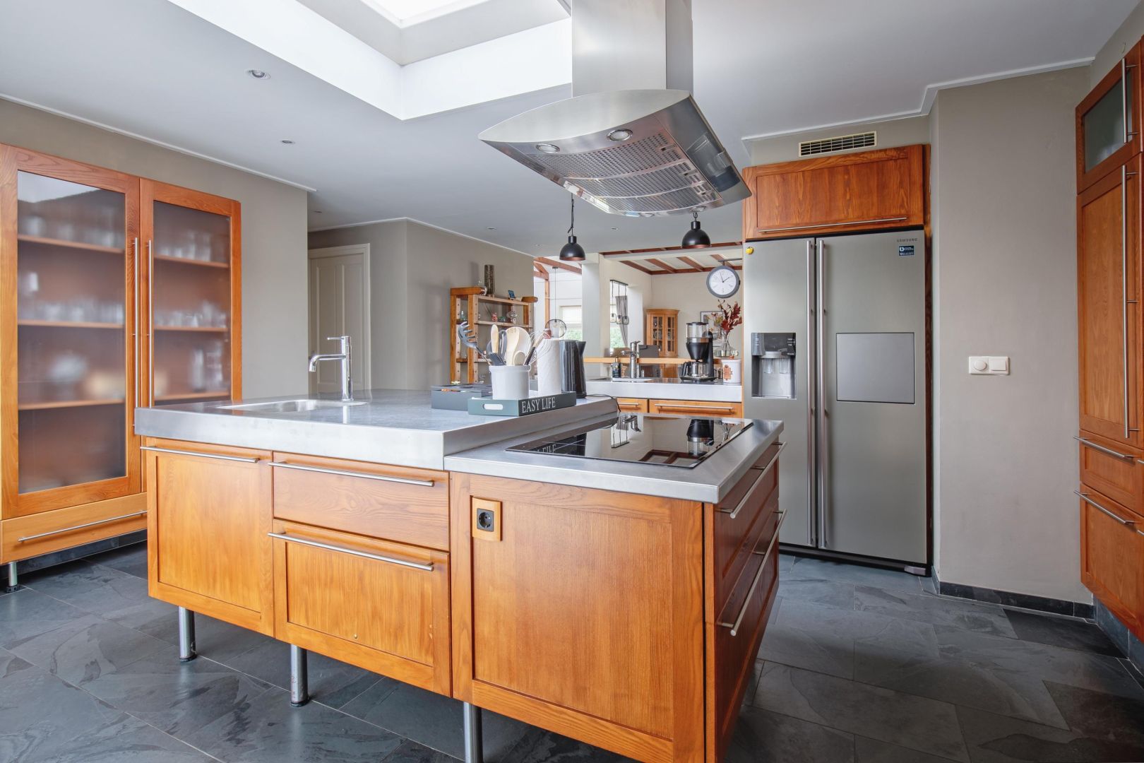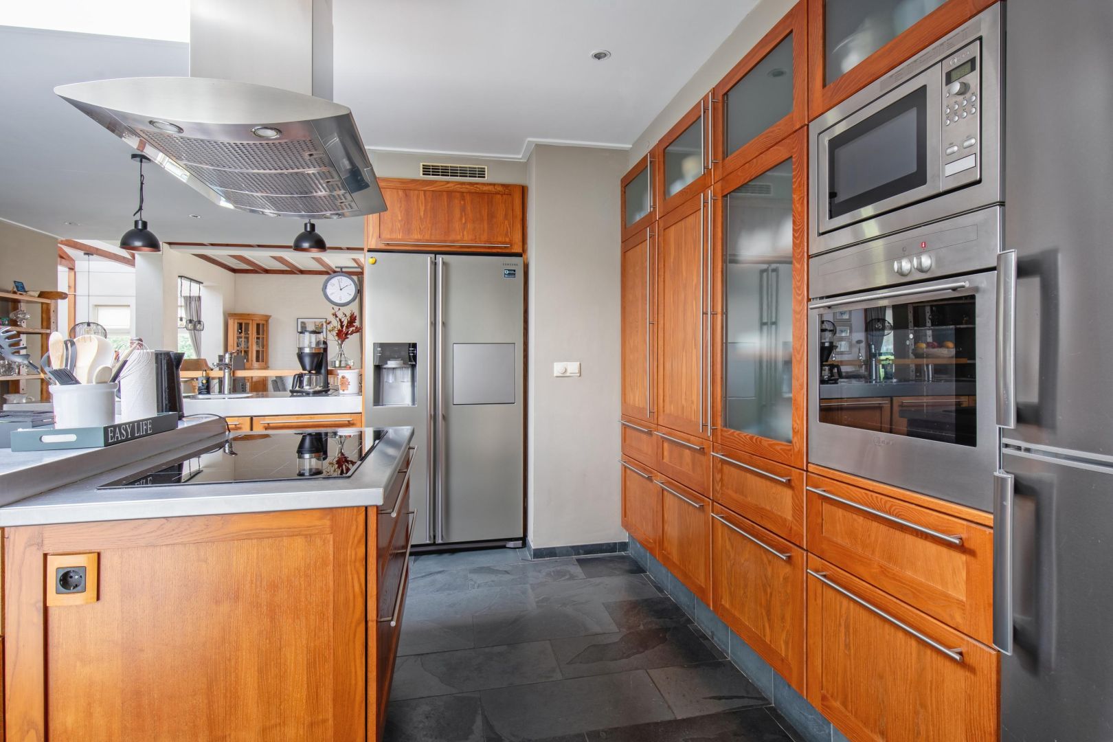 De moderne, verrassend ruime keuken is een echte blikvanger en voorzien van een kookeiland. In de keuken treft u een dubbele spoelbak, een inductiekookplaat, heteluchtoven, magnetron, vaatwasser en een Amerikaanse koelkast. Een schuifpui geeft toegang tot de tuin.