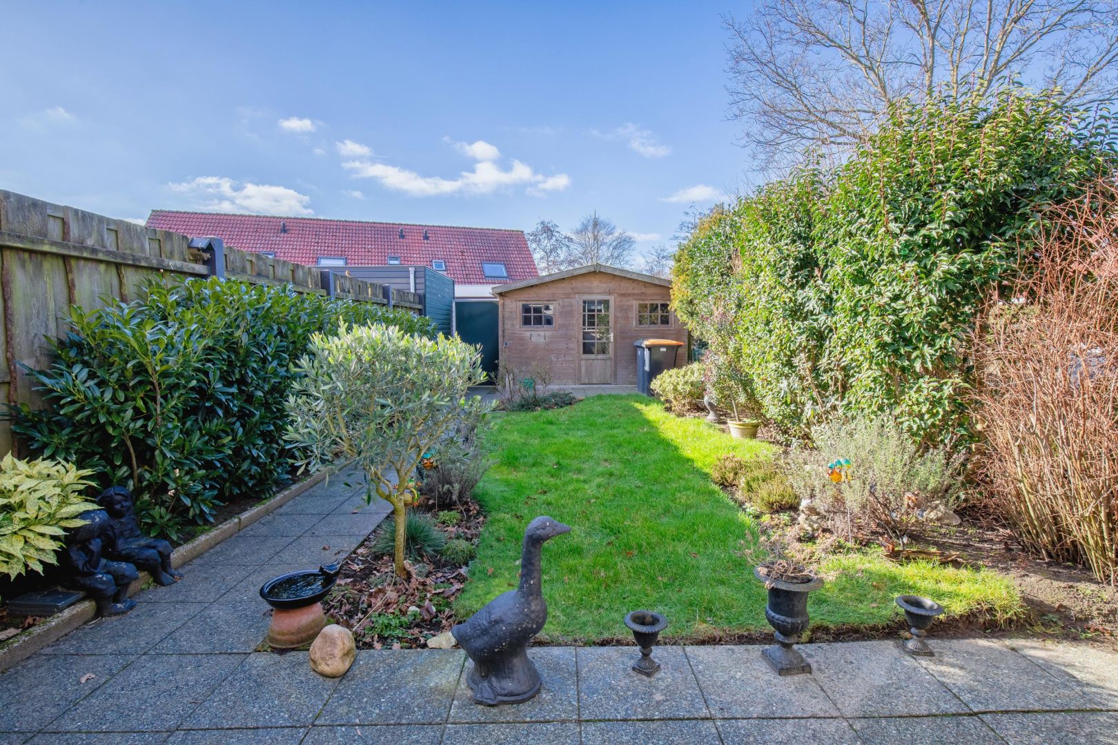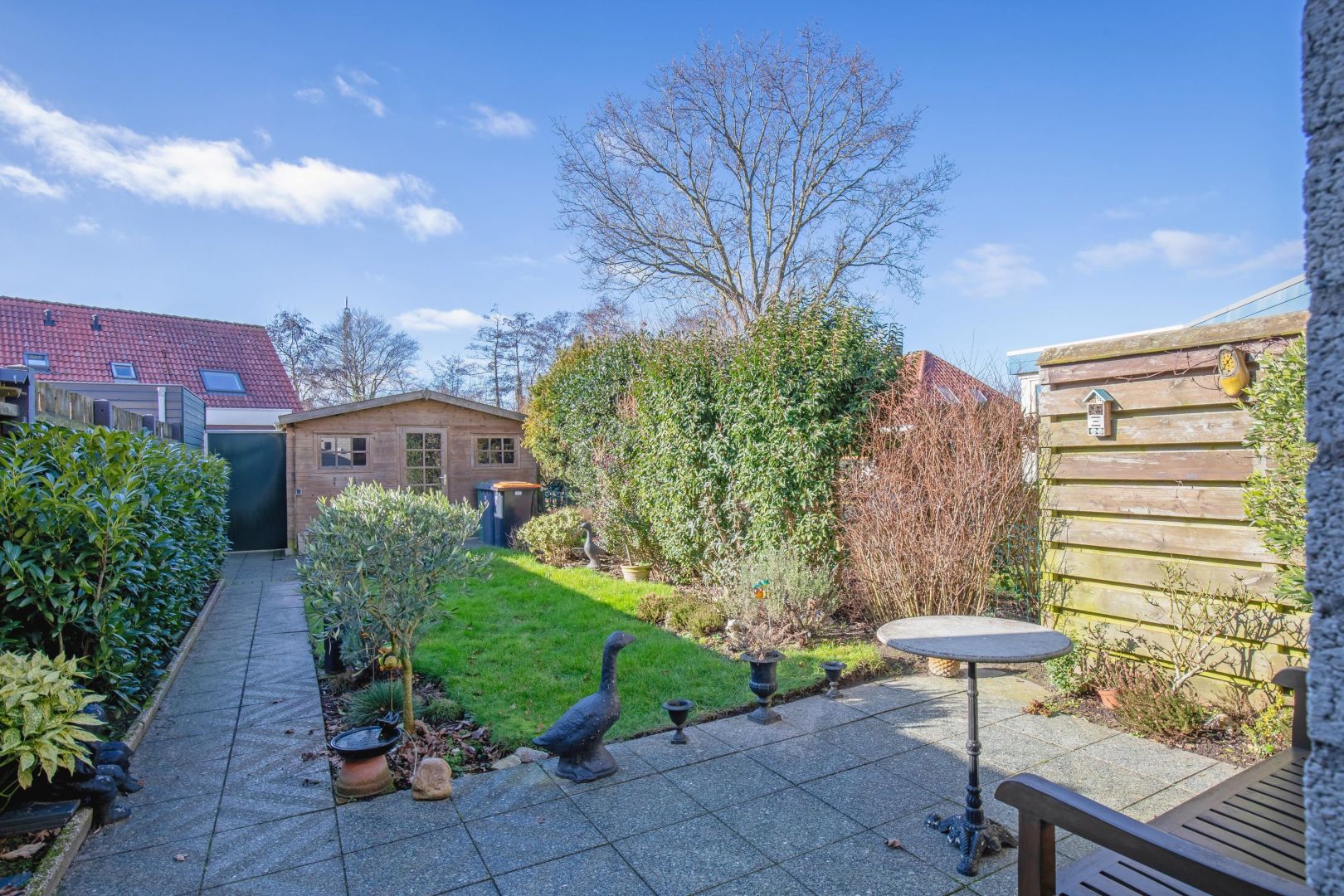De nette achtertuin heeft een prettige zonligging op het zuidwesten en er is een achterom. Voor uw (tuin)gereedschap is er een houten berging (ca. 11 m2) aanwezig.