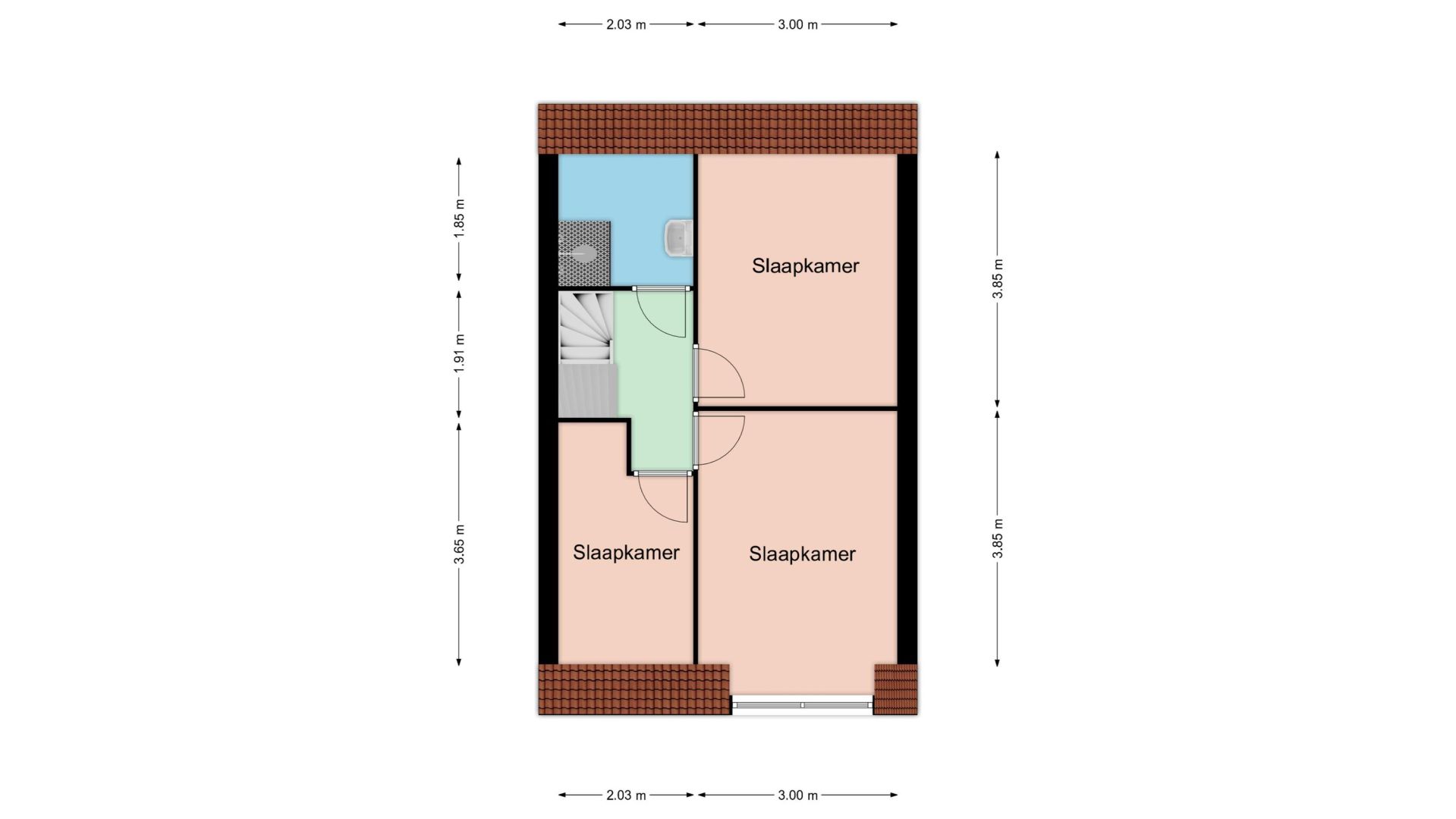 De toiletruimte is in de tussenhal en hier is ook de trap naar de eerste verdieping, waar u drie slaapkamers en een badkamer aantreft. De ruime 2-persoons slaapkamer met dakkapel is aan de voorzijde. De tweede slaapkamer is aan de achterzijde en de derde, kleinere slaapkamer bevindt zich aan de voorzijde.