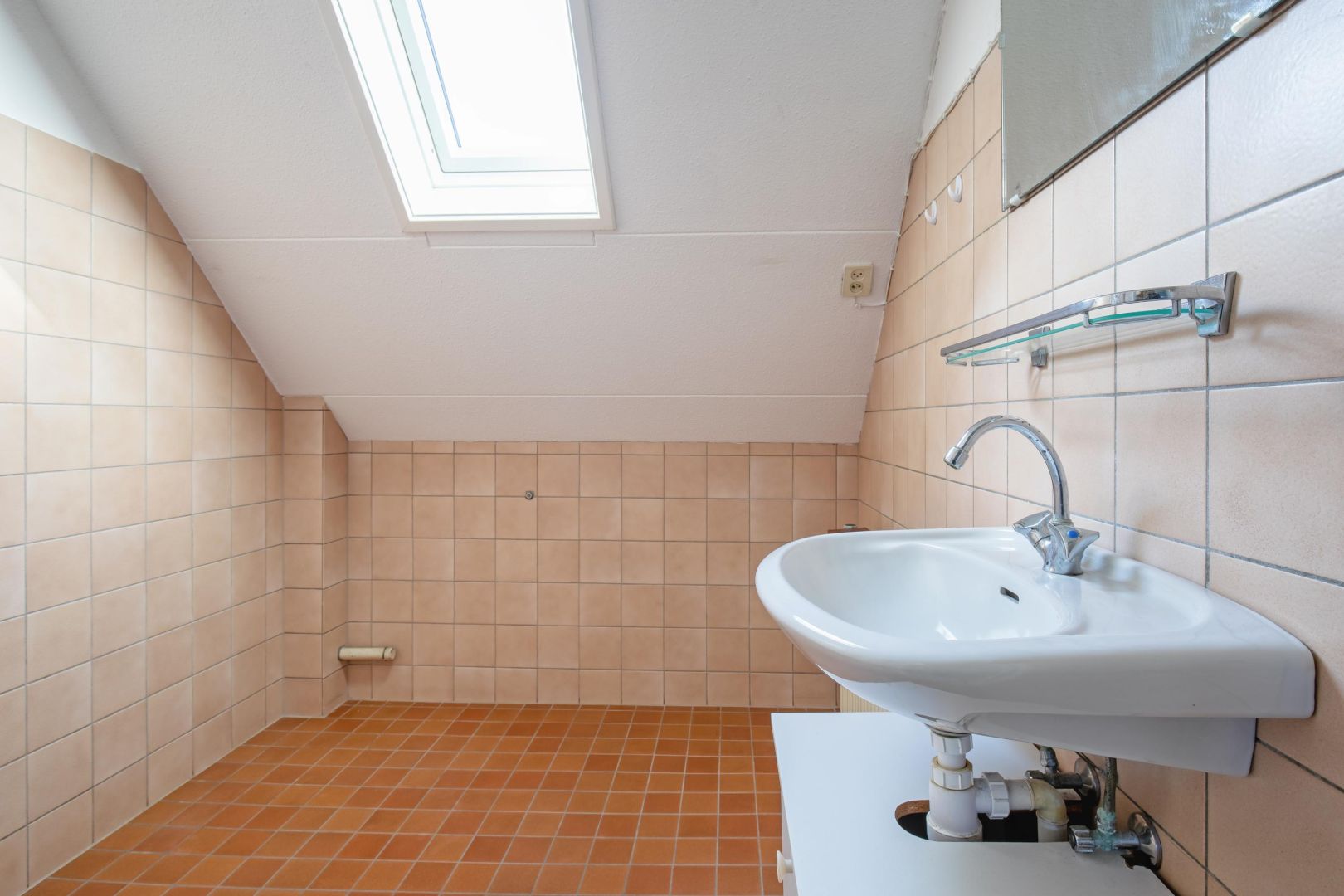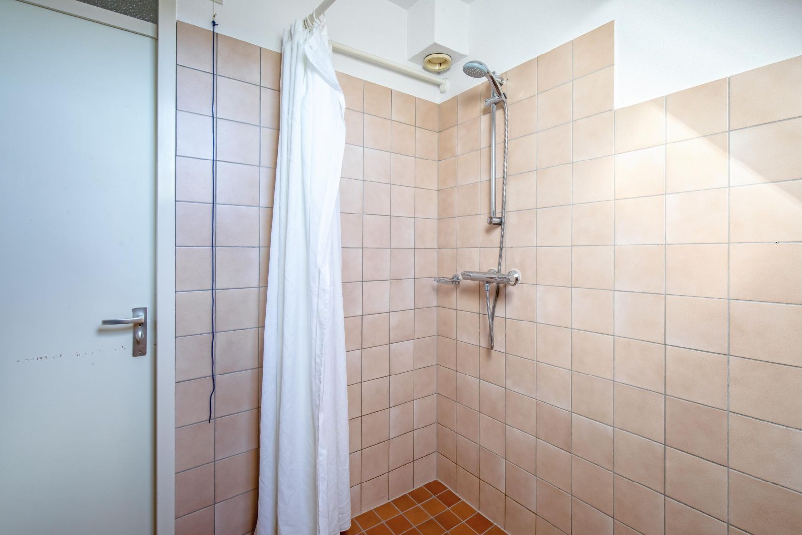 De badkamer is eenvoudig uitgevoerd met douche en wastafel.