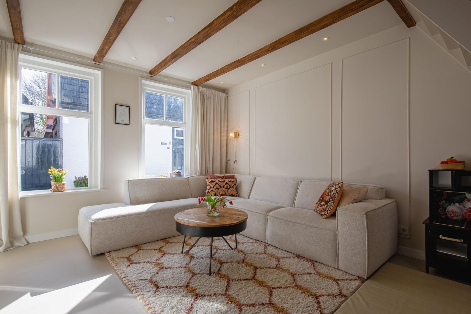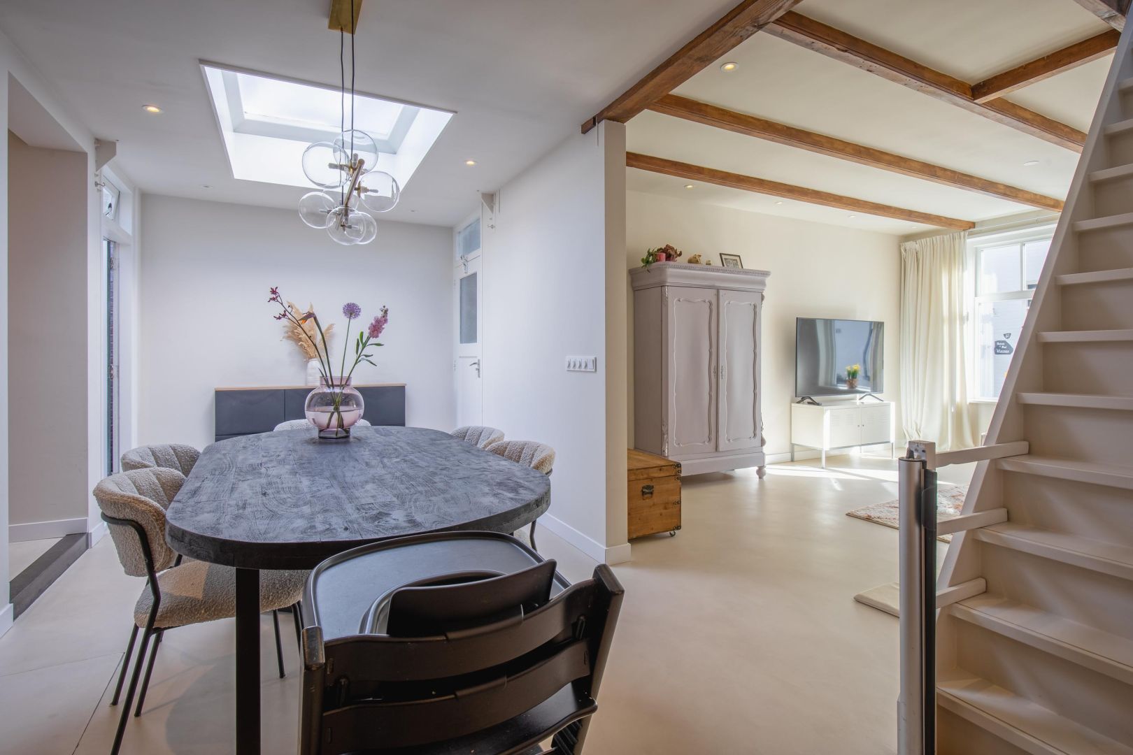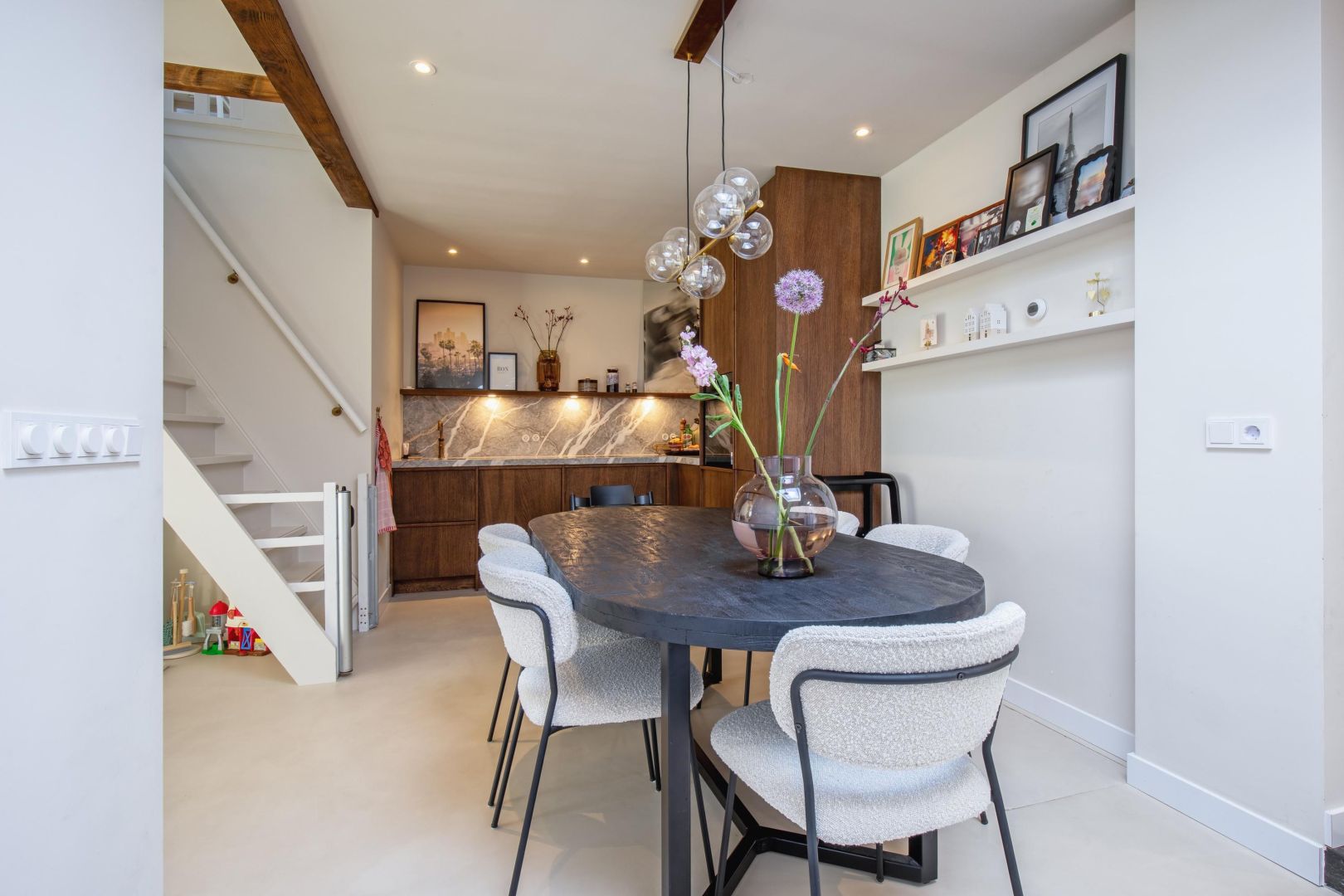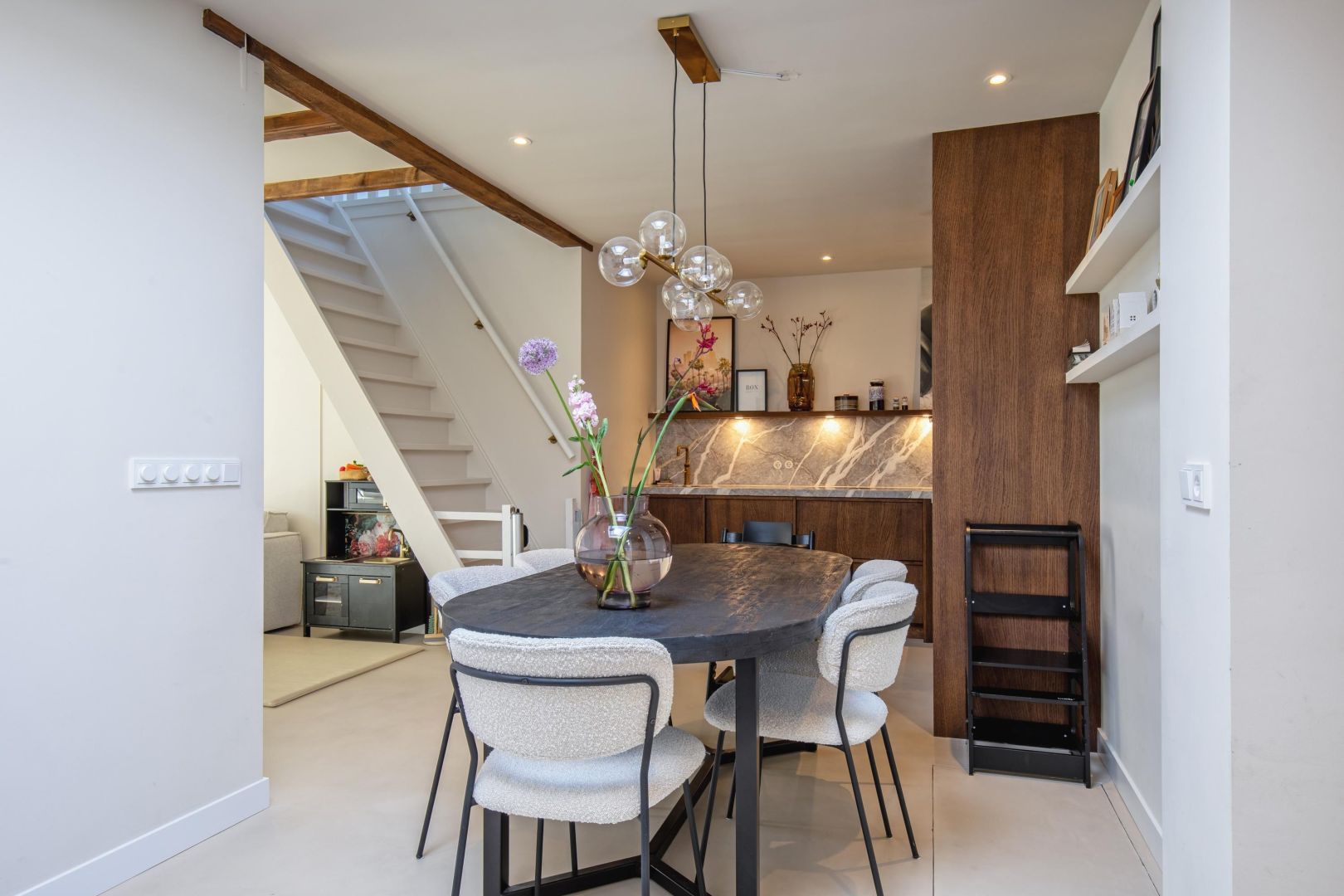 De straatgerichte woonkamer is sfeervol en v.v. een microcement vloer met vloerverwarming. Aansluitend de woonkeuken v.v. lichtkoepel en luik naar de gewelfde kelder. De moderne keuken is compleet en uitgerust met een koel-vriescombinatie, Bora kookplaat (inductie), combi-oven, afwasmachine en Quooker, sfeervol afgewerkt met een werkblad van marmer.