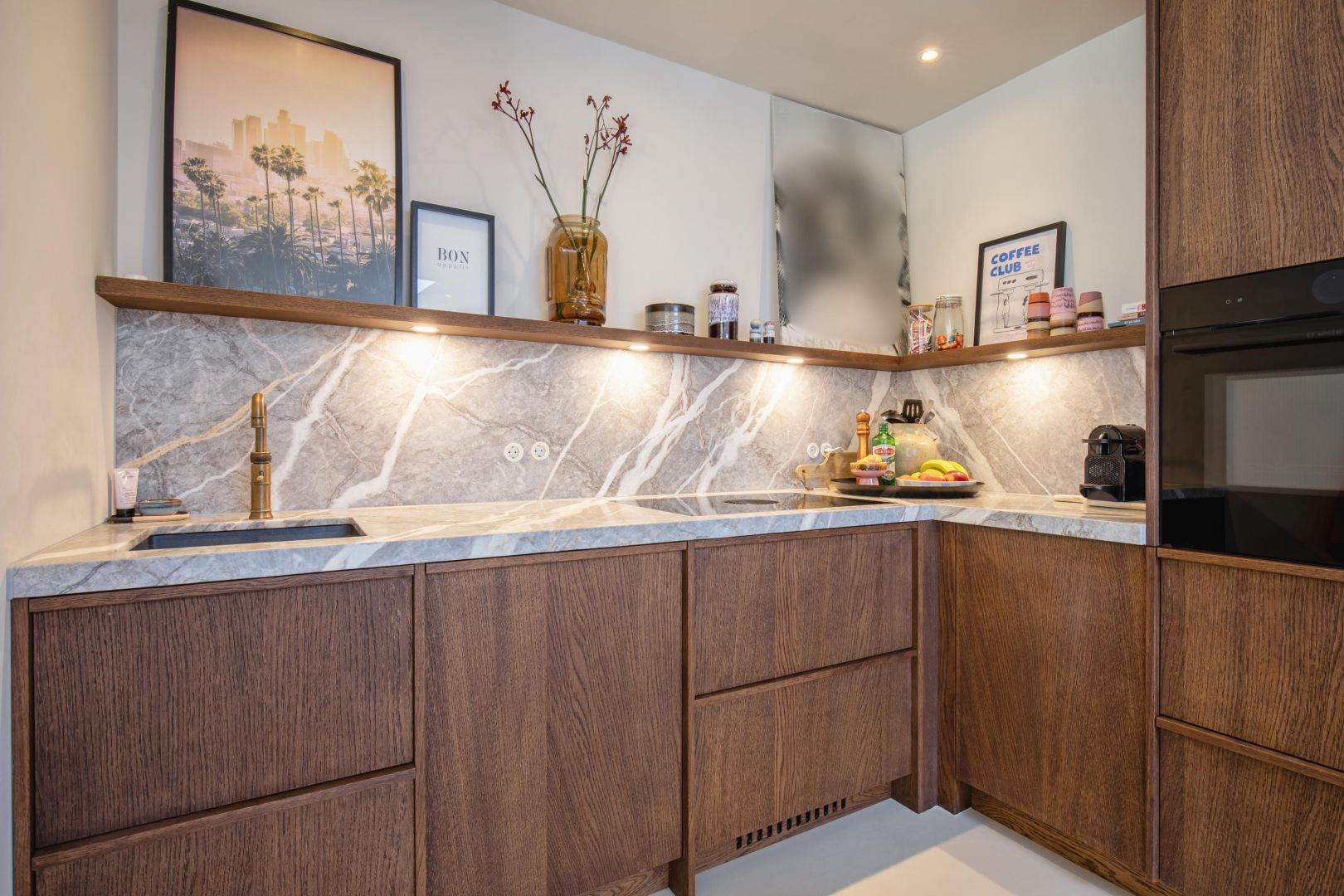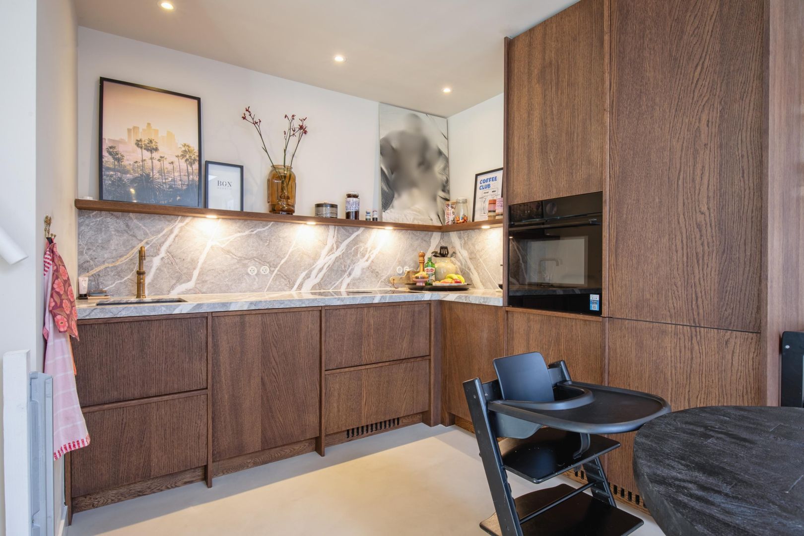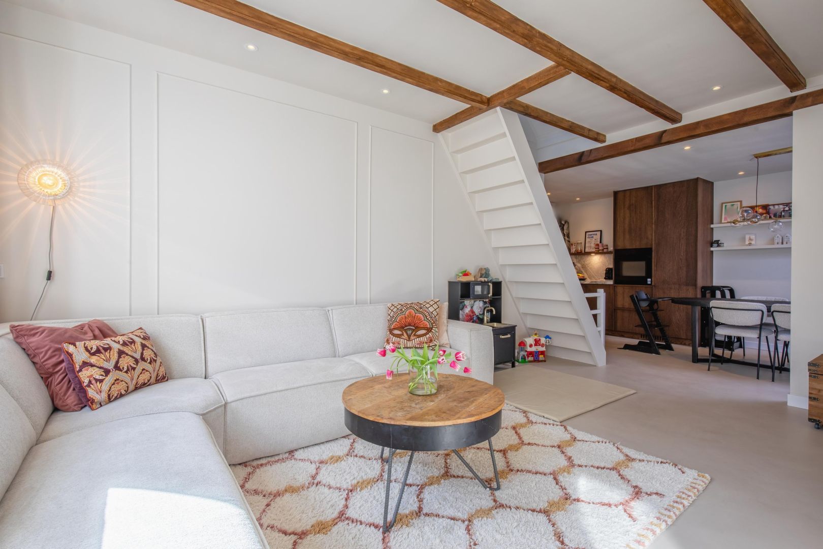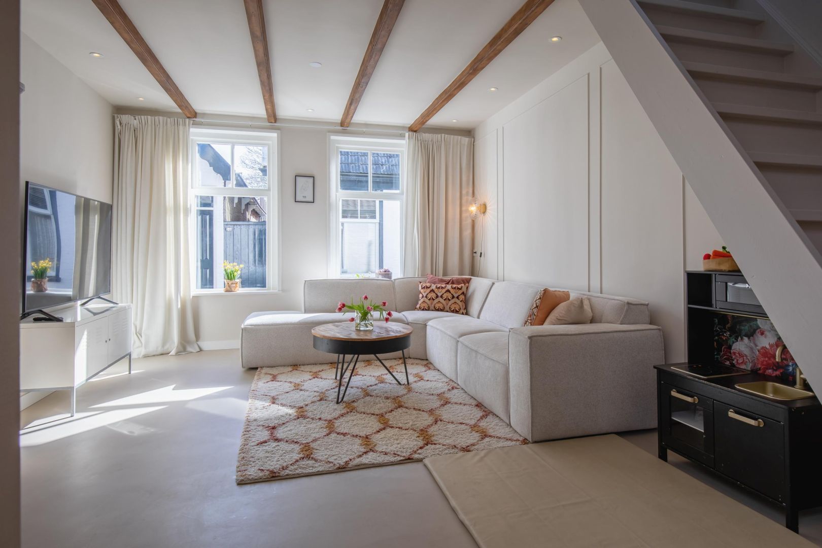 De straatgerichte woonkamer is sfeervol en v.v. een microcement vloer met vloerverwarming. Aansluitend de woonkeuken v.v. lichtkoepel en luik naar de gewelfde kelder. De moderne keuken is compleet en uitgerust met een koel-vriescombinatie, Bora kookplaat (inductie), combi-oven, afwasmachine en Quooker, sfeervol afgewerkt met een werkblad van marmer.