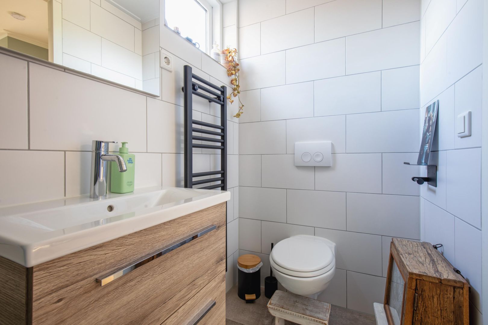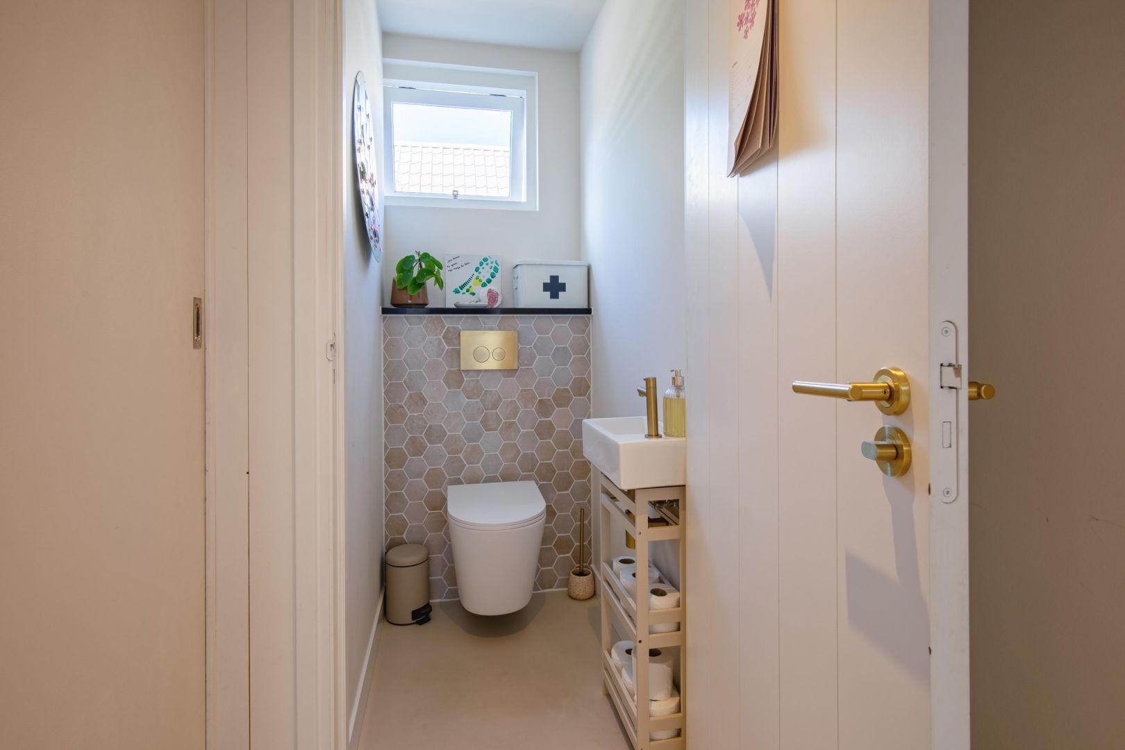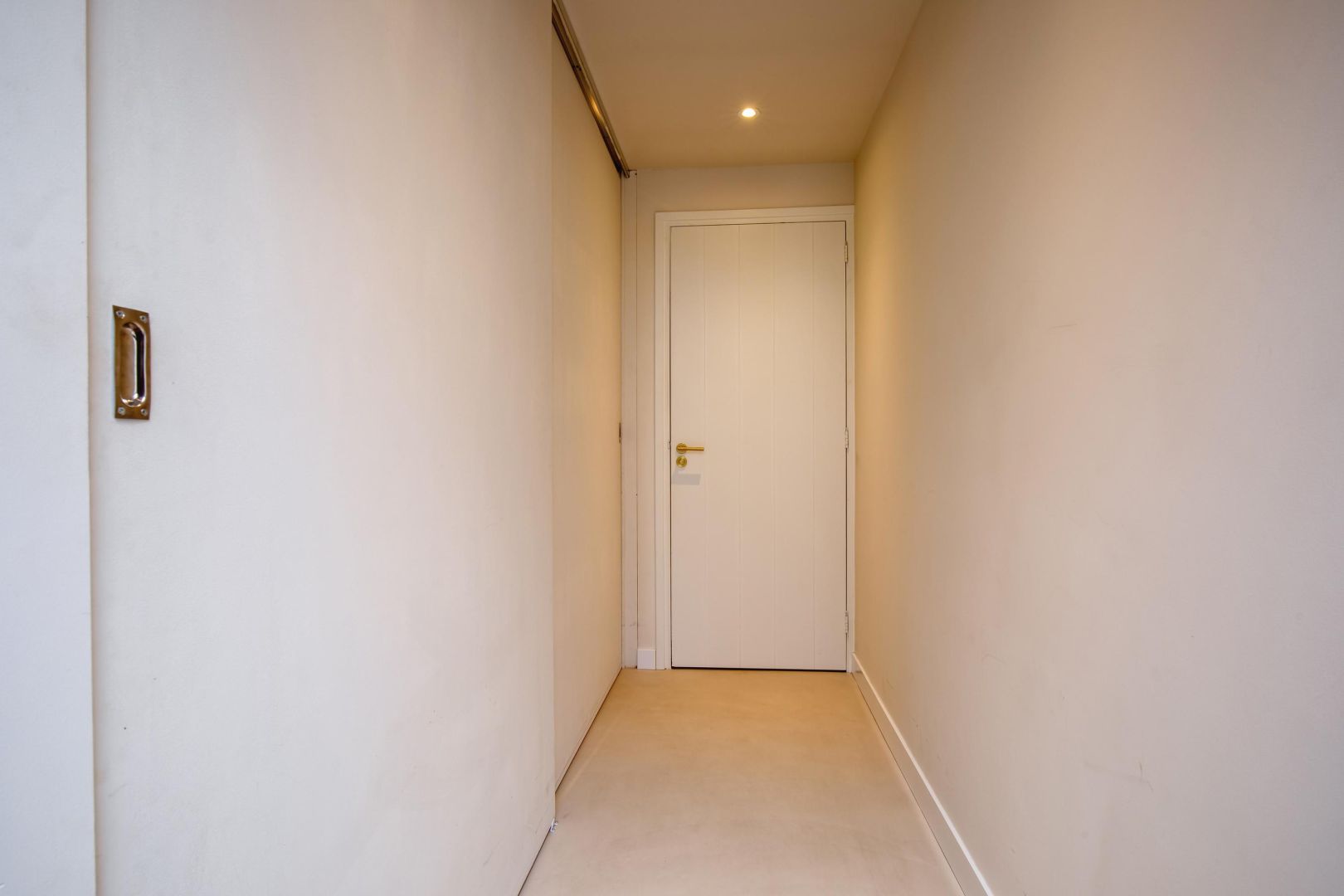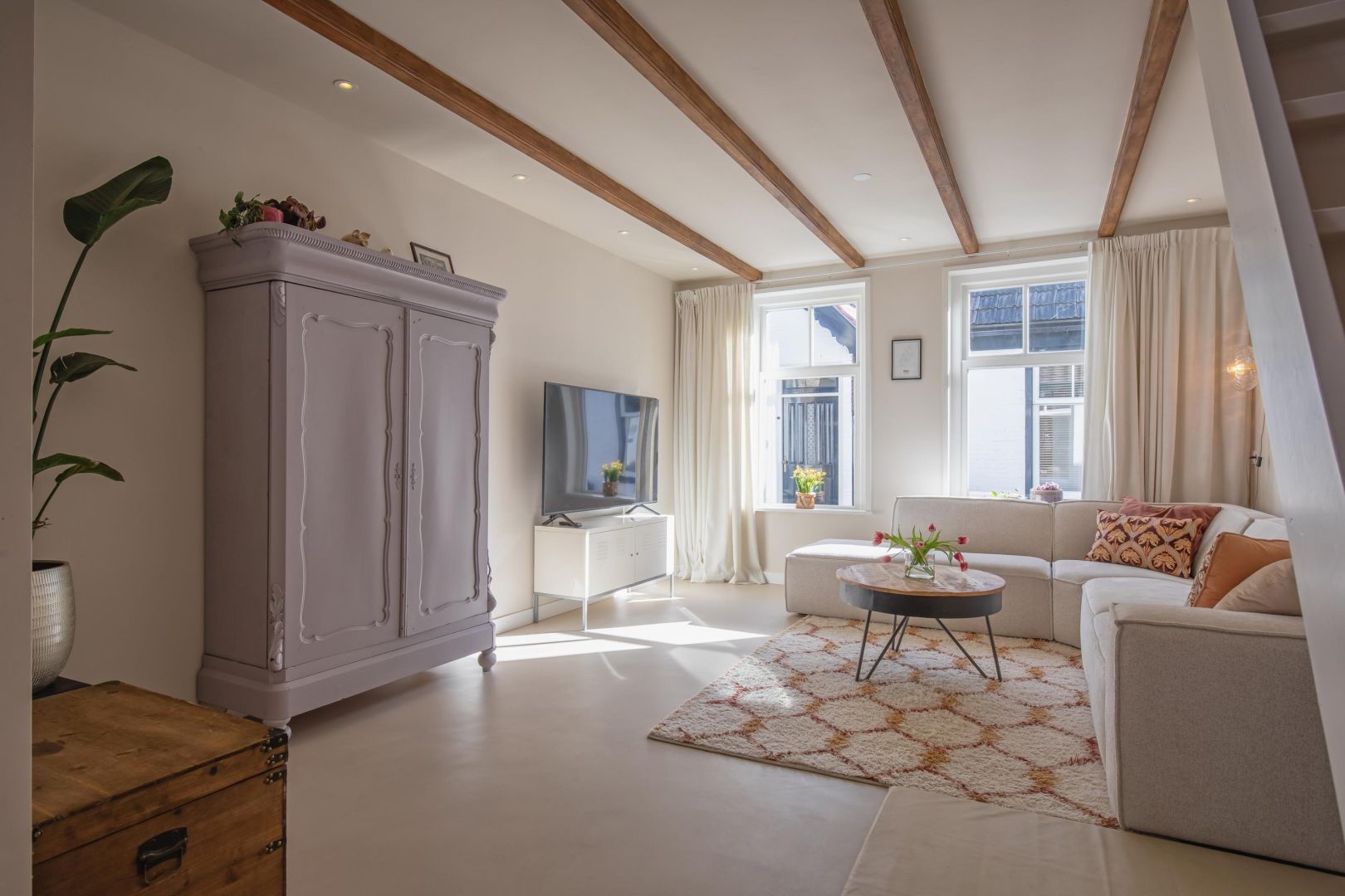 De straatgerichte woonkamer is sfeervol en v.v. een microcement vloer met vloerverwarming. Aansluitend de woonkeuken v.v. lichtkoepel en luik naar de gewelfde kelder. De moderne keuken is compleet en uitgerust met een koel-vriescombinatie, Bora kookplaat (inductie), combi-oven, afwasmachine en Quooker, sfeervol afgewerkt met een werkblad van marmer.