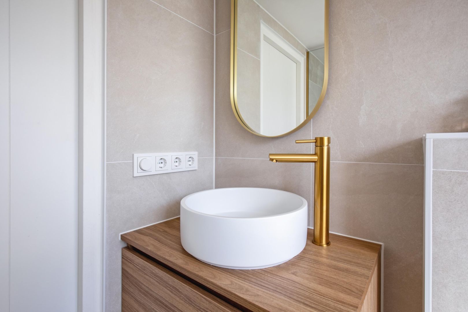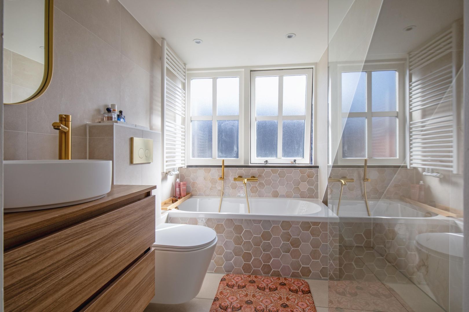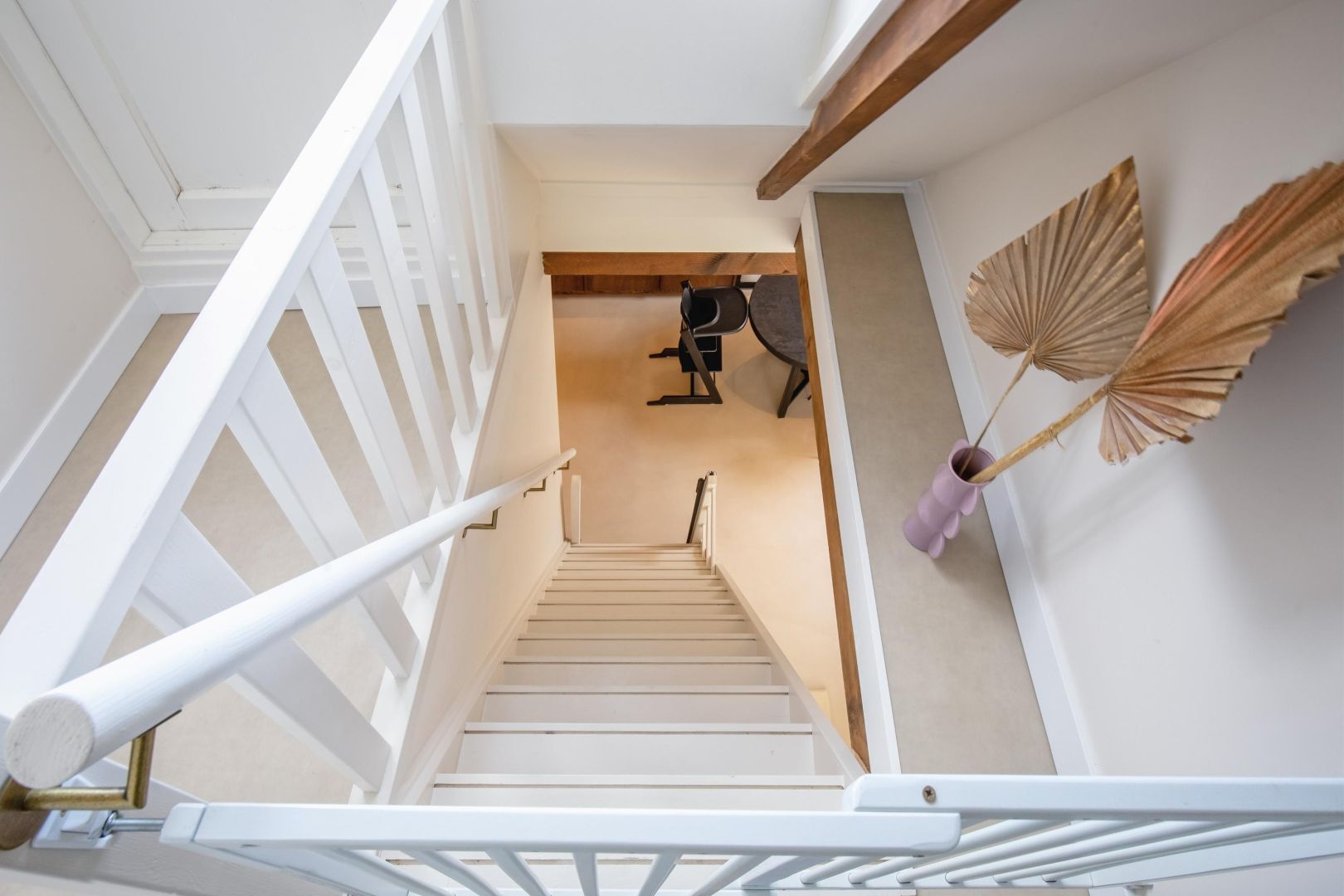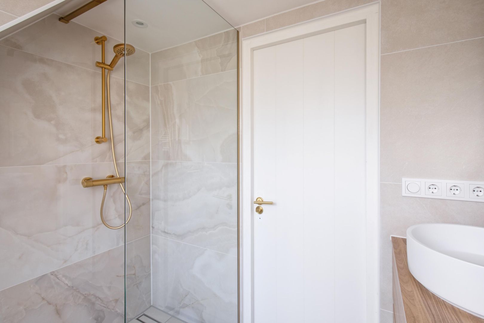 De straatgerichte woonkamer is sfeervol en v.v. een microcement vloer met vloerverwarming. Aansluitend de woonkeuken v.v. lichtkoepel en luik naar de gewelfde kelder. De moderne keuken is compleet en uitgerust met een koel-vriescombinatie, Bora kookplaat (inductie), combi-oven, afwasmachine en Quooker, sfeervol afgewerkt met een werkblad van marmer.