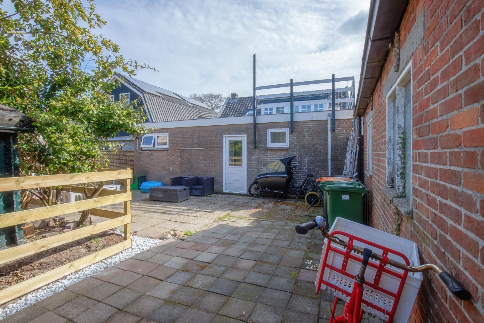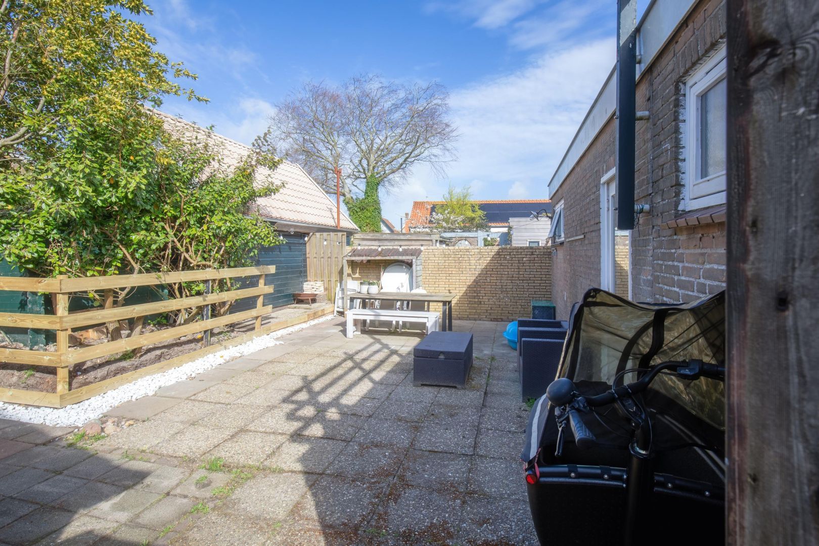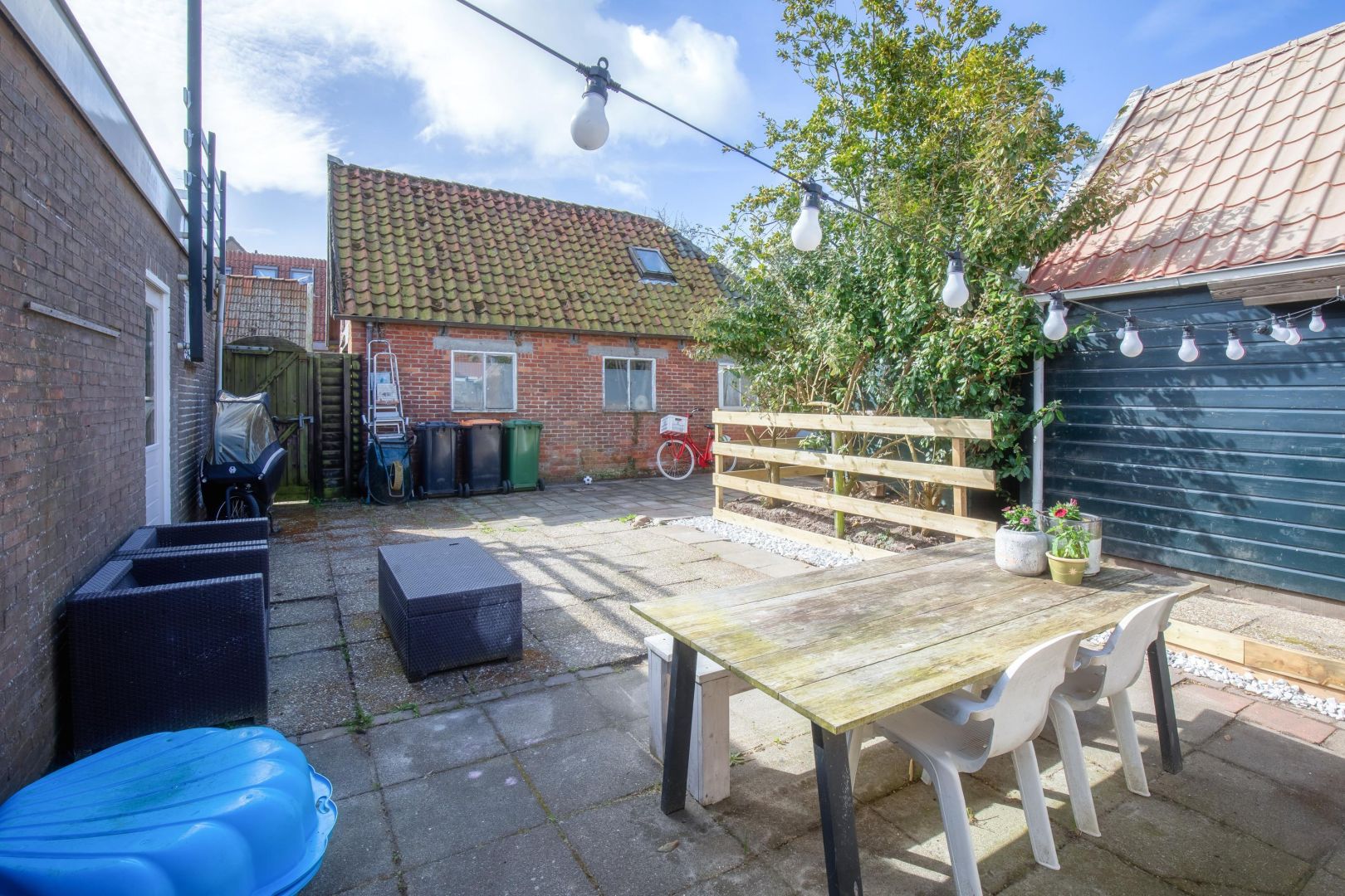 De besloten achtertuin is gezien de ligging in het centrum ruim te noemen en heeft zowel middag- als avondzon. Via het naastgelegen perceel is de tuin achterom te bereiken.