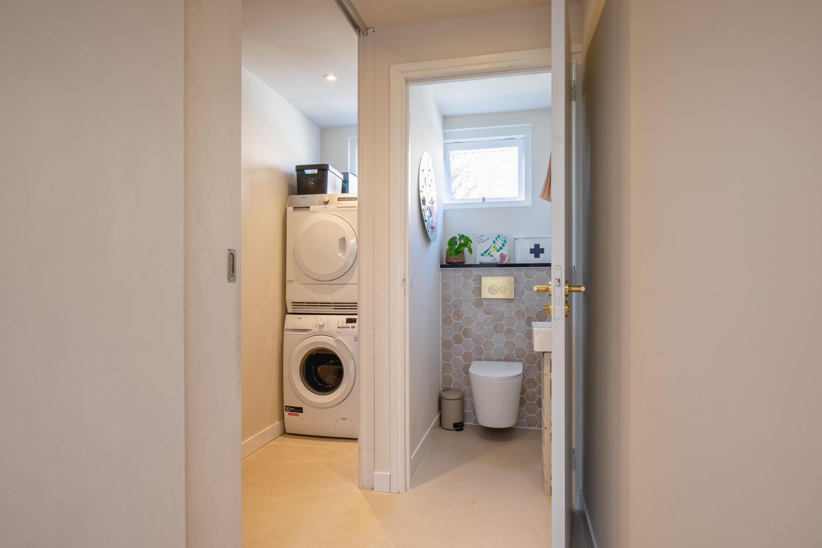 De bijkeuken is v.v. een ruime bergkast, toilet en wasruimte en geeft toegang tot de tuin.