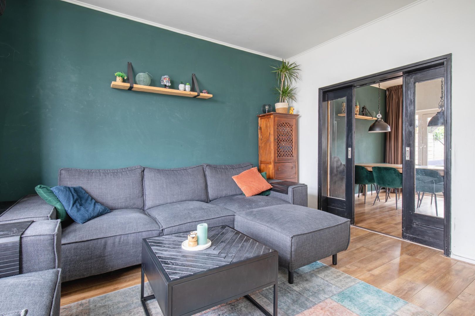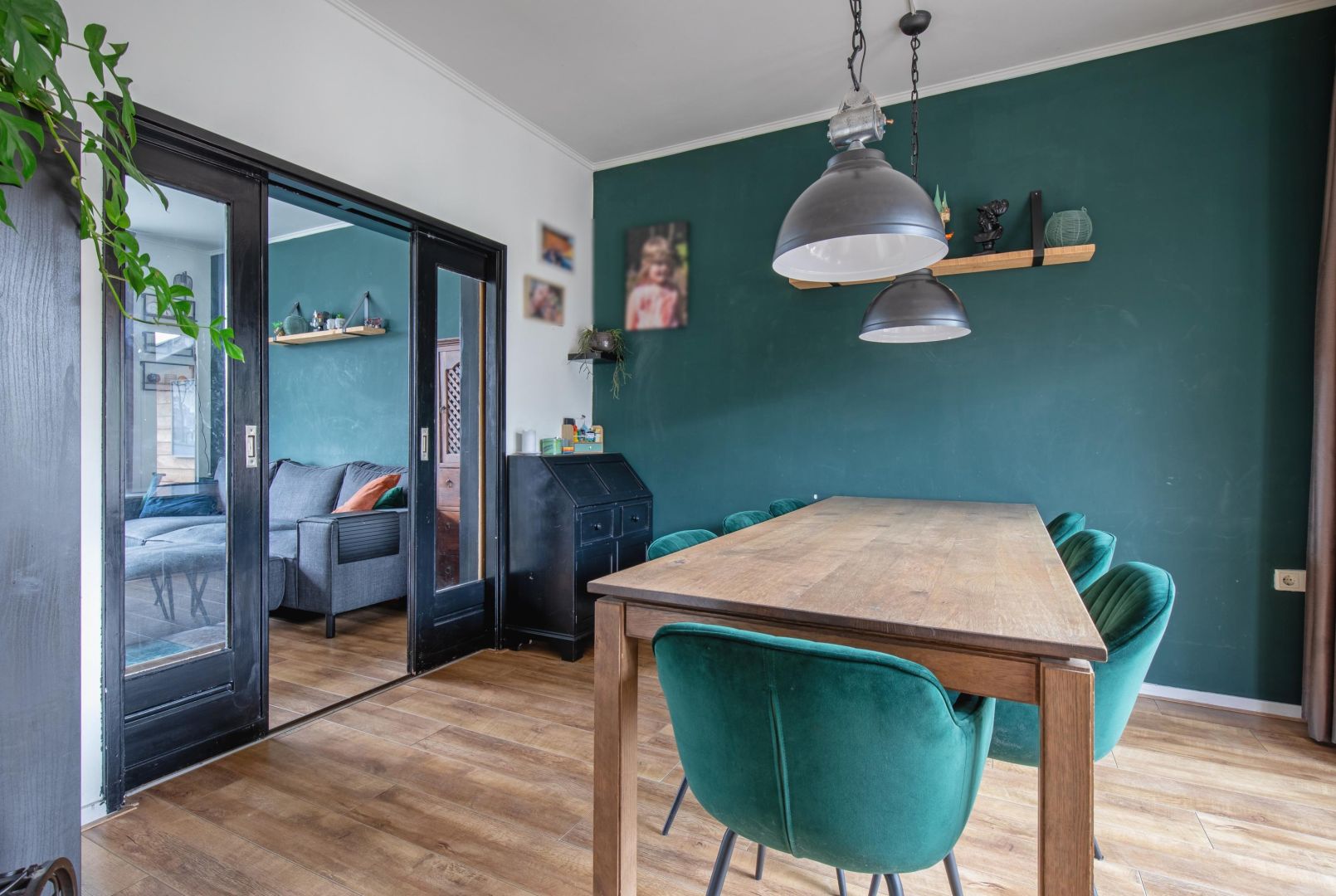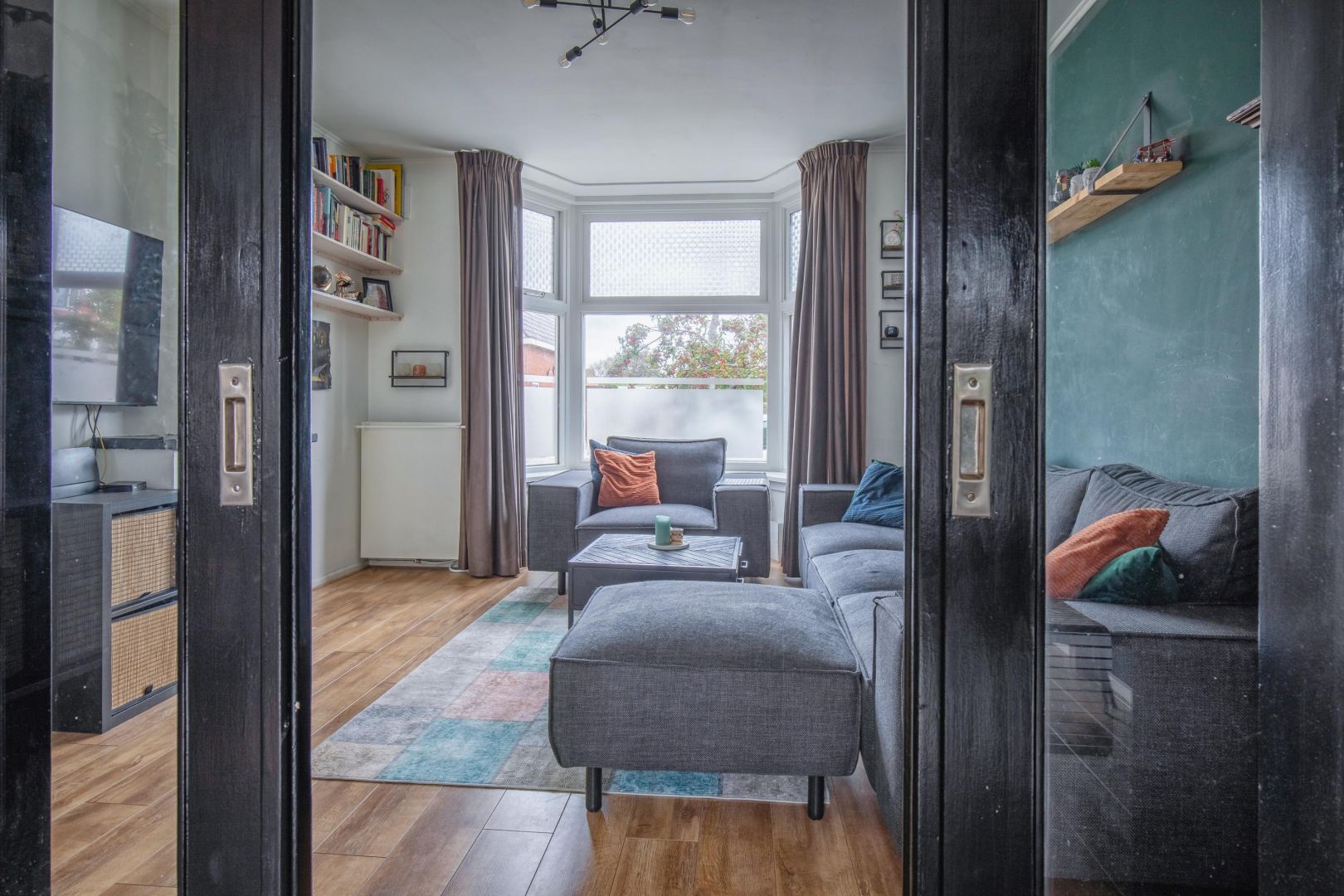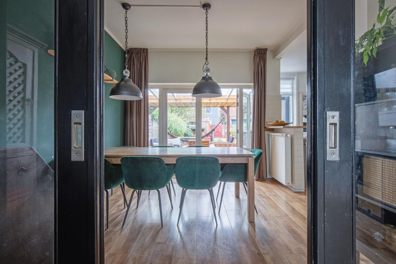 Indeling: entree in hal (voorzien van een stijlvolle granitovloer!) met toegang tot de kamer-en-suite woonkamer, keuken, toiletruimte (2020) en trap naar de bovenverdieping. De aan de voorzijde gesitueerde woonkamer heeft een erker, kenmerkend voor deze bouwperiode. Middels schuifdeuren is deze kamer-en-suite af te sluiten van de eethoek. De eethoek is gezellig ingericht en er zijn openslaande deuren naar de tuin.