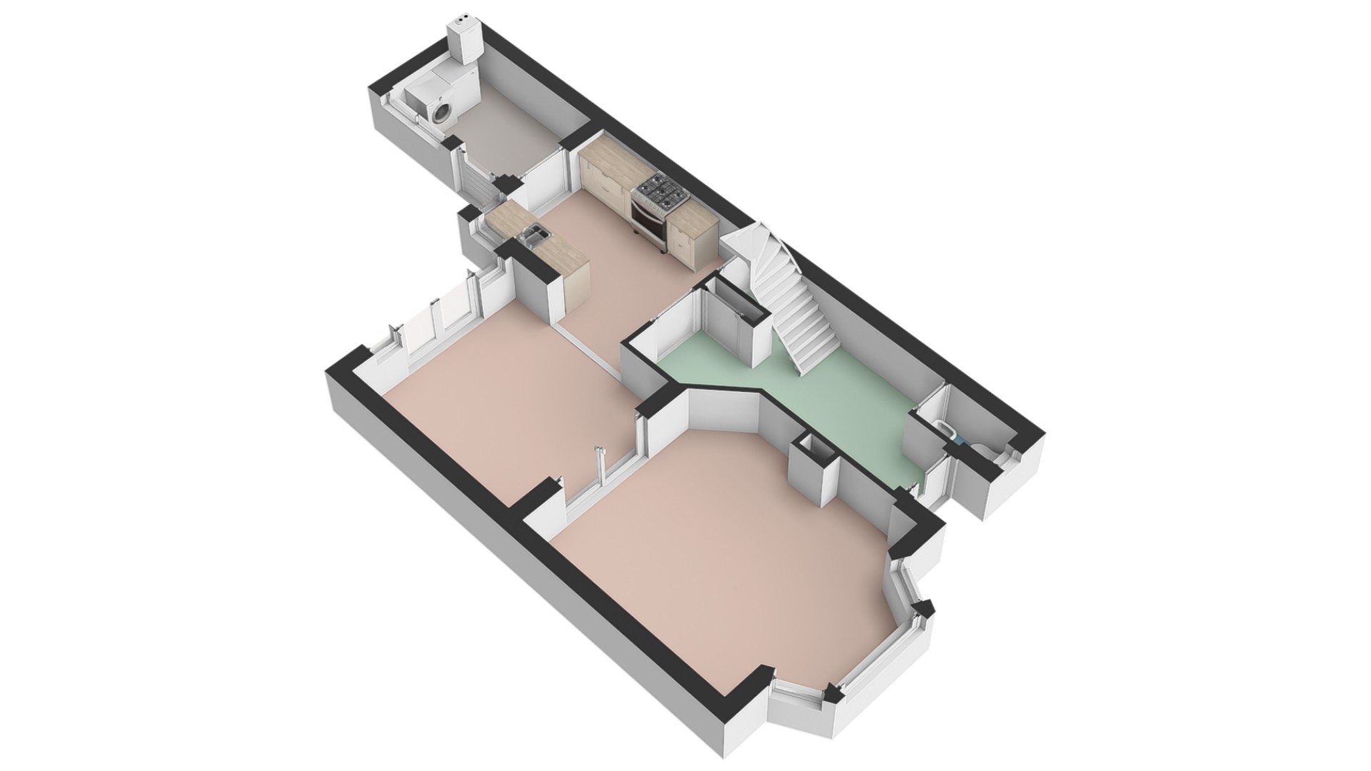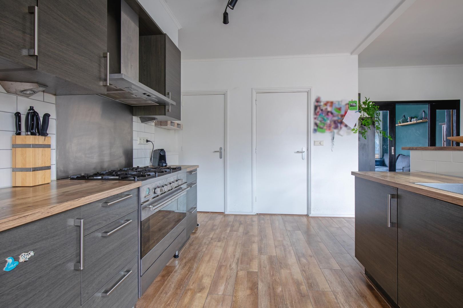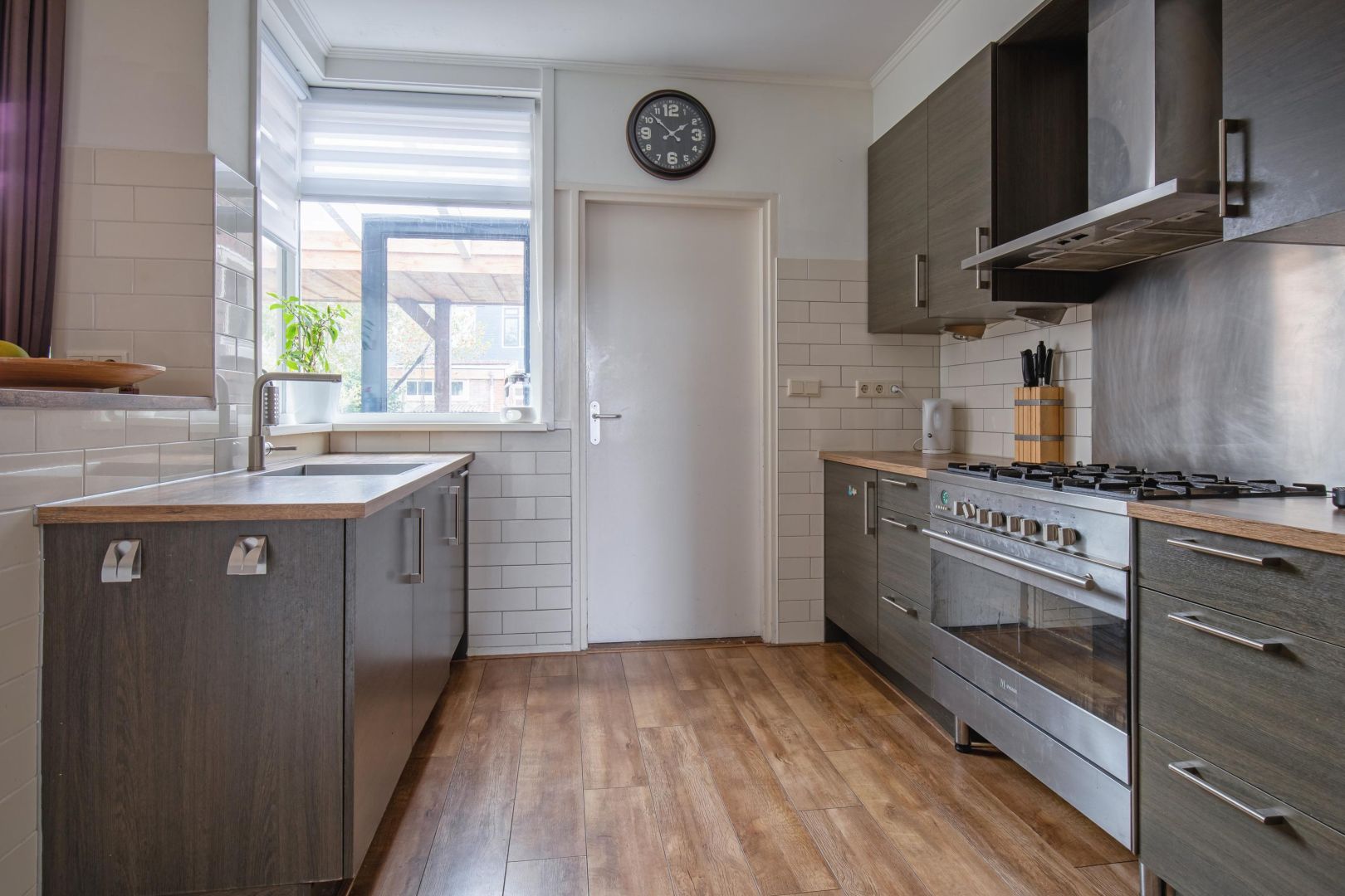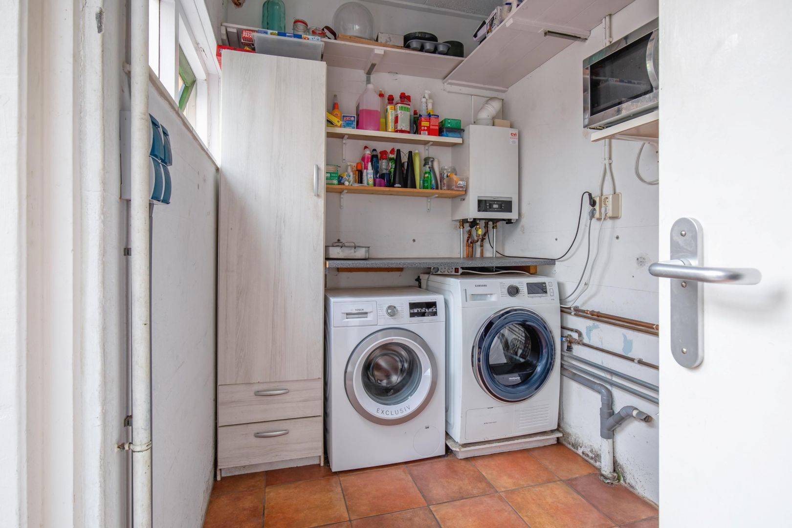 De keuken is voorzien van een spoelbak, gasfornuis met 6-pits gaskookplaat en oven, afzuigkap, koelkast en vaatwasser. In de bijkeuken is de opstelling van de cv-ketel evenals de aansluitingen voor een wasmachine/droger en een deur naar de tuin.