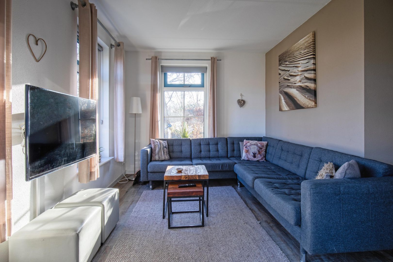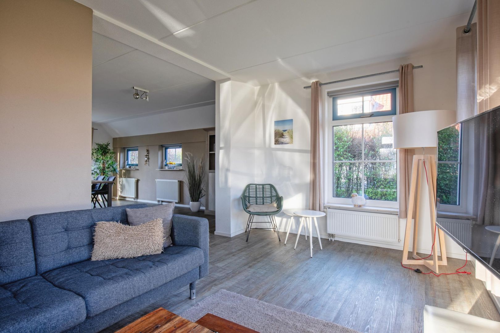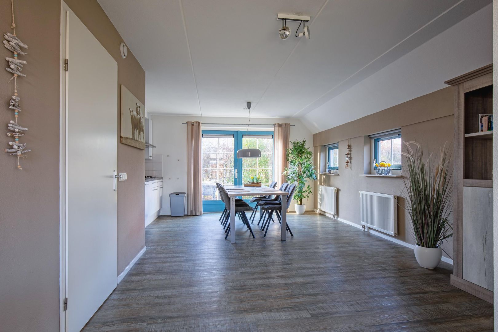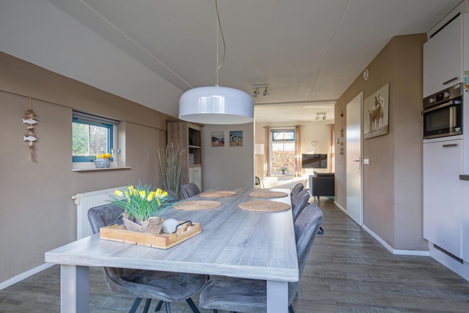 Vanuit de comfortabele woonkamer is er zicht op de naastgelegen weilanden. De woonkamer is voorzien van een pvc-vloer en staat in open verbinding met de woonkeuken, waardoor een gezellige en lichte leefruimte ontstaat.