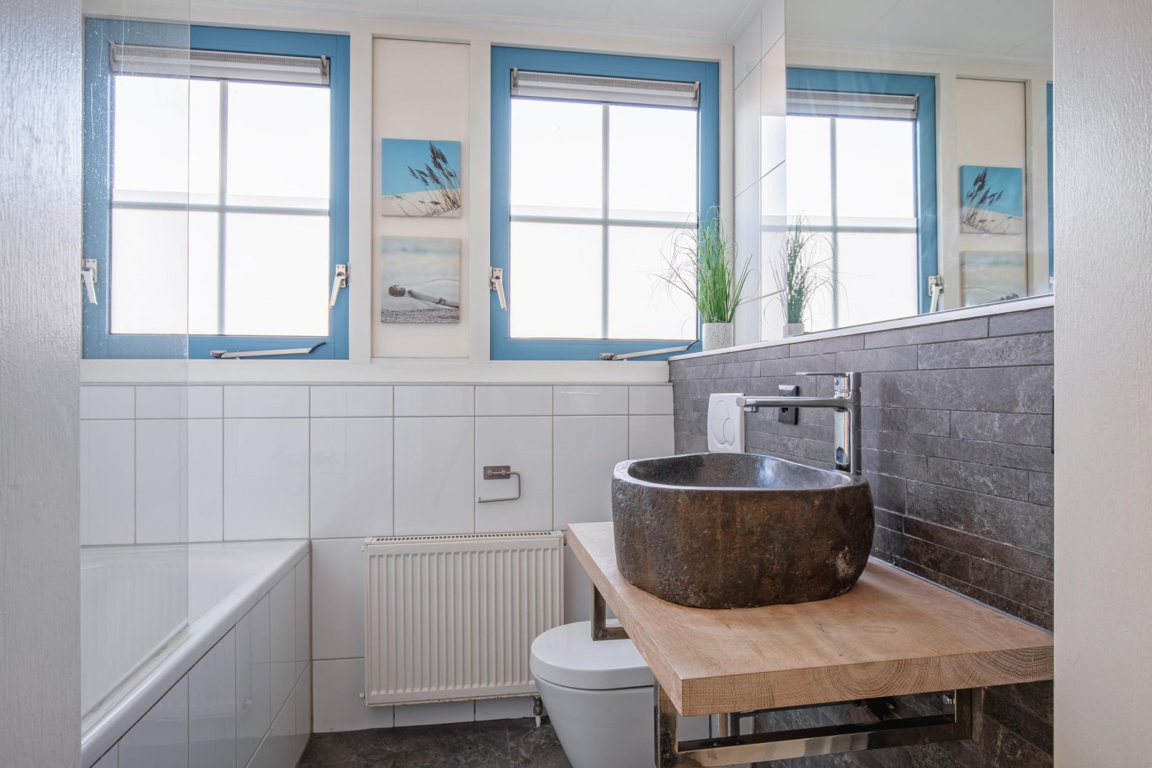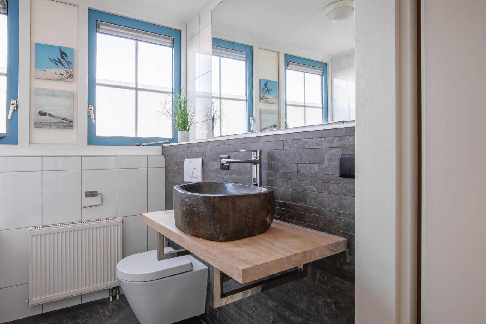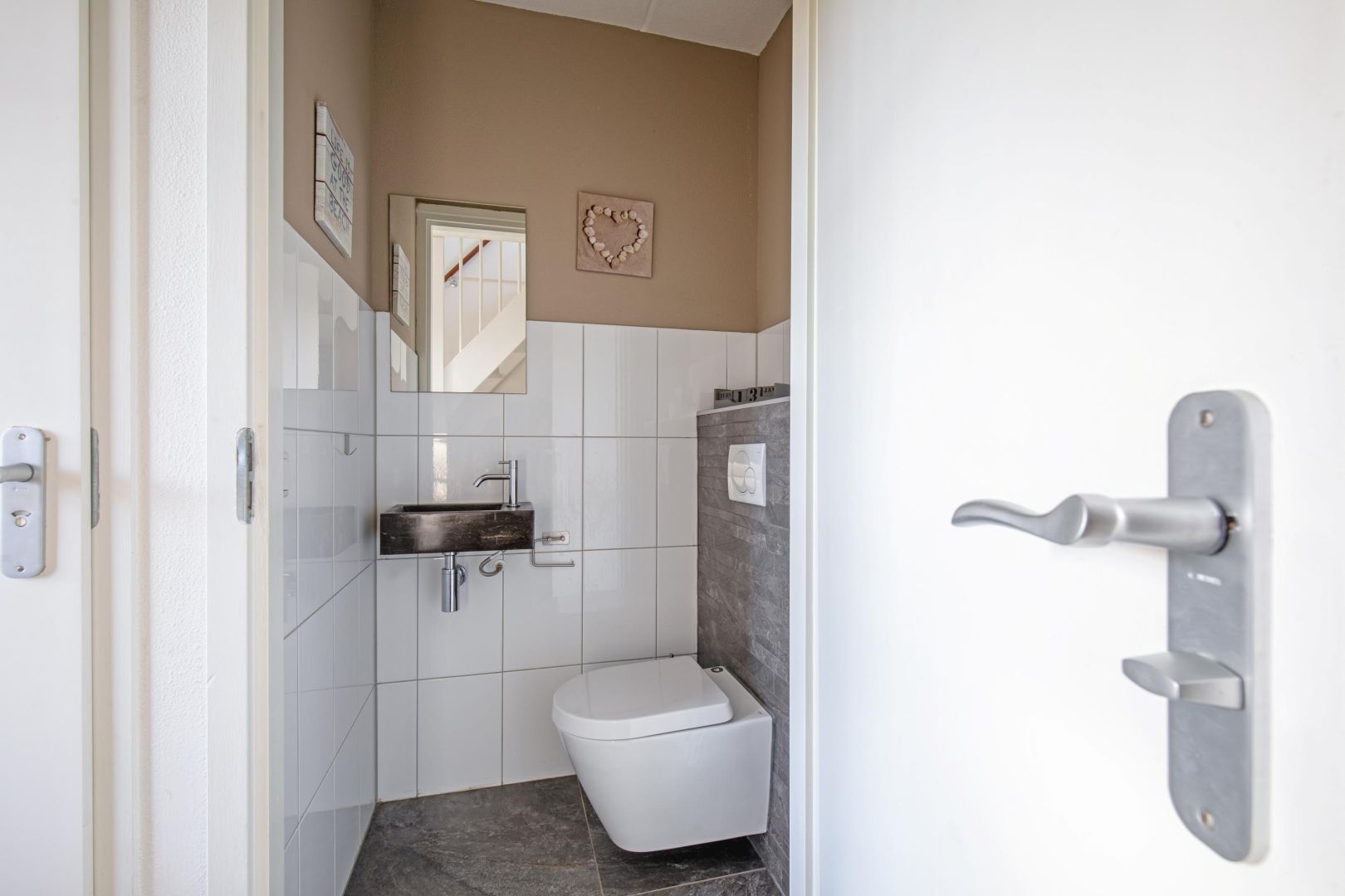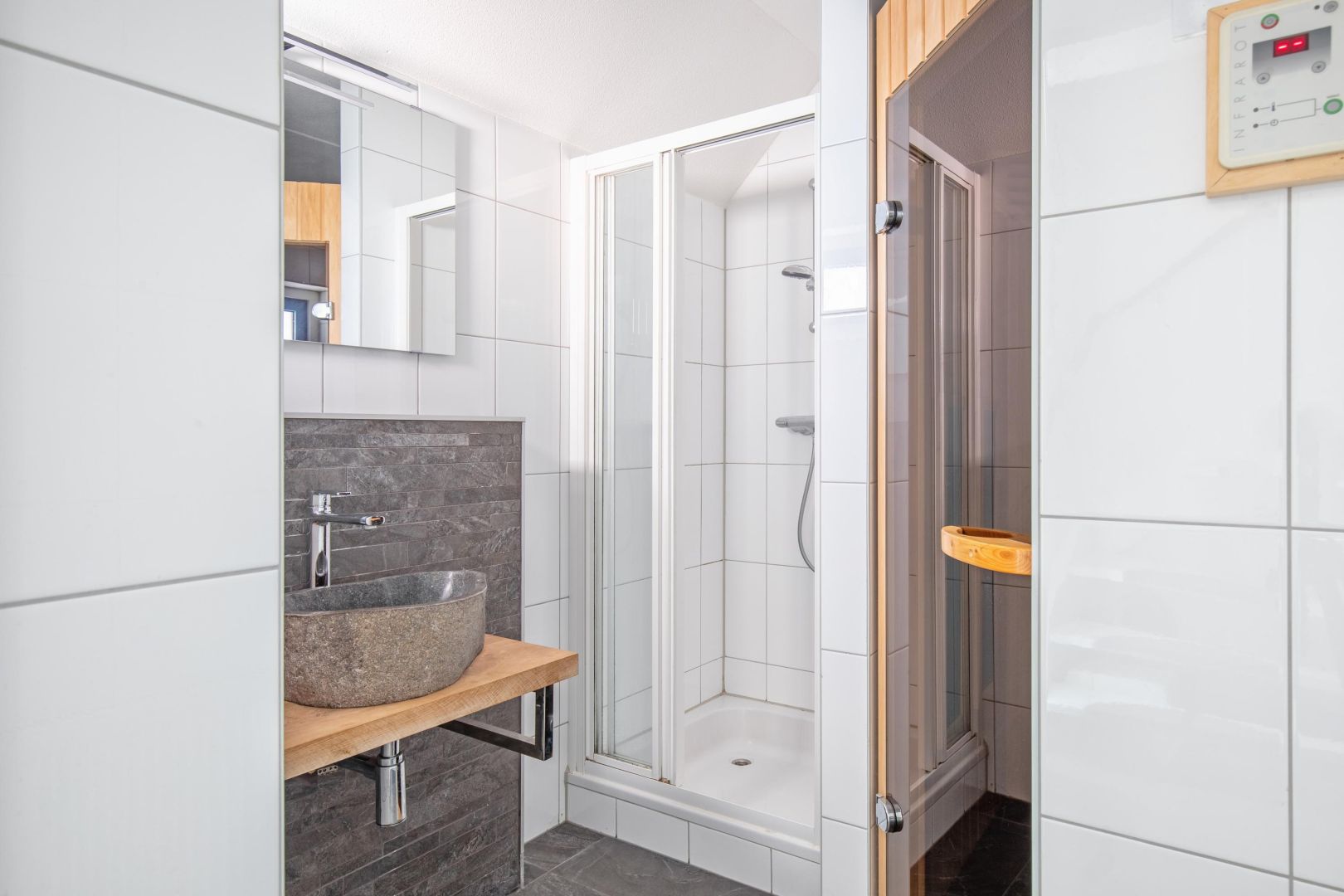 Op de begane grond bevindt zich tevens een gemoderniseerde badkamer (2024) met douche, sauna en wastafel, ideaal voor wie comfort en ontspanning hoog in het vaandel heeft staan. De toiletruimte (2024) is voorzien van een vrijdragend toilet en fonteintje.